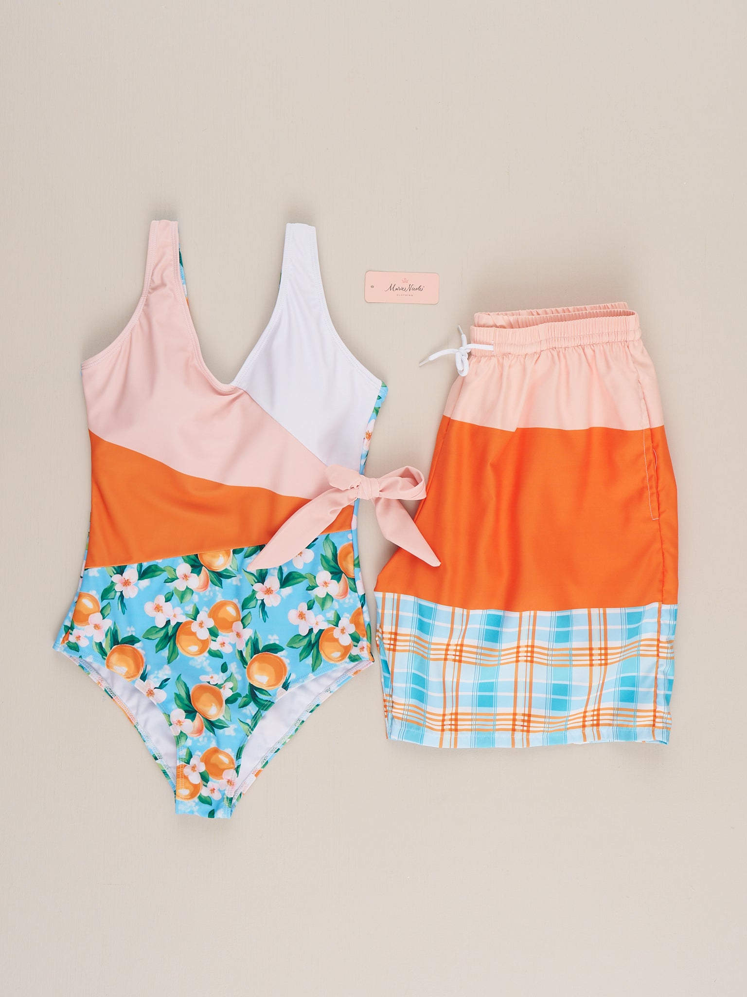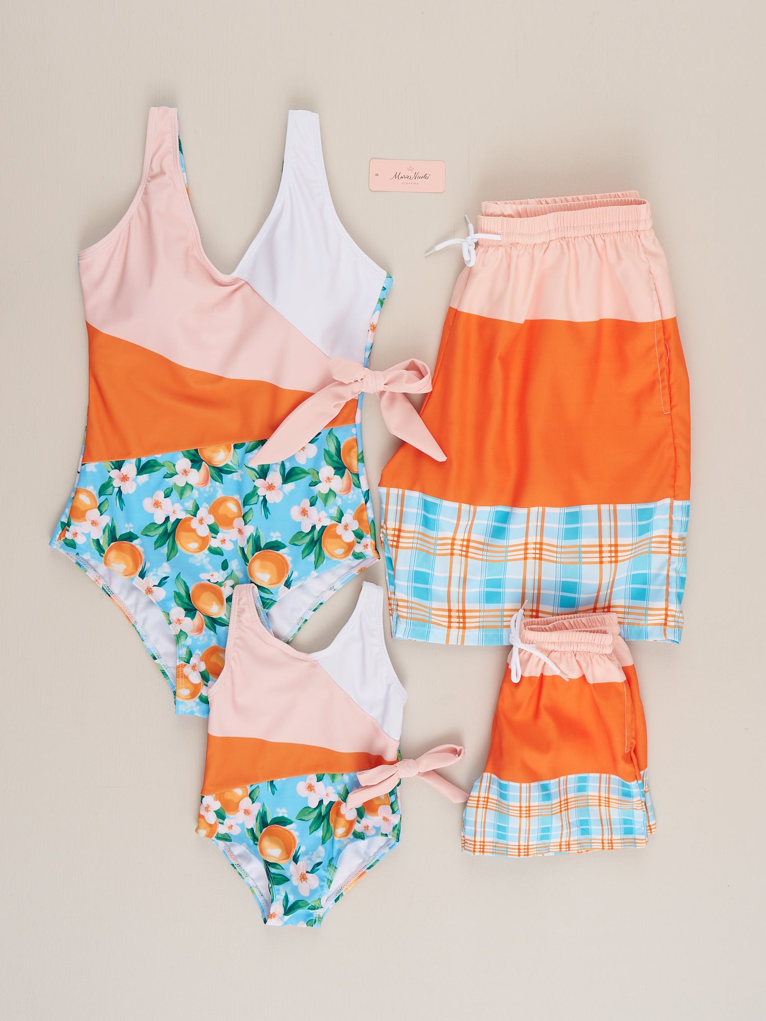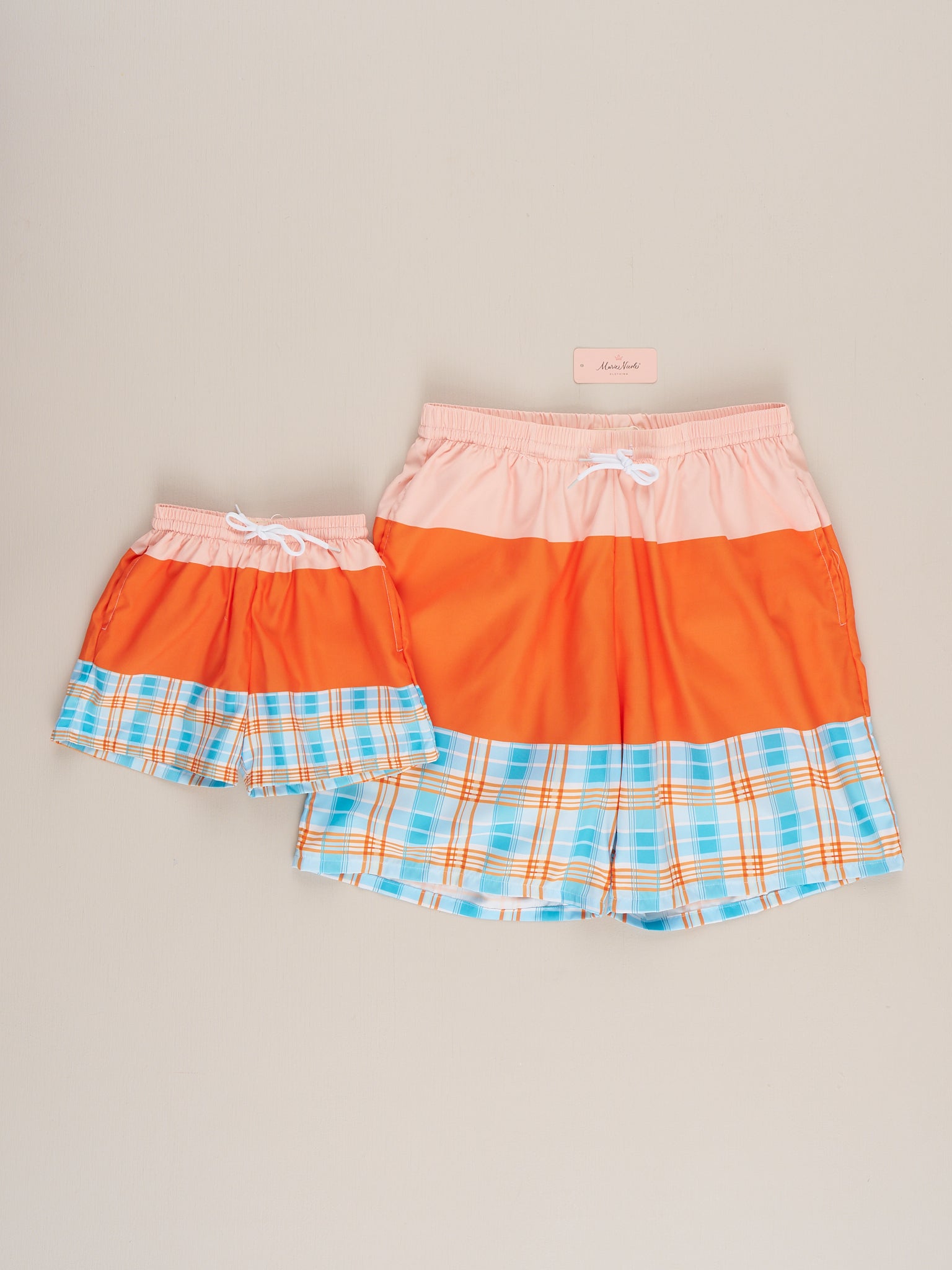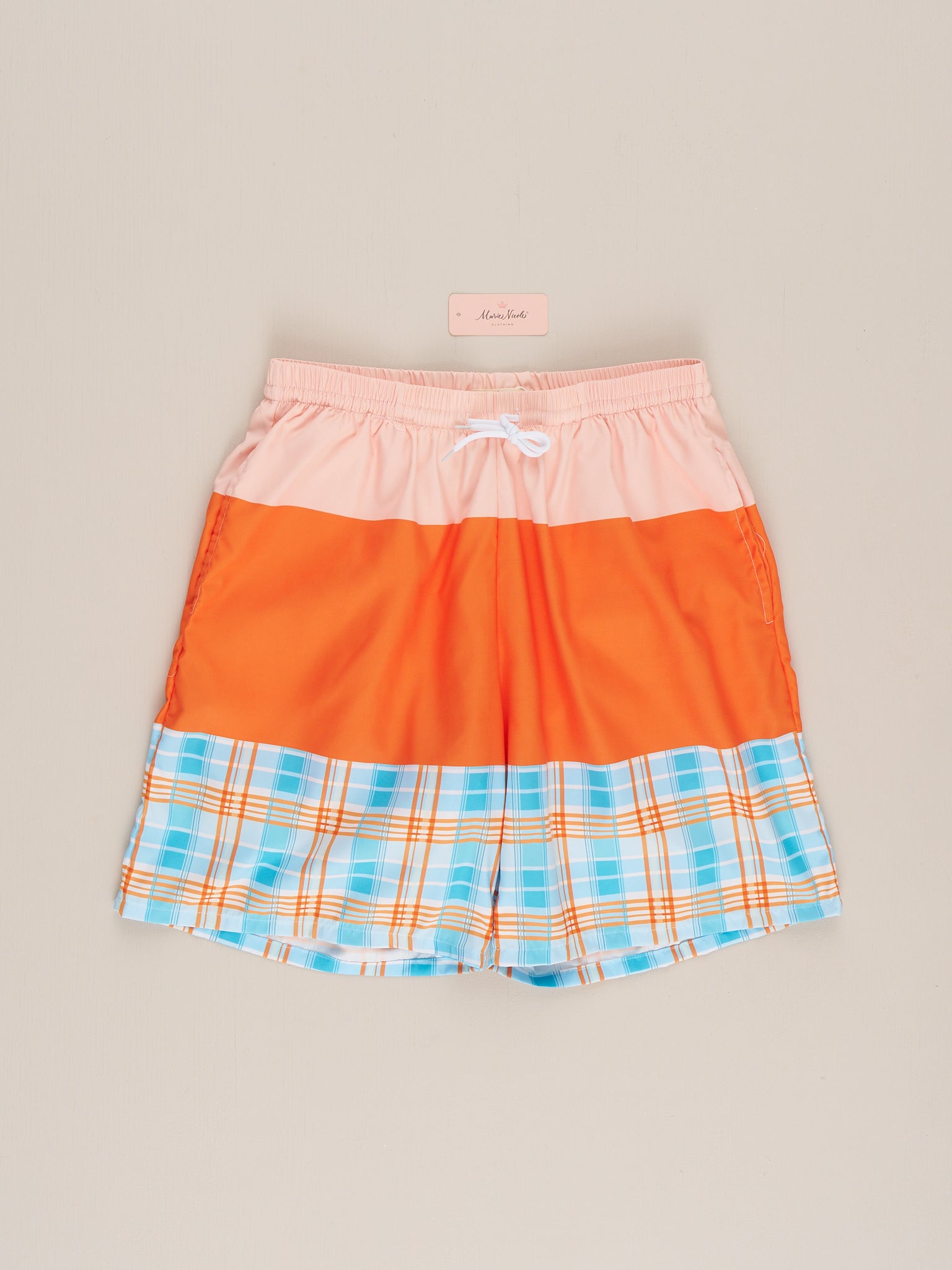 The Orchard Breeze Plaid Trunk – Dad By Marie Nicole offers a relaxed yet polished look for summer days. Featuring a comfortable elastic waistband and easy-fit design, these swim trunks are ideal for beach trips, poolside fun, and coordinating family swim looks while staying comfortable and practical all day.