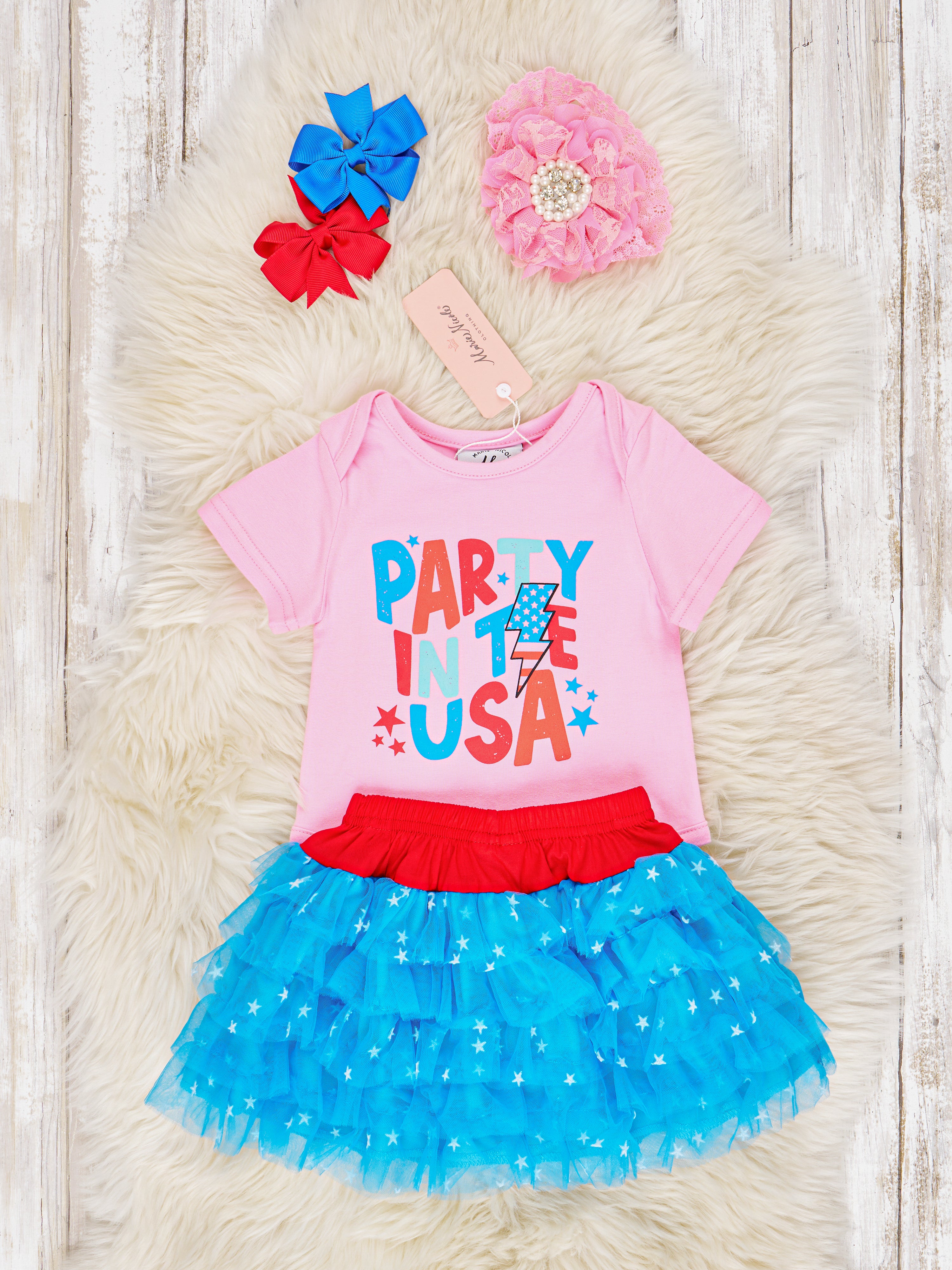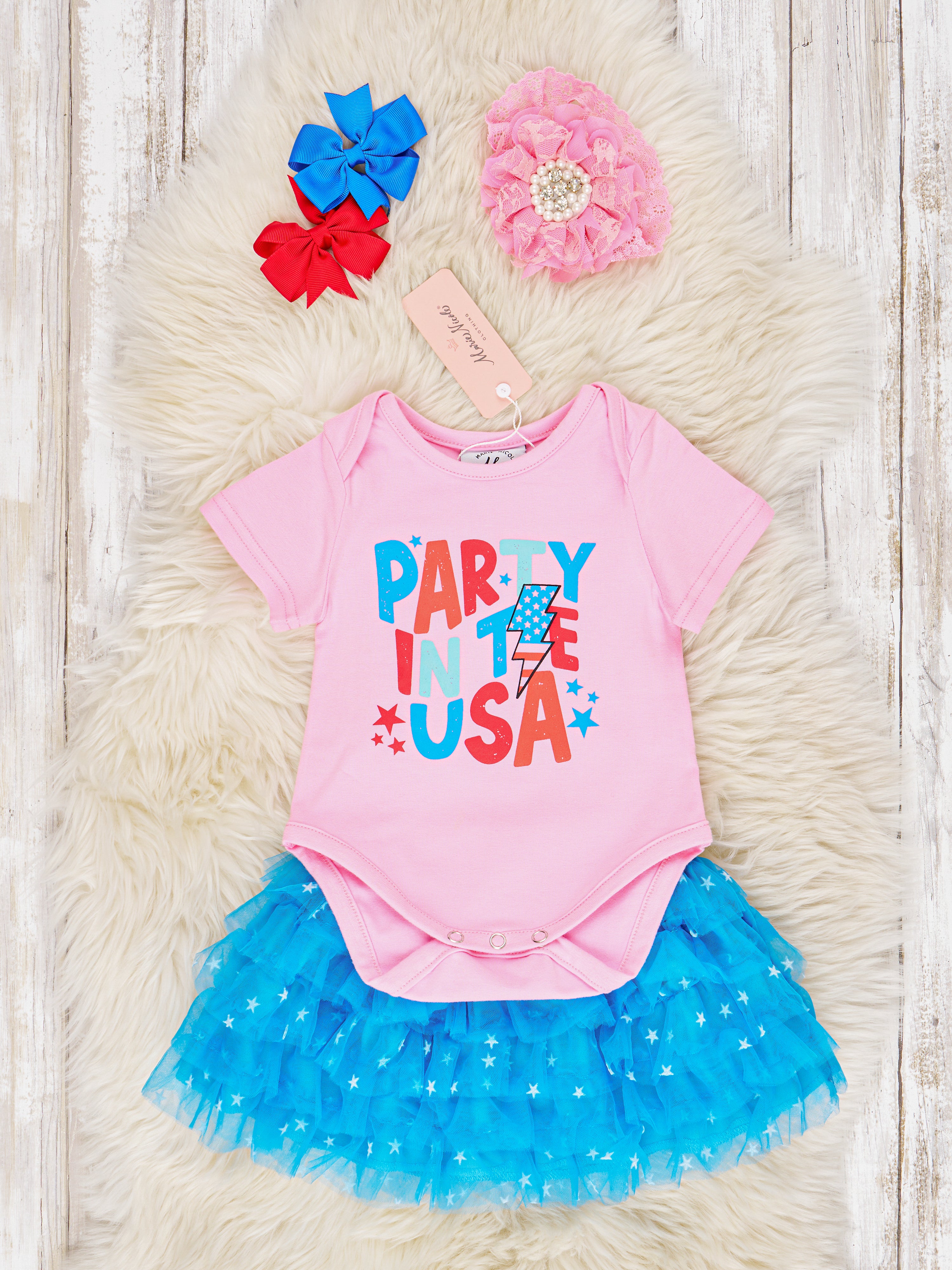 Make them the life of the party in this onesie outfit! The "Party In The USA" onesie is perfect for your little one, featuring a soft and cozy fit and a swishy tulle skirt. The elastic waistband keeps the look secure, so they can party all day!