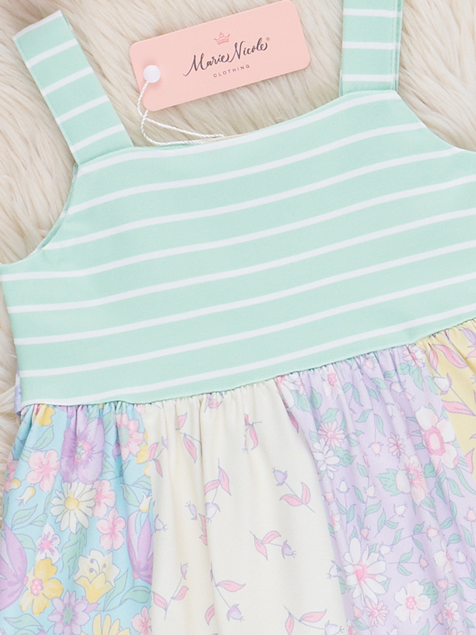 Get ready for a fun day at the beach in our Pastel Buds & Blooms Ruffle Tie Dress! This playful girls bubble from Marie Nicole Clothing features a dainty combination of mixed floral prints, mint stripes, and lavender polka dots. Perfect for summer and even better as a sister set!