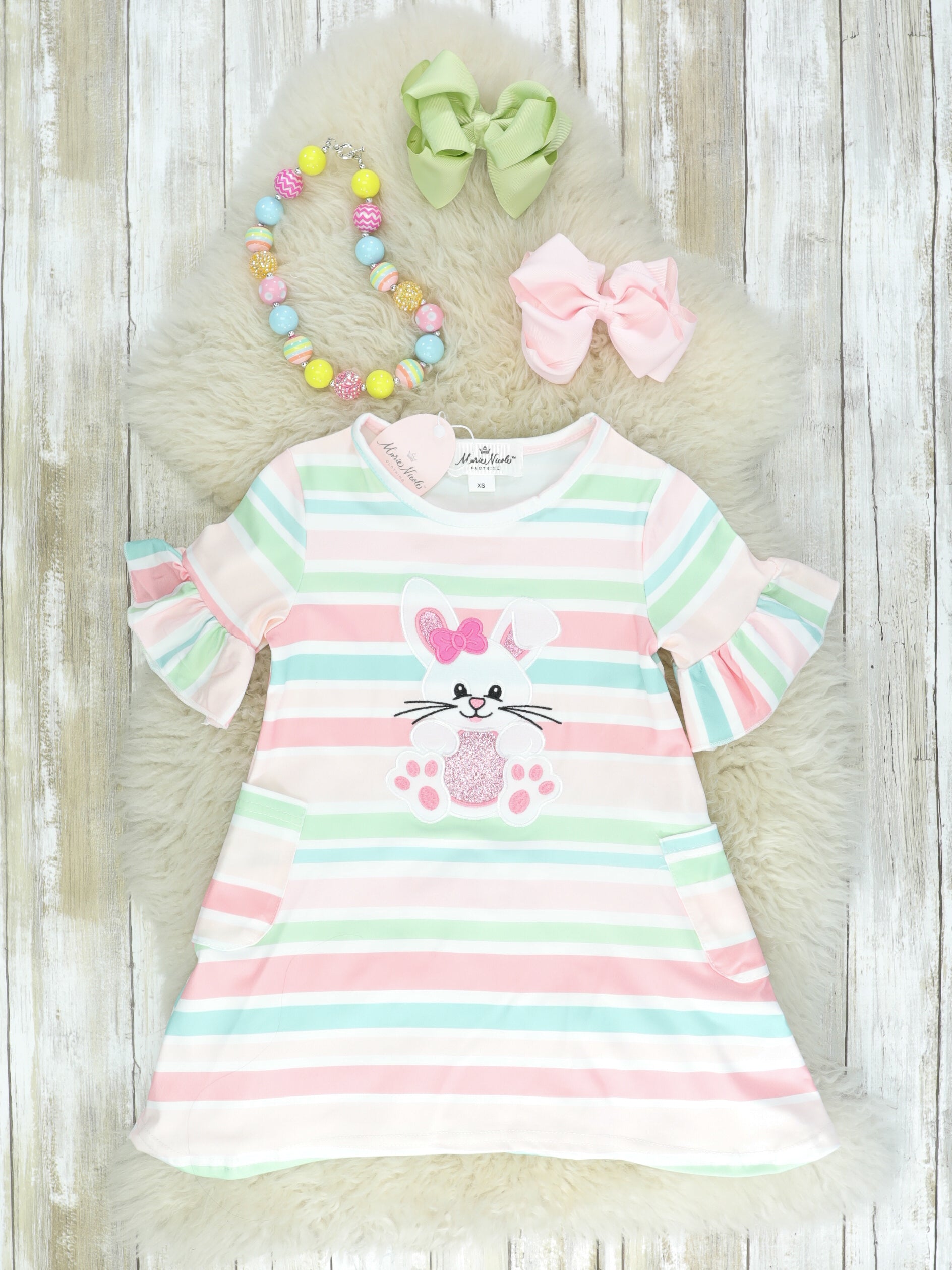 The cutest bunny dress for your girly girl! This dress features pastel stripes, ruffles, pockets, & a glittery pink bunny appliqué.