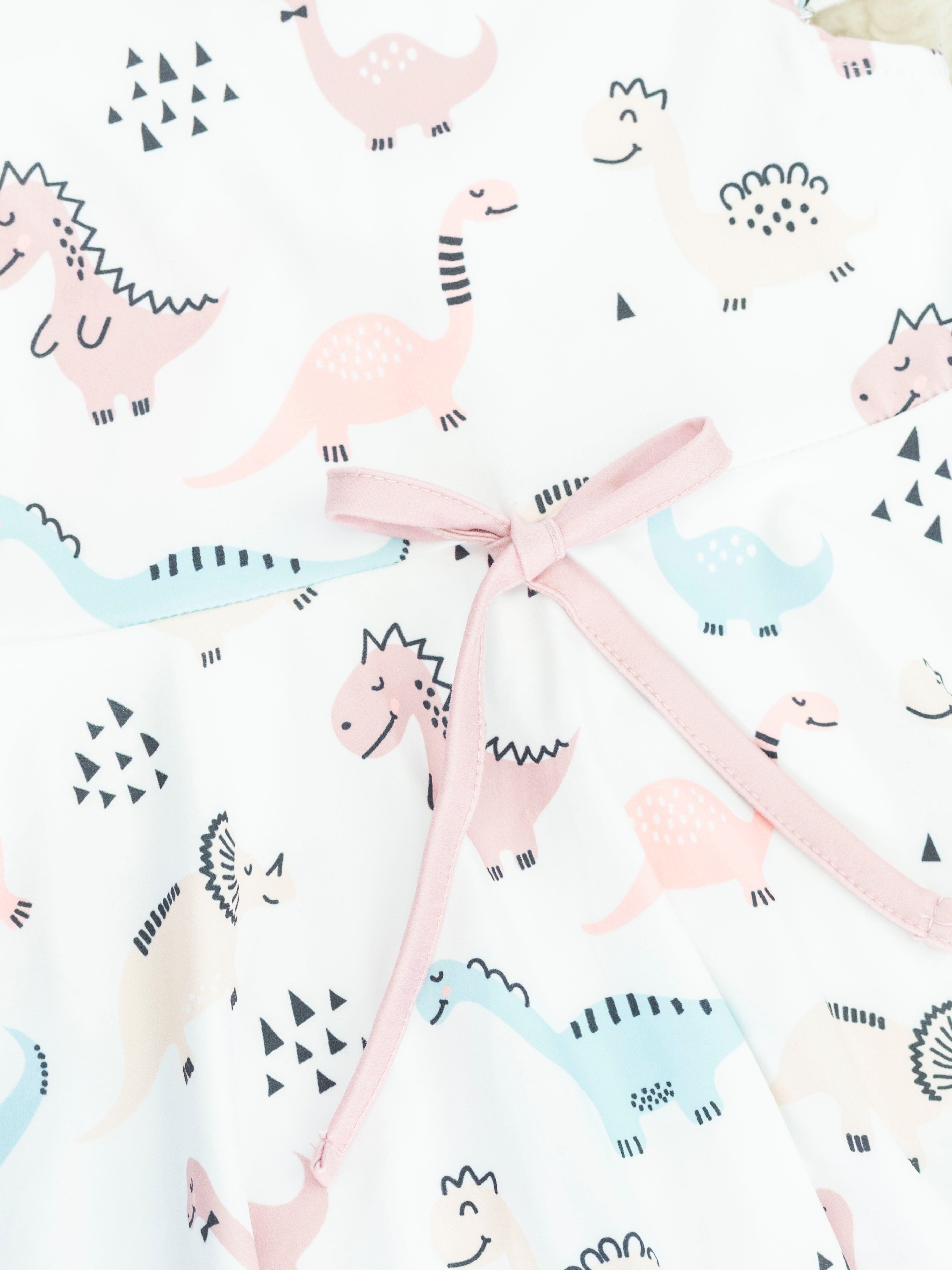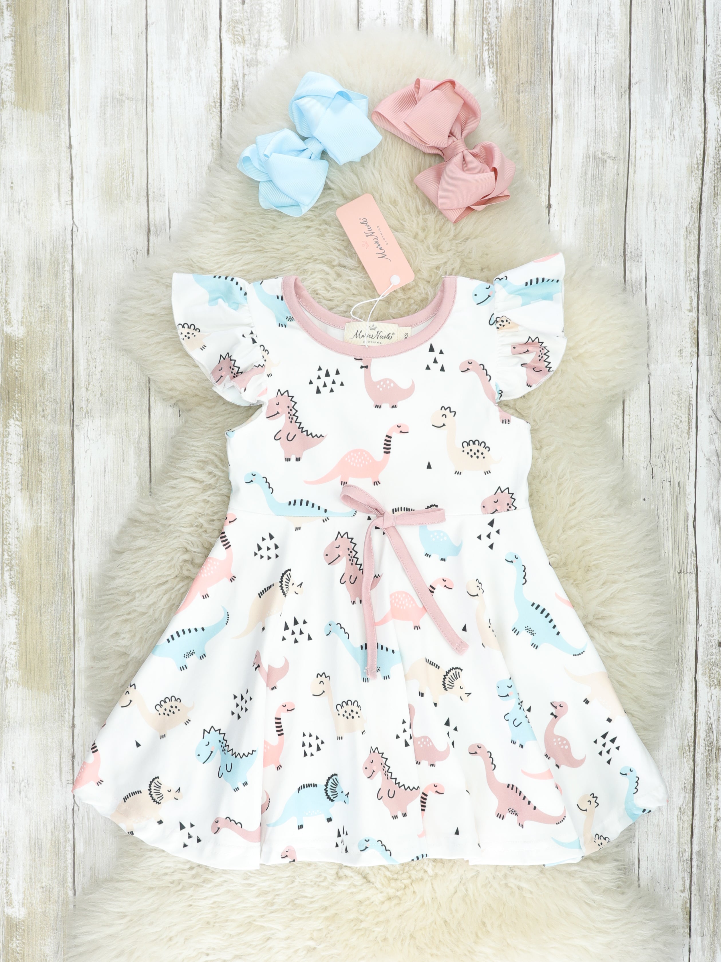 Let your little one ROAR into the room with this stylish Pastel Dinosaur Flutter Sleeve Dress! This fun, flouncy dress features pastel dinos, fluttery sleeves, and an adorable bow detail!