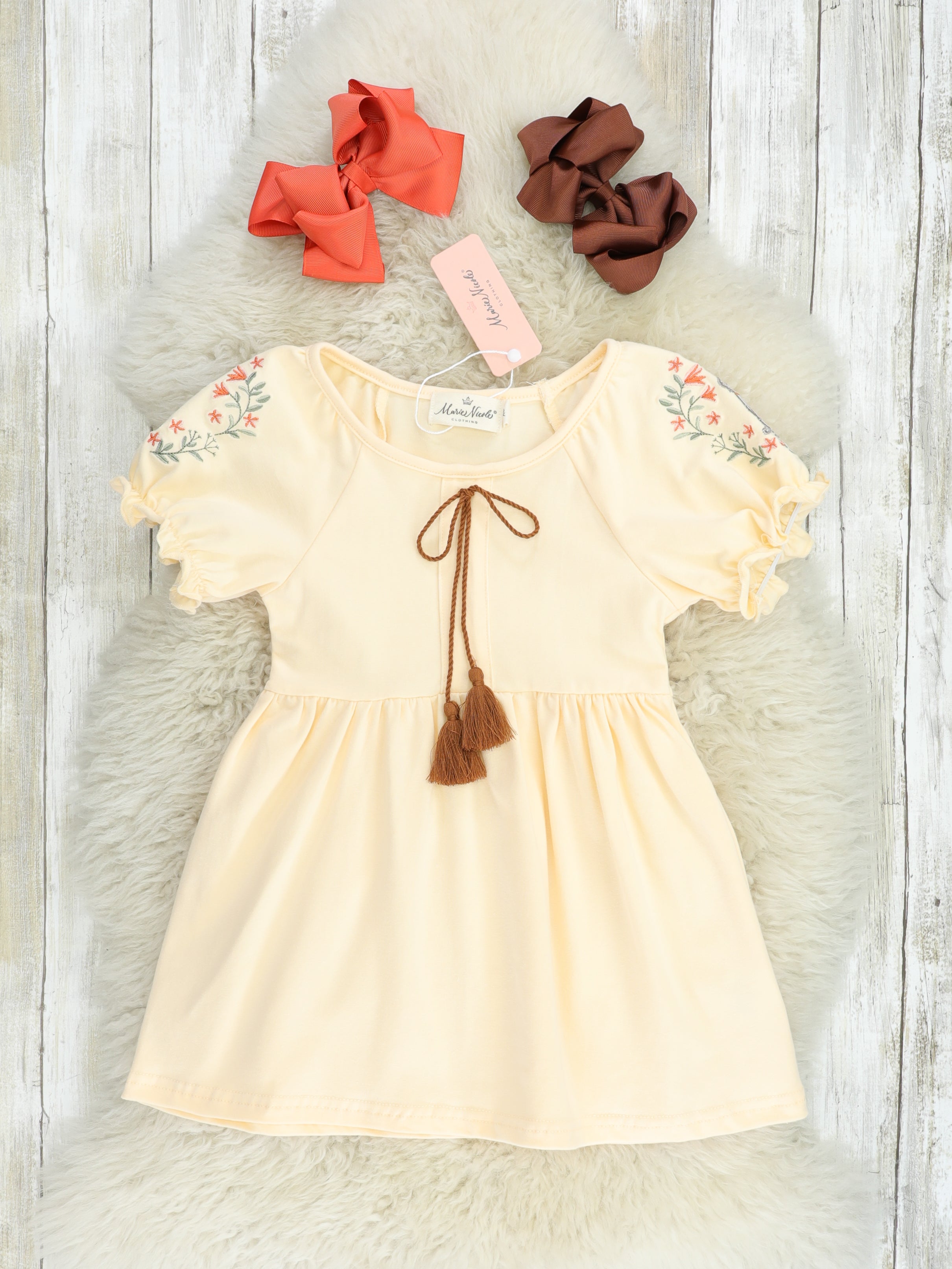 A darling sibling set for your dainty kiddos! This pastel yellow dress features a tassel tie & a bunny with floral appliqués on the sleeves.