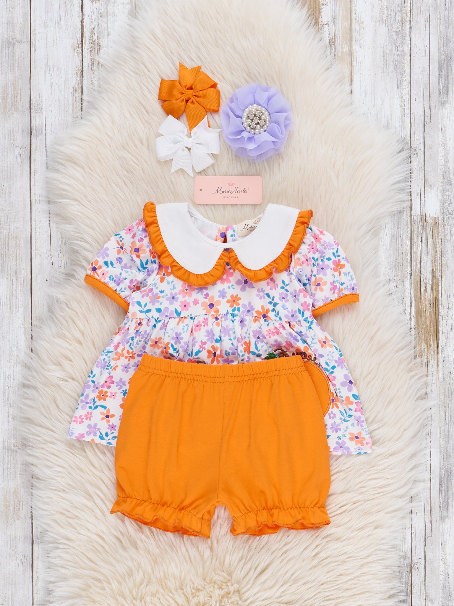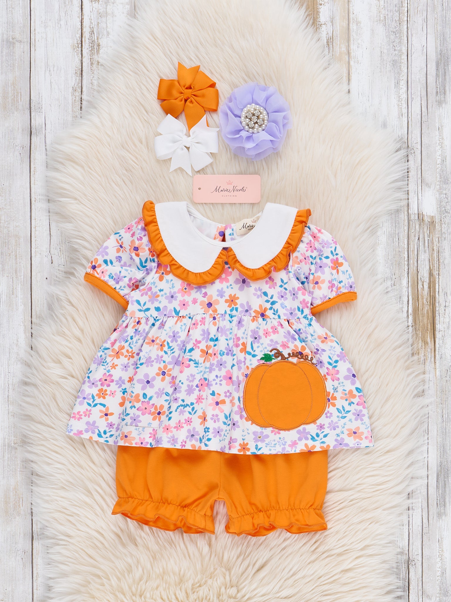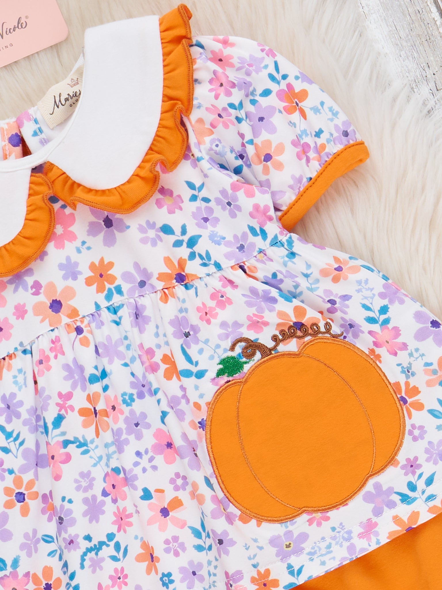 The Patch of Petals Embroidered Bloomers Outfit is a sweet and delicate choice for temperate fall days. Featuring charming embroidered pumpkin on soft, breathable floral fabric, this outfit from Marie Nicole Clothing blends floral elegance with cozy comfort. Finished with playful ruffle bloomers, it’s perfect for garden playdates, family outings, and picture-perfect moments.