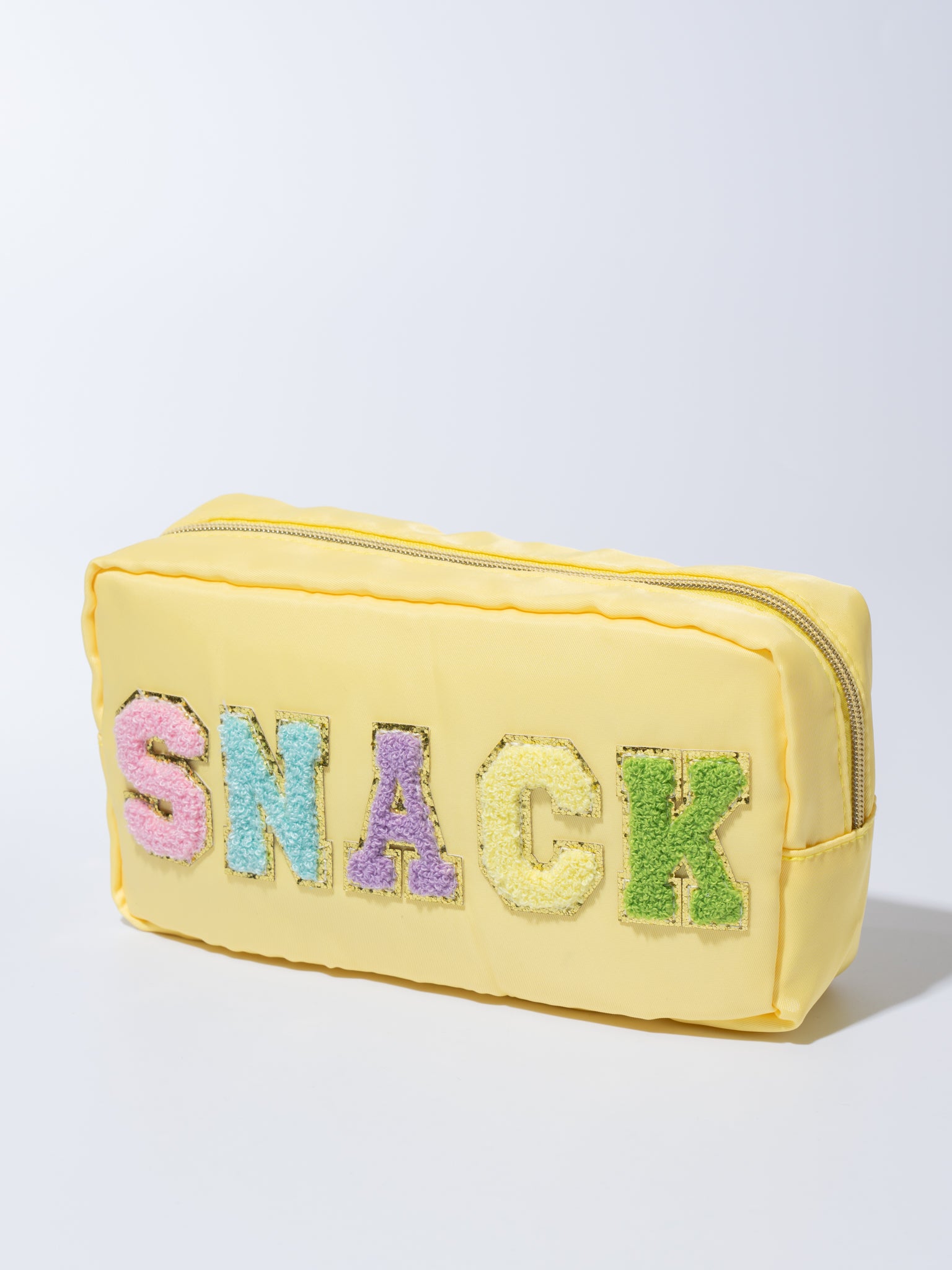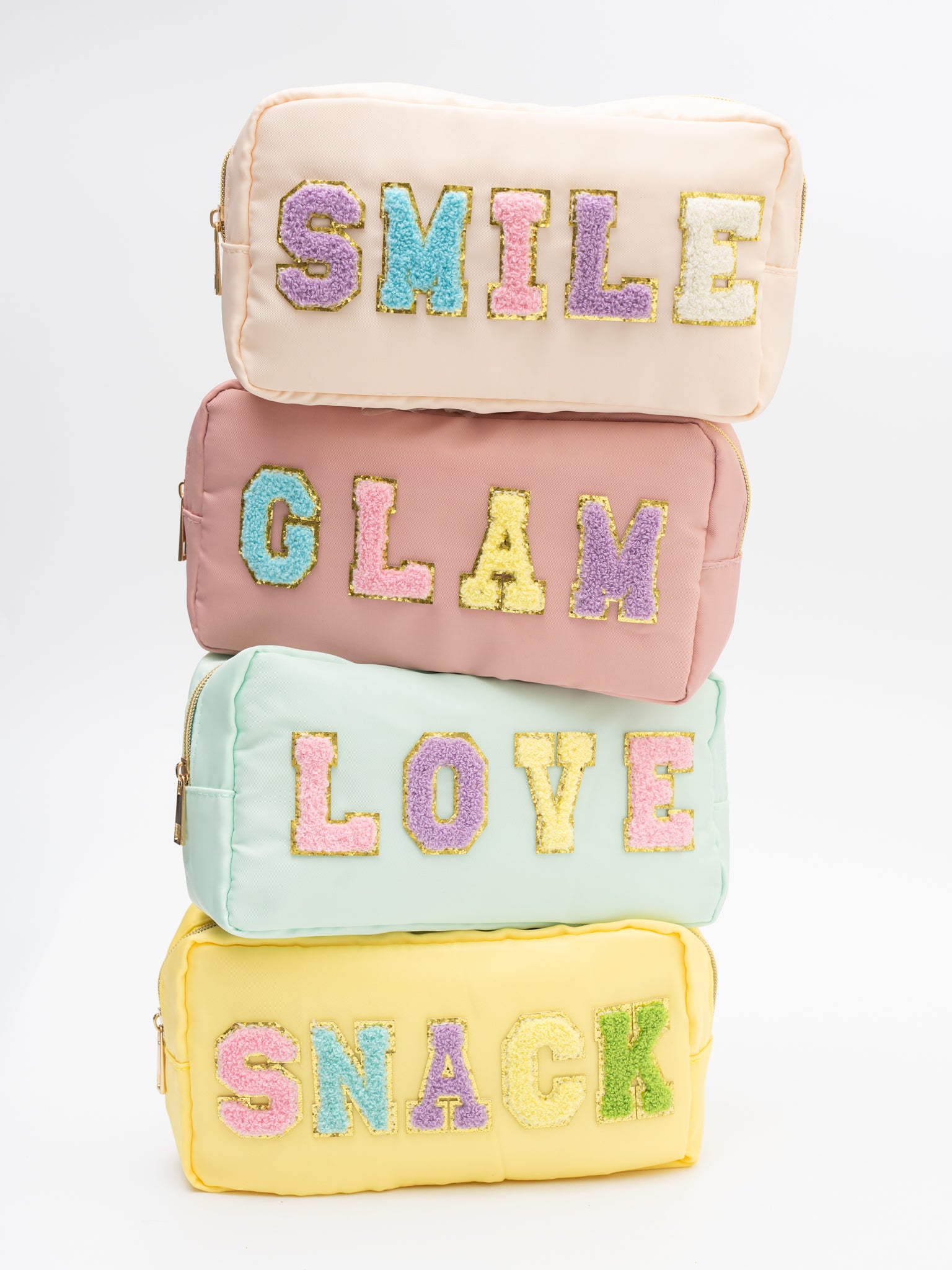 Pack light and pack smart with this patch zippered pouch! Available in SNACK, LOVE, GLAM, and SMILE sayings, this pouch is the must-have travel item you didn't know you couldn't live without. With its stylish patches and its snug zipper, you'll be saying, "Adios, suitcase clutter!" in no time.
