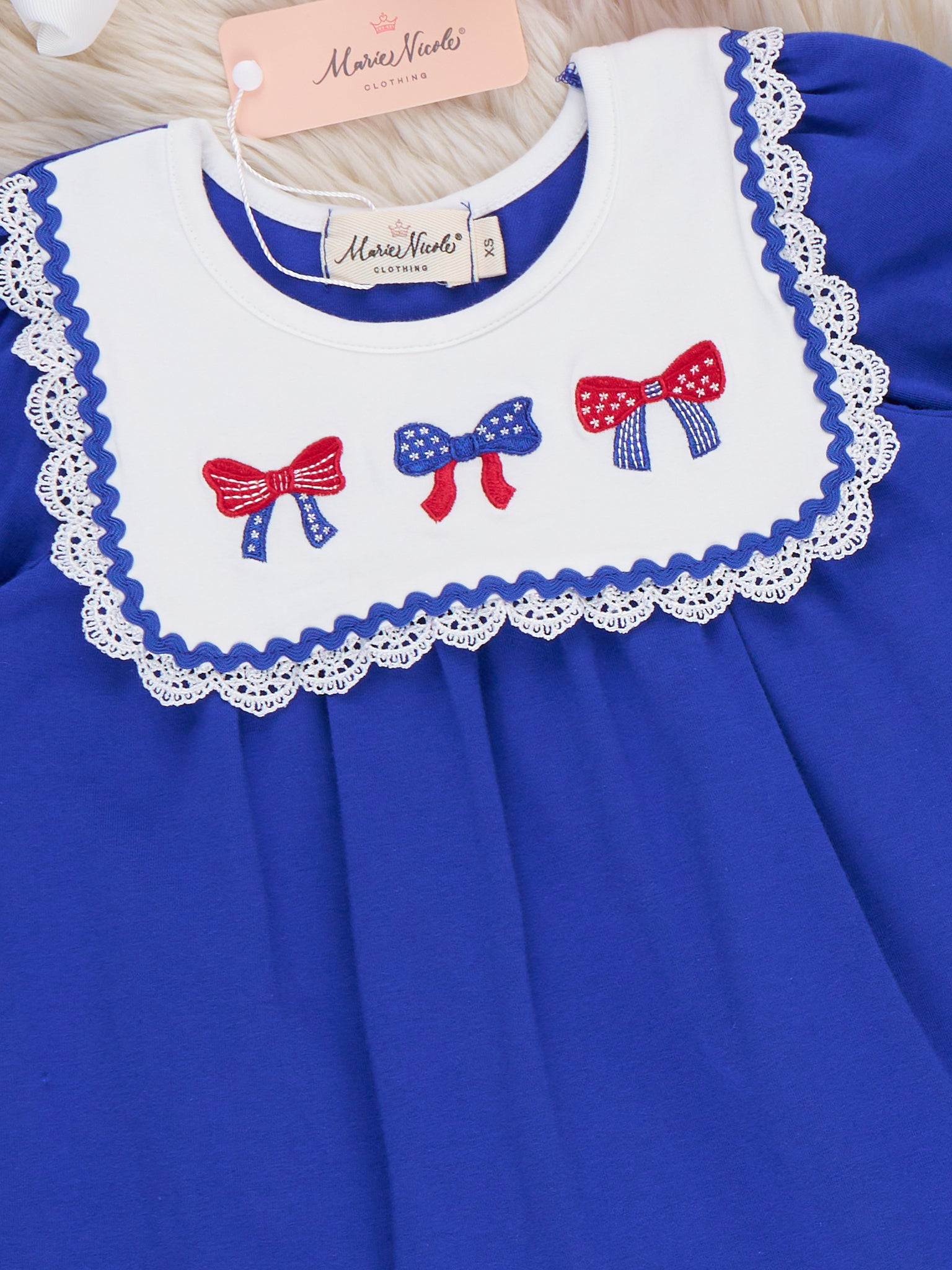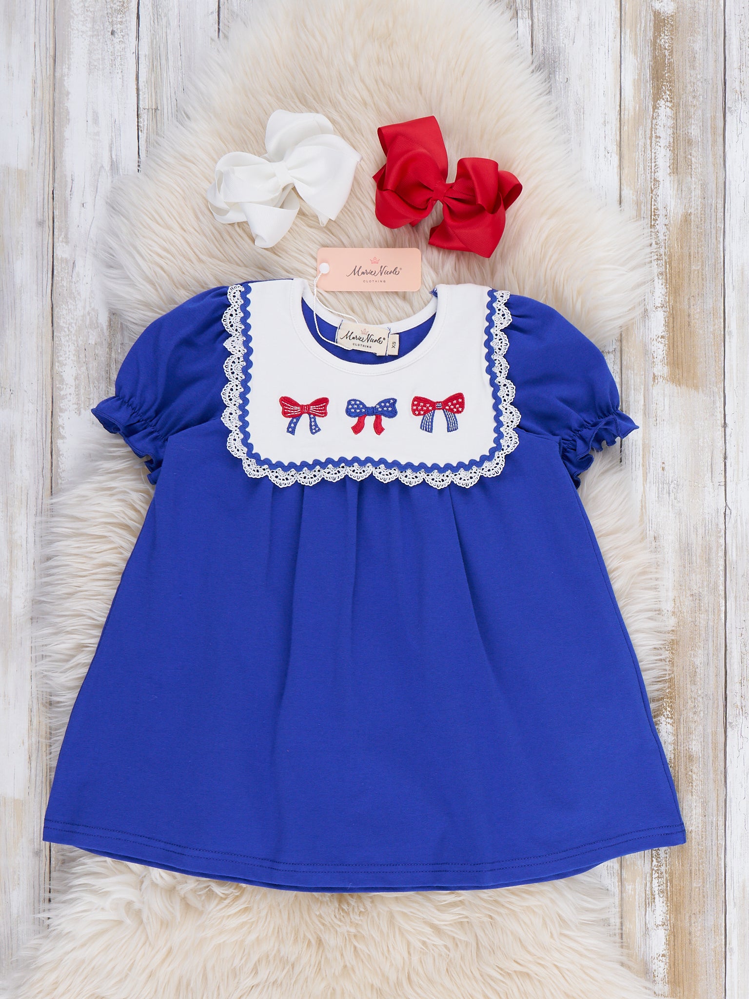 The Patriotic Bow Bliss Embroidered Cotton Ruffle Dress by Marie Nicole Clothing adds a charming touch to any celebration. Featuring an embroidered bow design and soft, ruffled sleeves, this dress is perfect for festive gatherings and family outings. The comfortable fit and sweet details make it an ideal choice for holidays, parades, and all-day fun.
