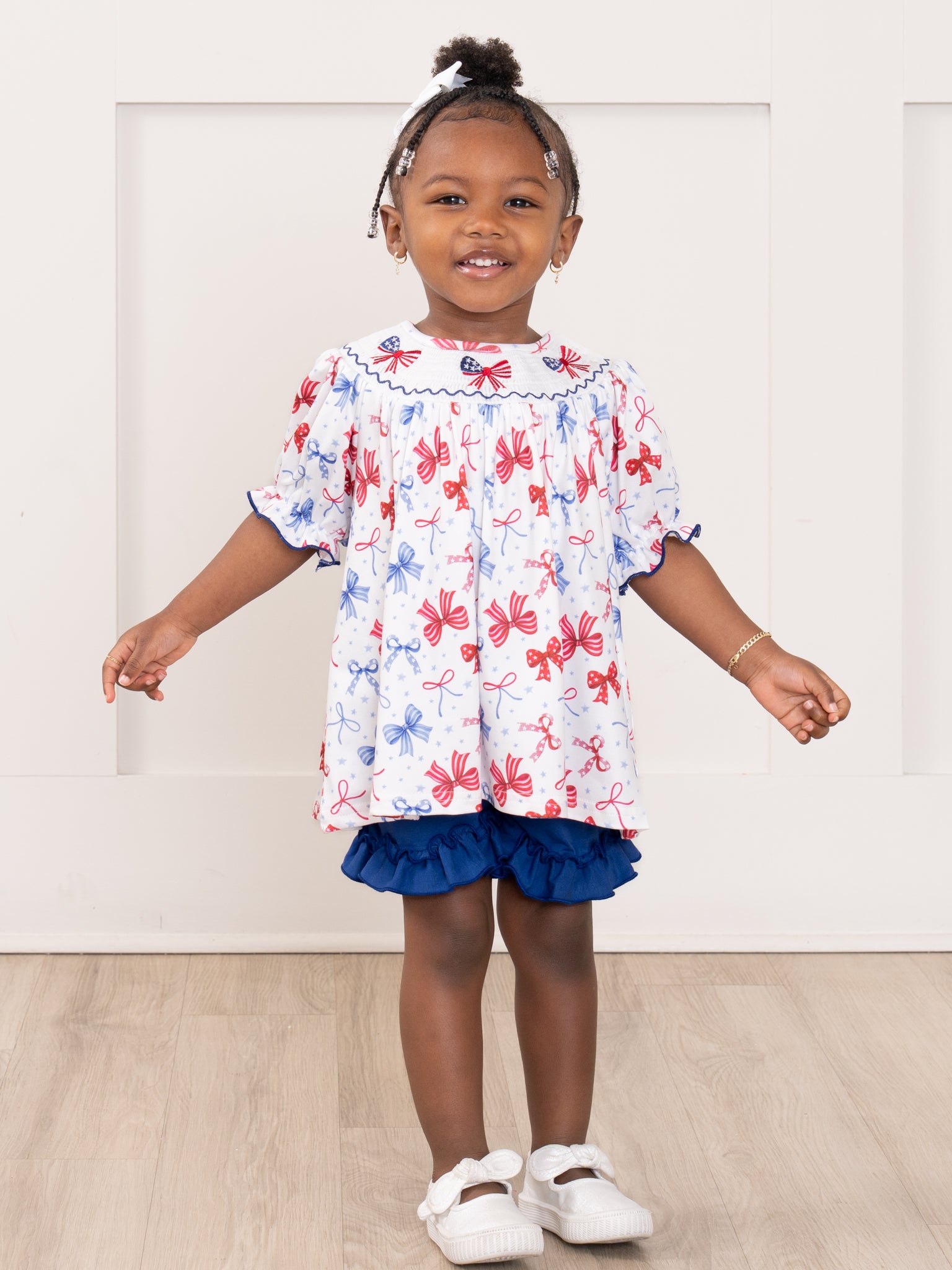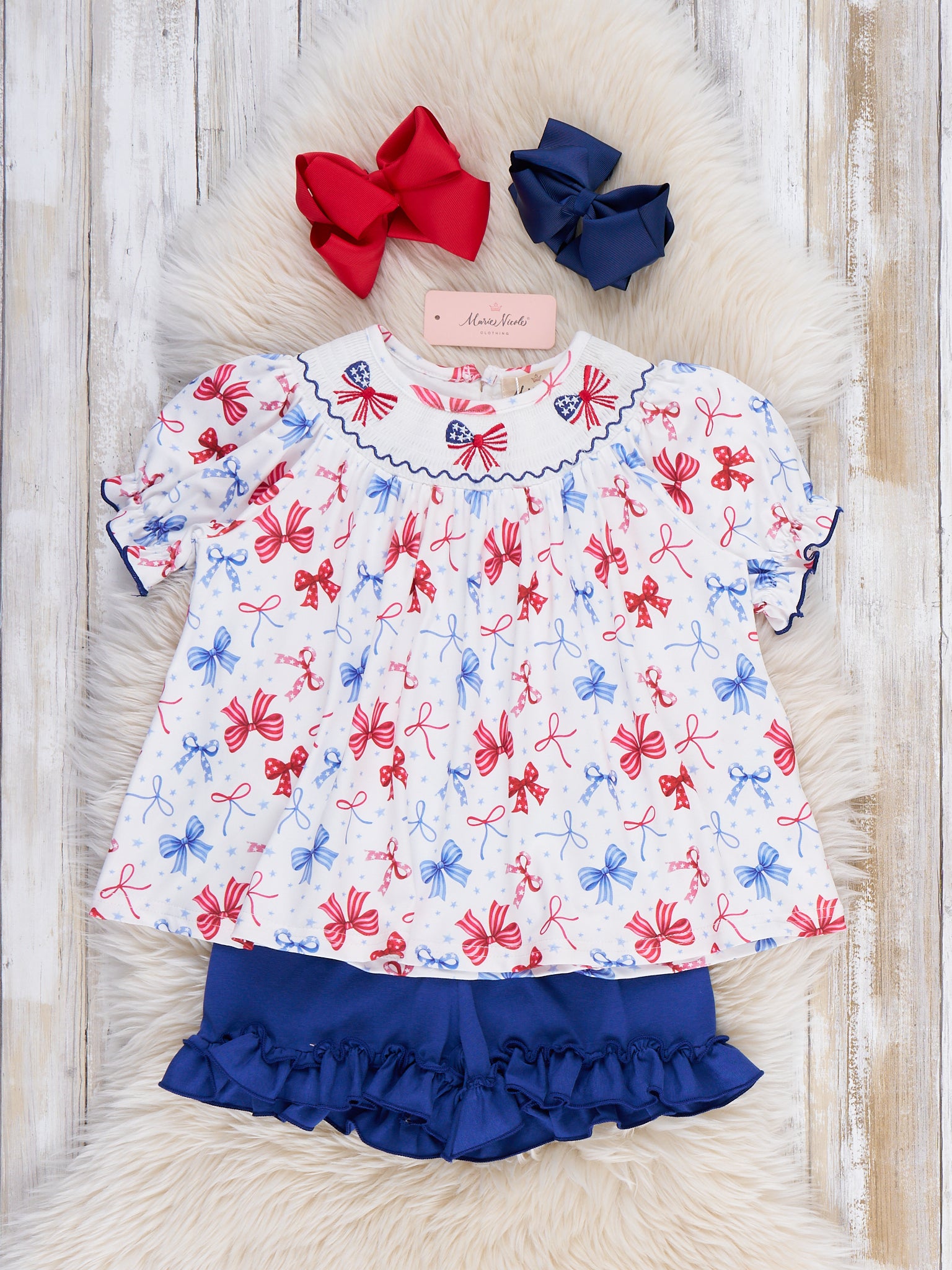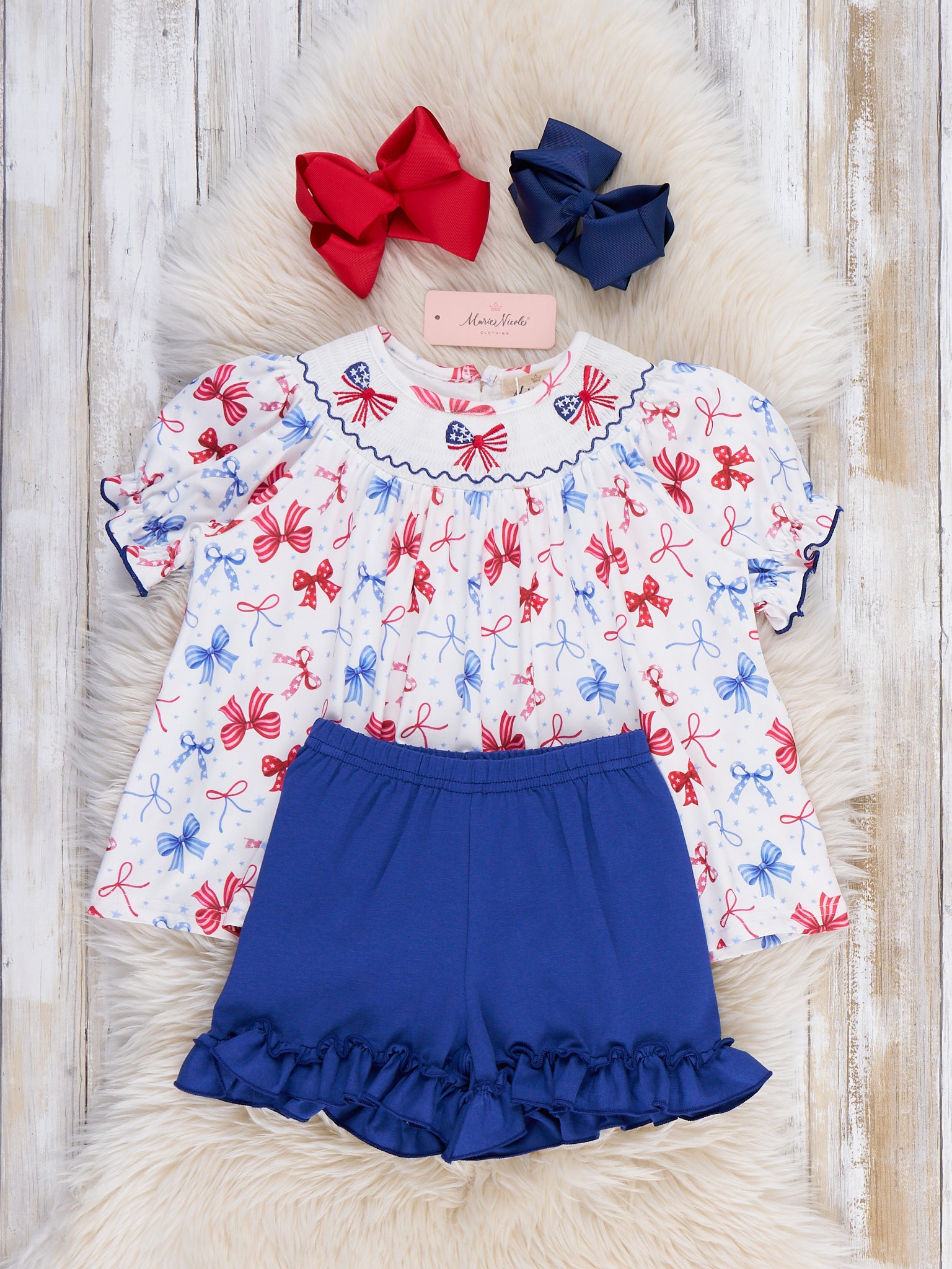 The Patriotic Bow Delight Embroidered Outfit by Marie Nicole Clothing adds a touch of festive charm to any occasion. Featuring an adorable bow-embroidered top paired with ruffled shorts, this set is perfect for celebrating in style. The soft, breathable fabric and sweet details make it ideal for family gatherings, parades, and all-day play during patriotic festivities.