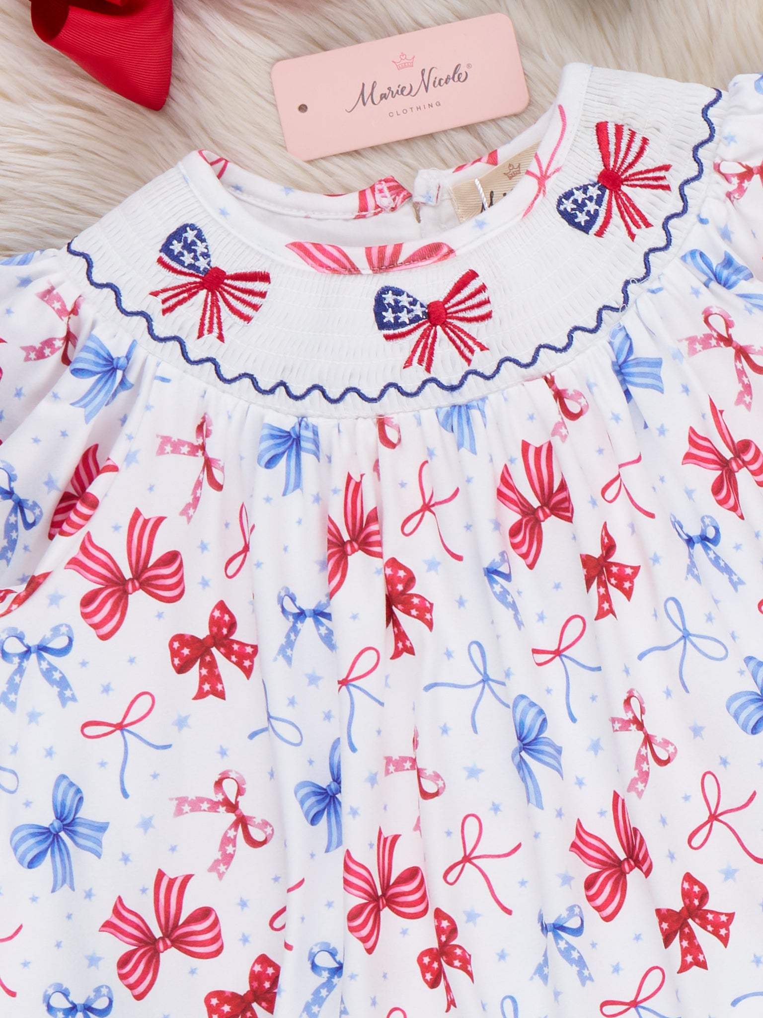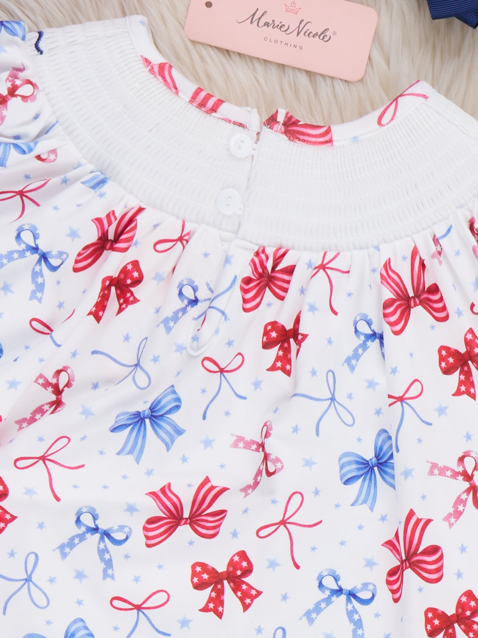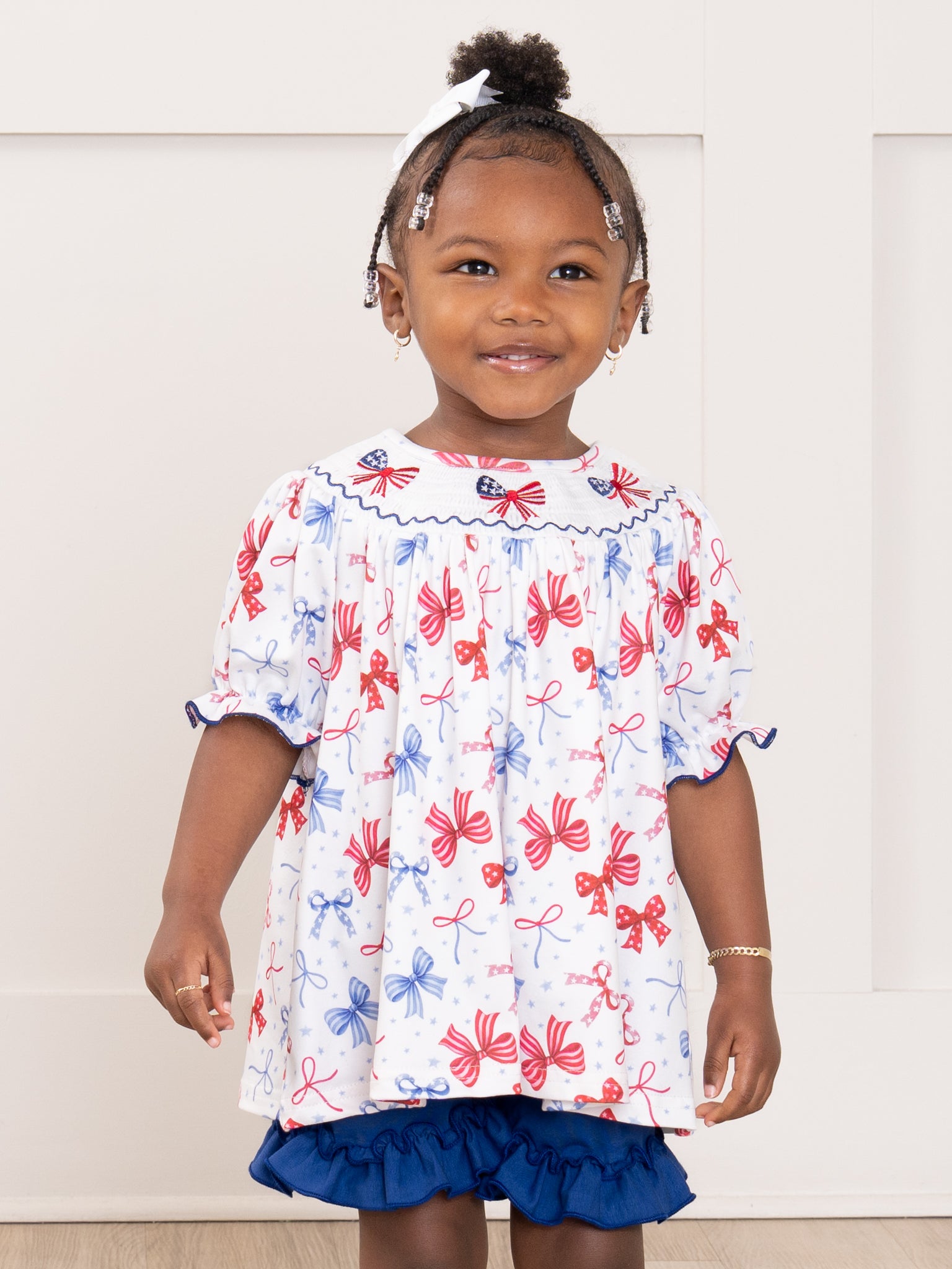 The Patriotic Bow Delight Embroidered Outfit by Marie Nicole Clothing adds a touch of festive charm to any occasion. Featuring an adorable bow-embroidered top paired with ruffled shorts, this set is perfect for celebrating in style. The soft, breathable fabric and sweet details make it ideal for family gatherings, parades, and all-day play during patriotic festivities.