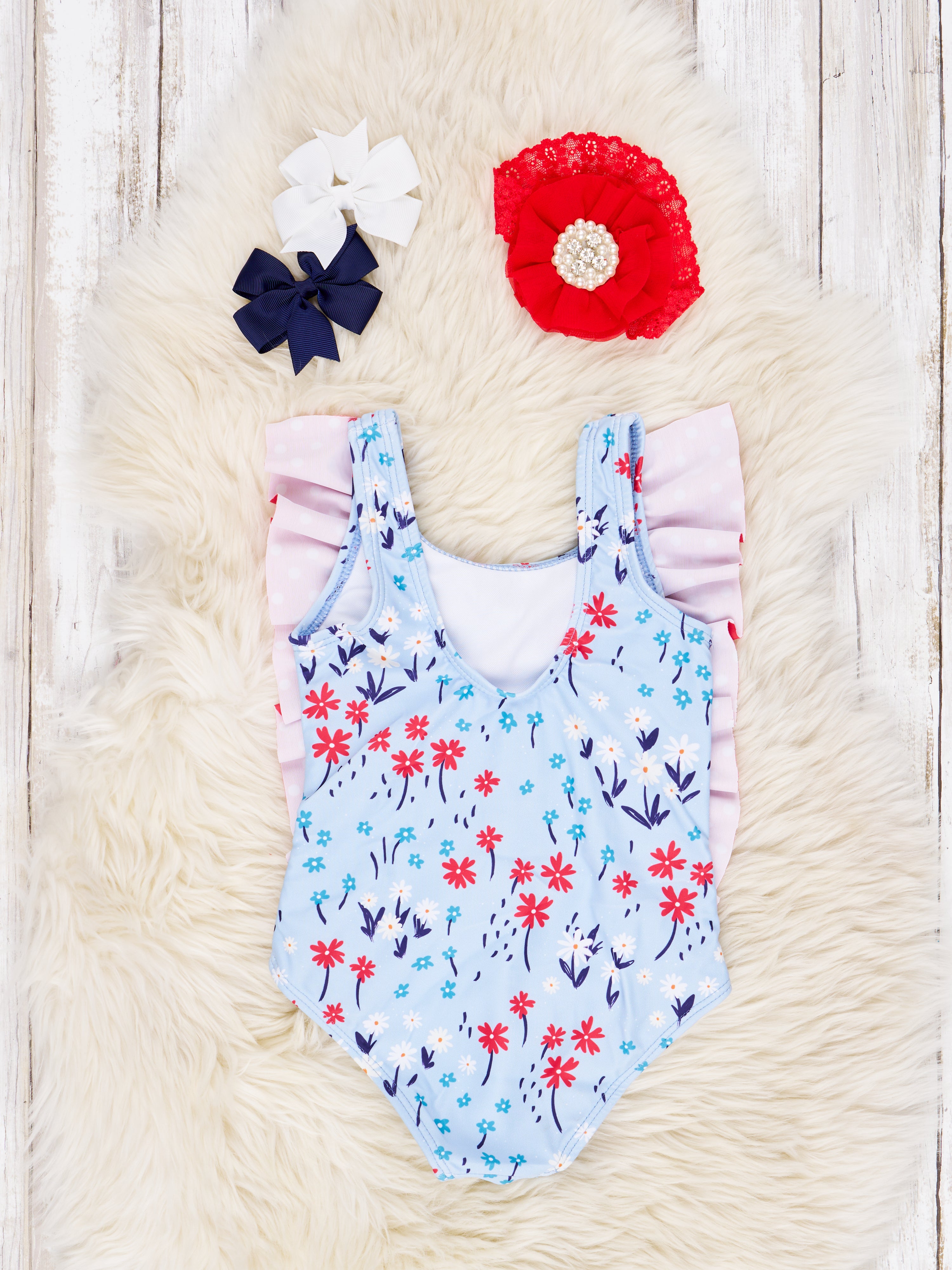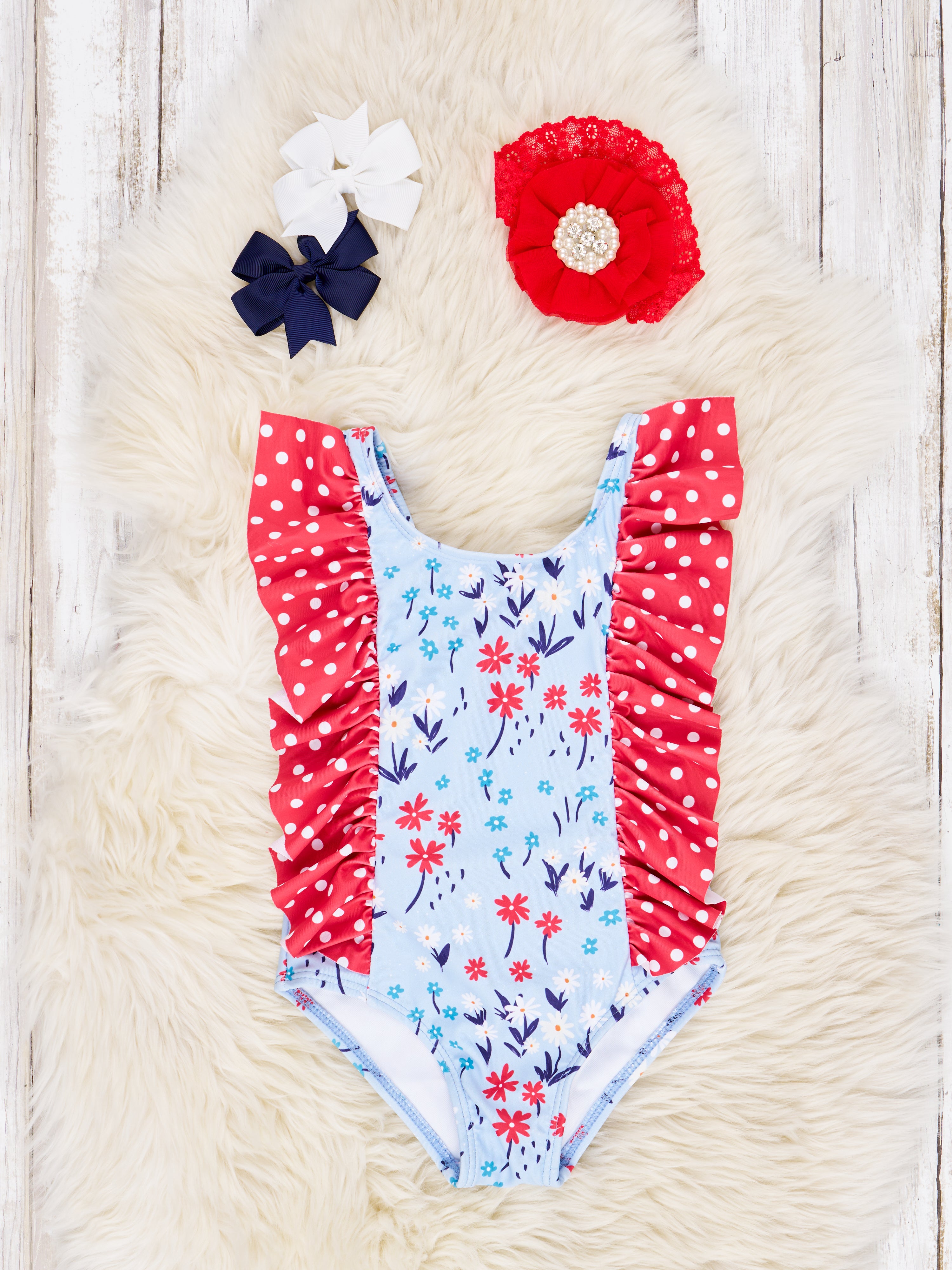 Your little patriot will be ready to take on a day of summer fun in this Patriotic Daisy Ruffle Swimsuit! This stylish one-piece features a classic red, white, and blue daisy print, topped with polka dots and fluttery ruffles for a festive look that's sure to be a splash hit!