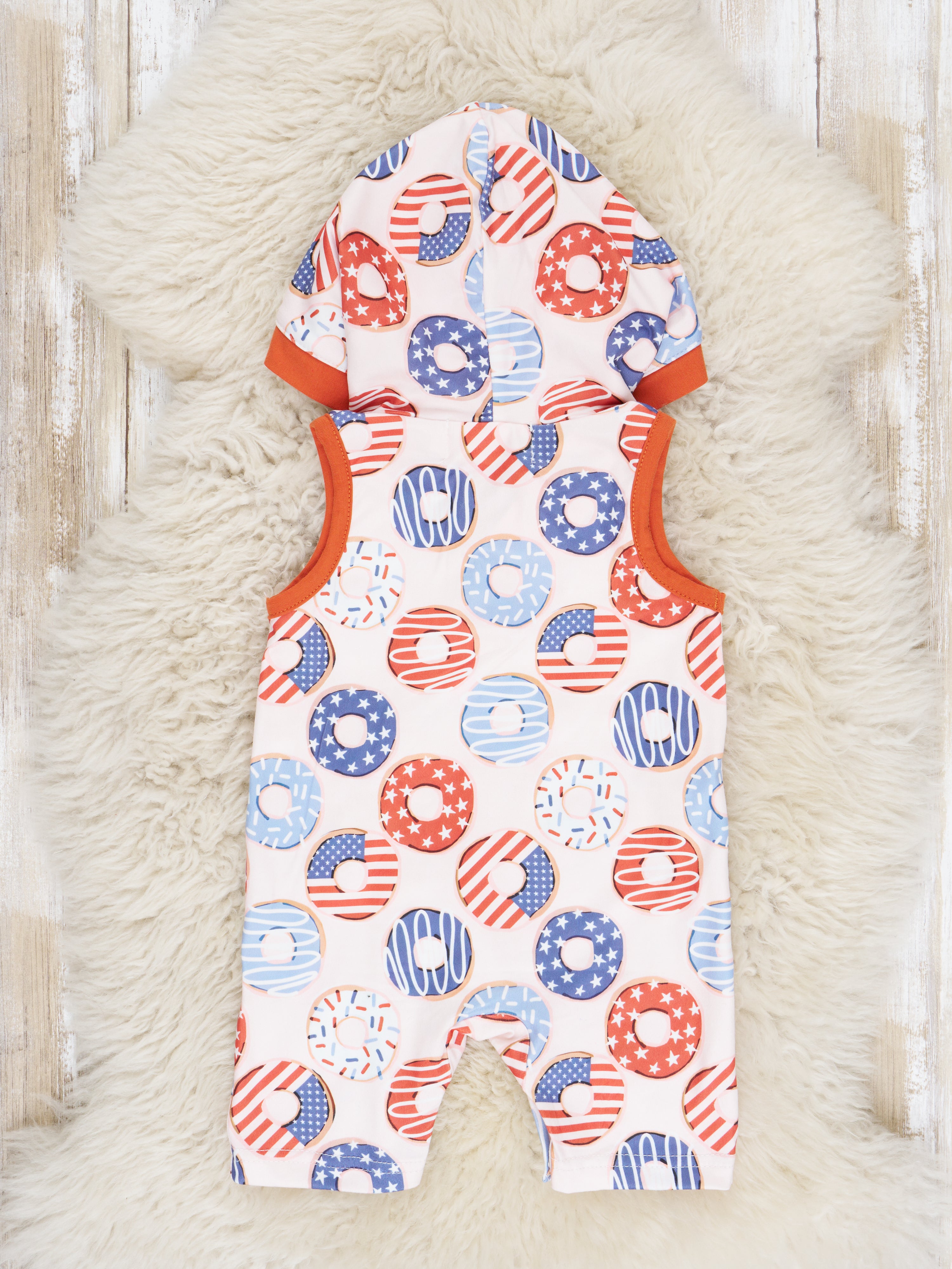 Our Patriotic Donut Hooded Romper is perfect for showing your stars and stripes! Whether you're a patriot at heart or a true blue donut enthusiast, your kiddos will be star-spangled fabulous. This sibling set is ideal for family photos, fireworks shows, or just a fun day out with the stars of your life!