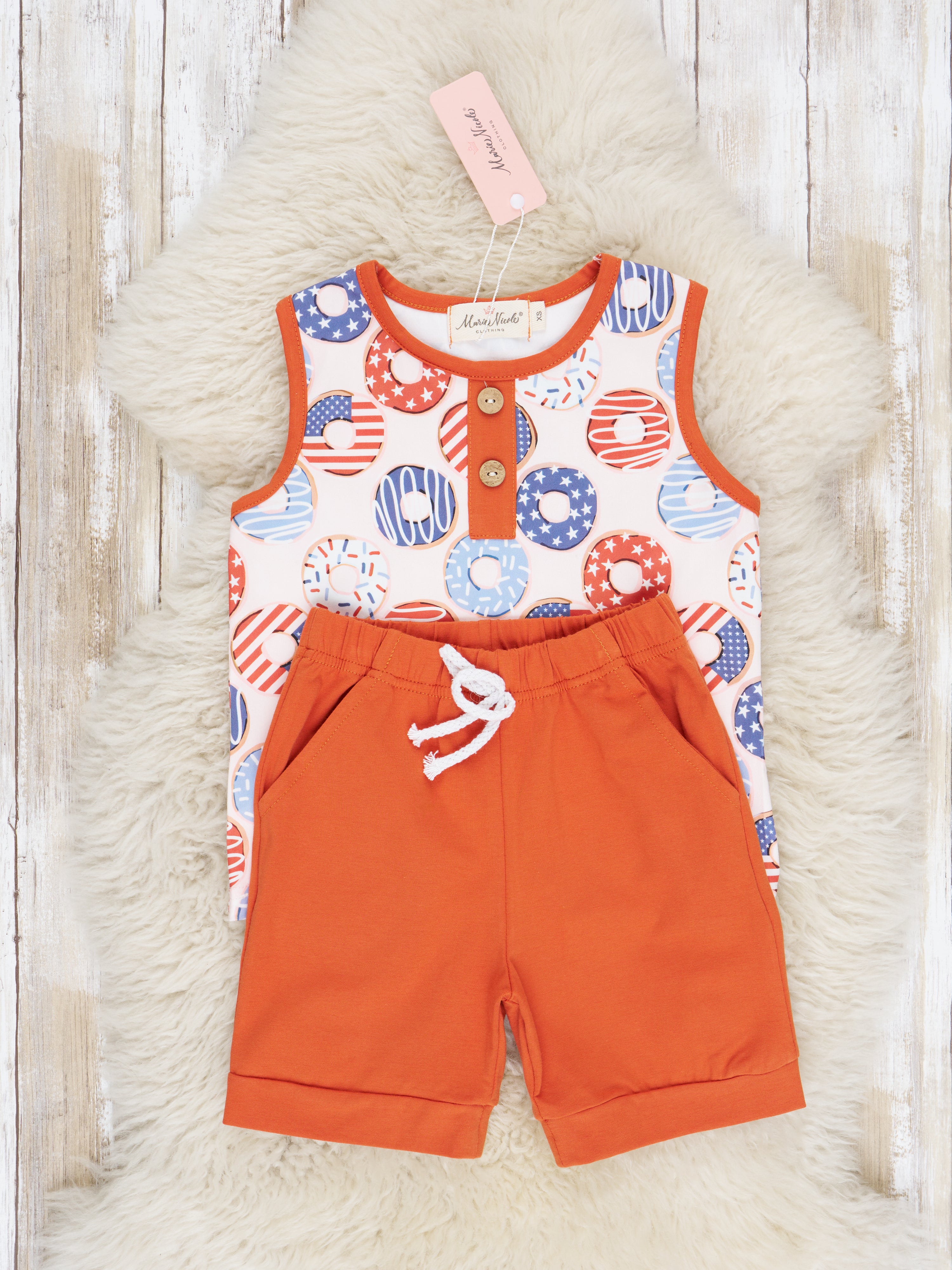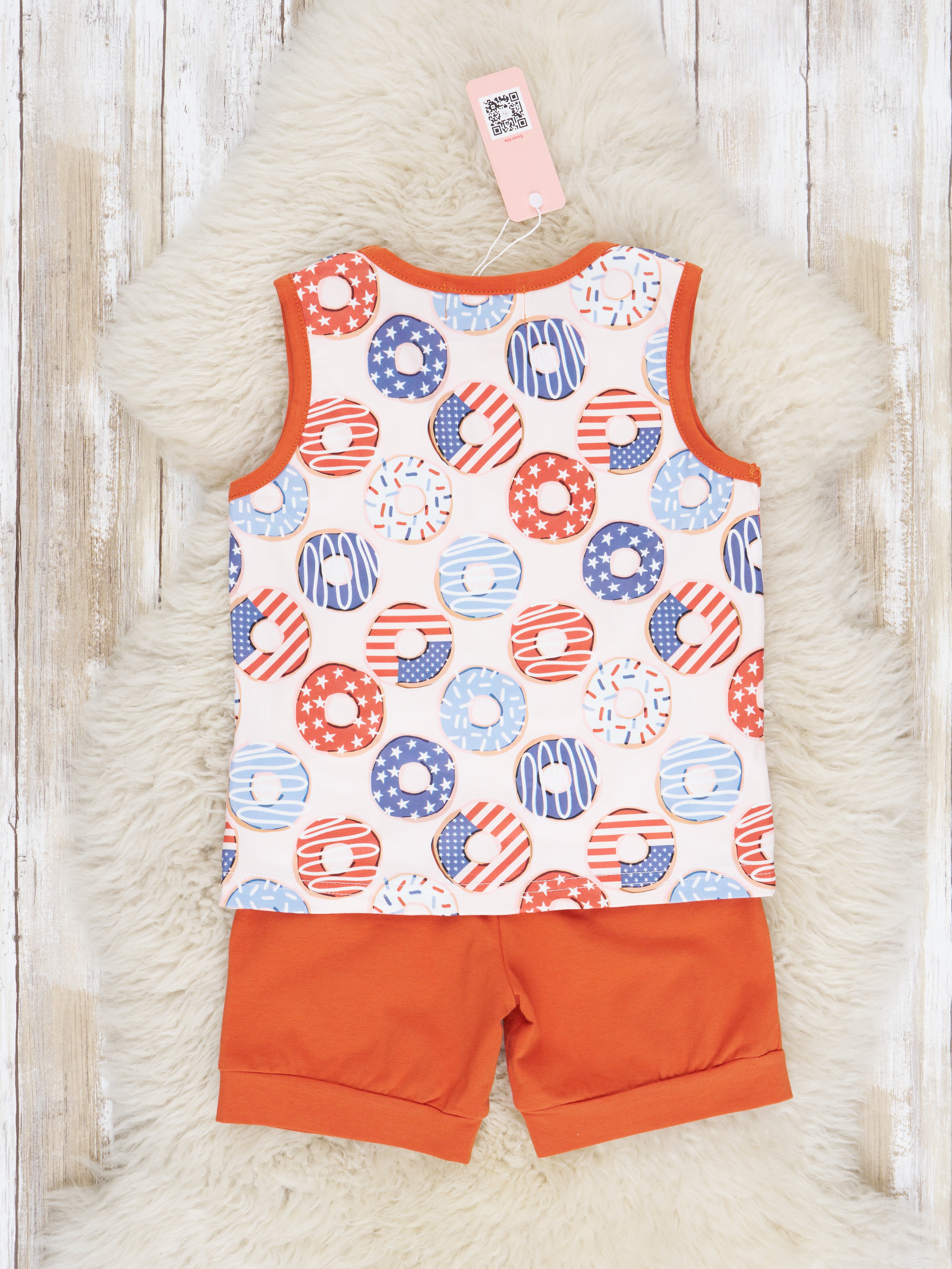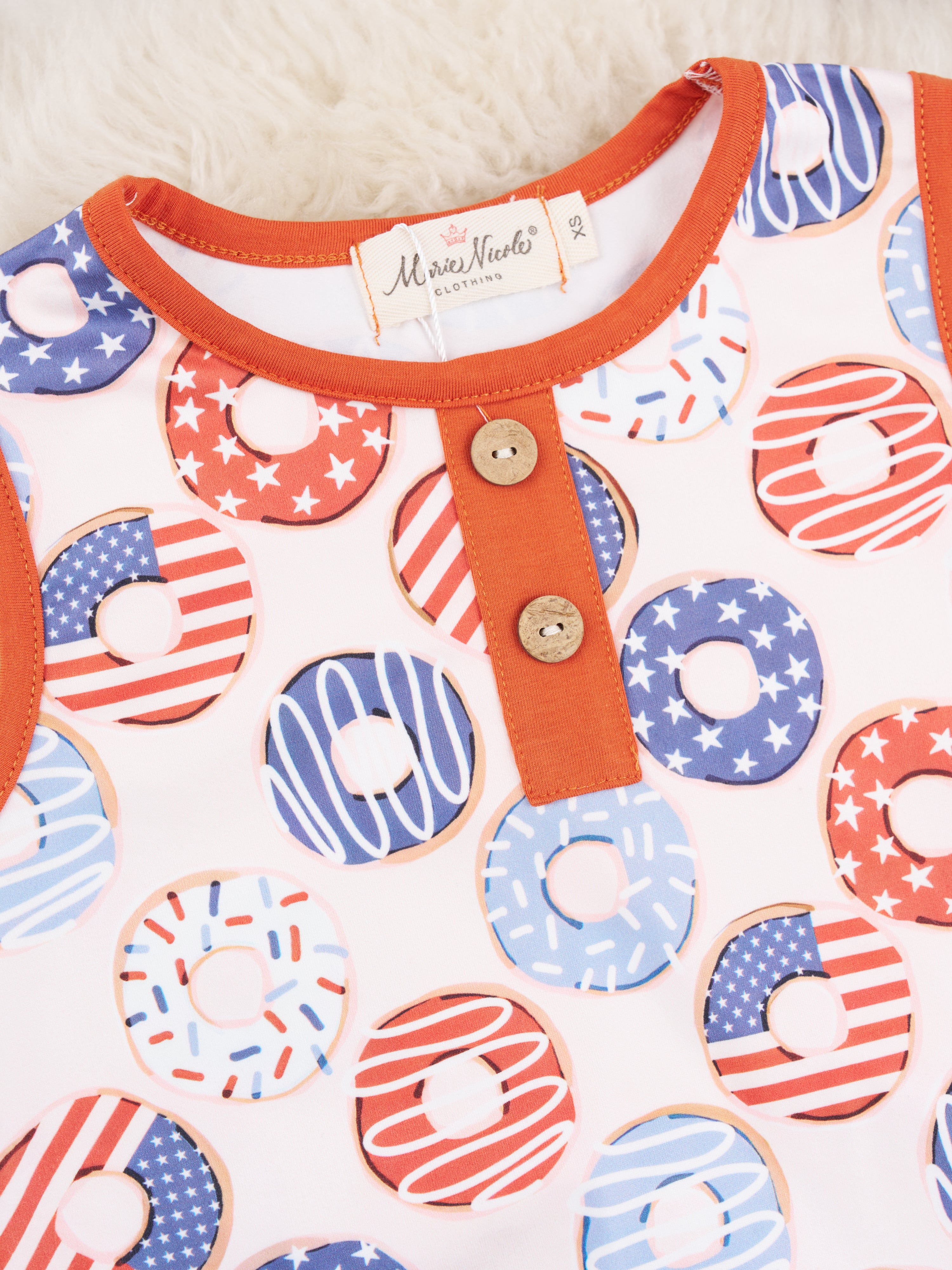 Our Patriotic Donut Outfit is the perfect way to show your stars and stripes! Whether you're a patriot at heart or a true blue donut enthusiast, your kiddos will be star-spangled fabulous. This sibling set is ideal for family photos, fireworks shows, or just a fun day out with the stars of your life!