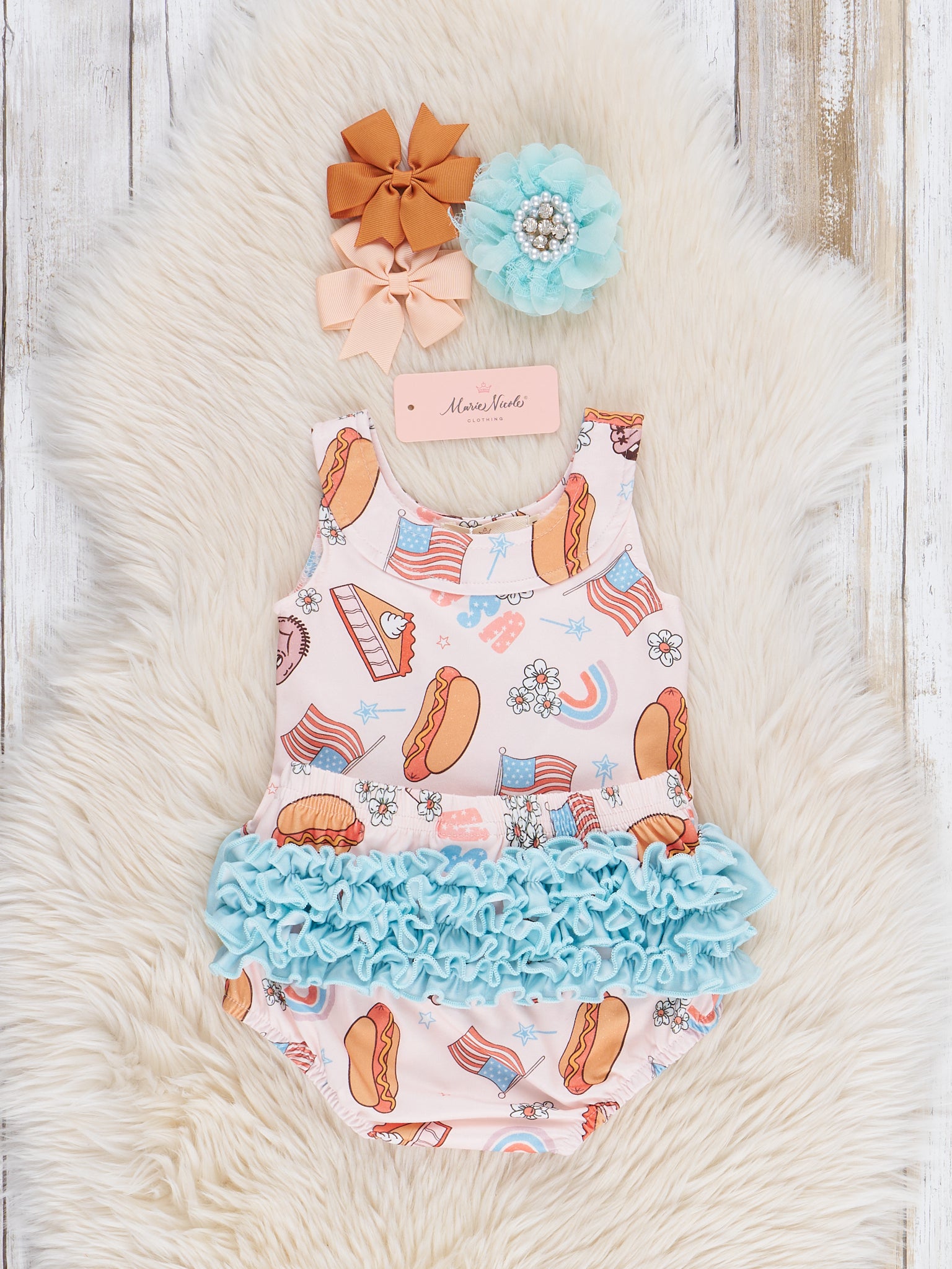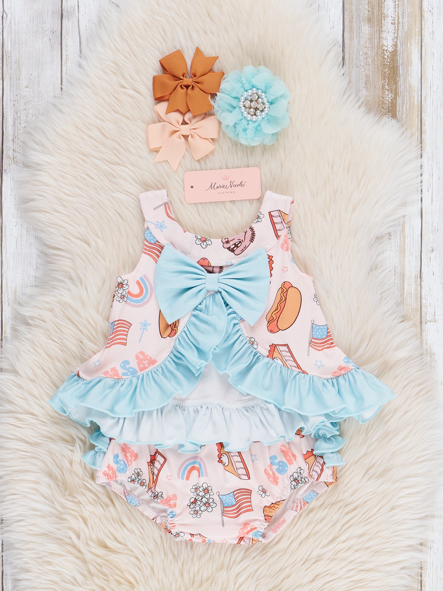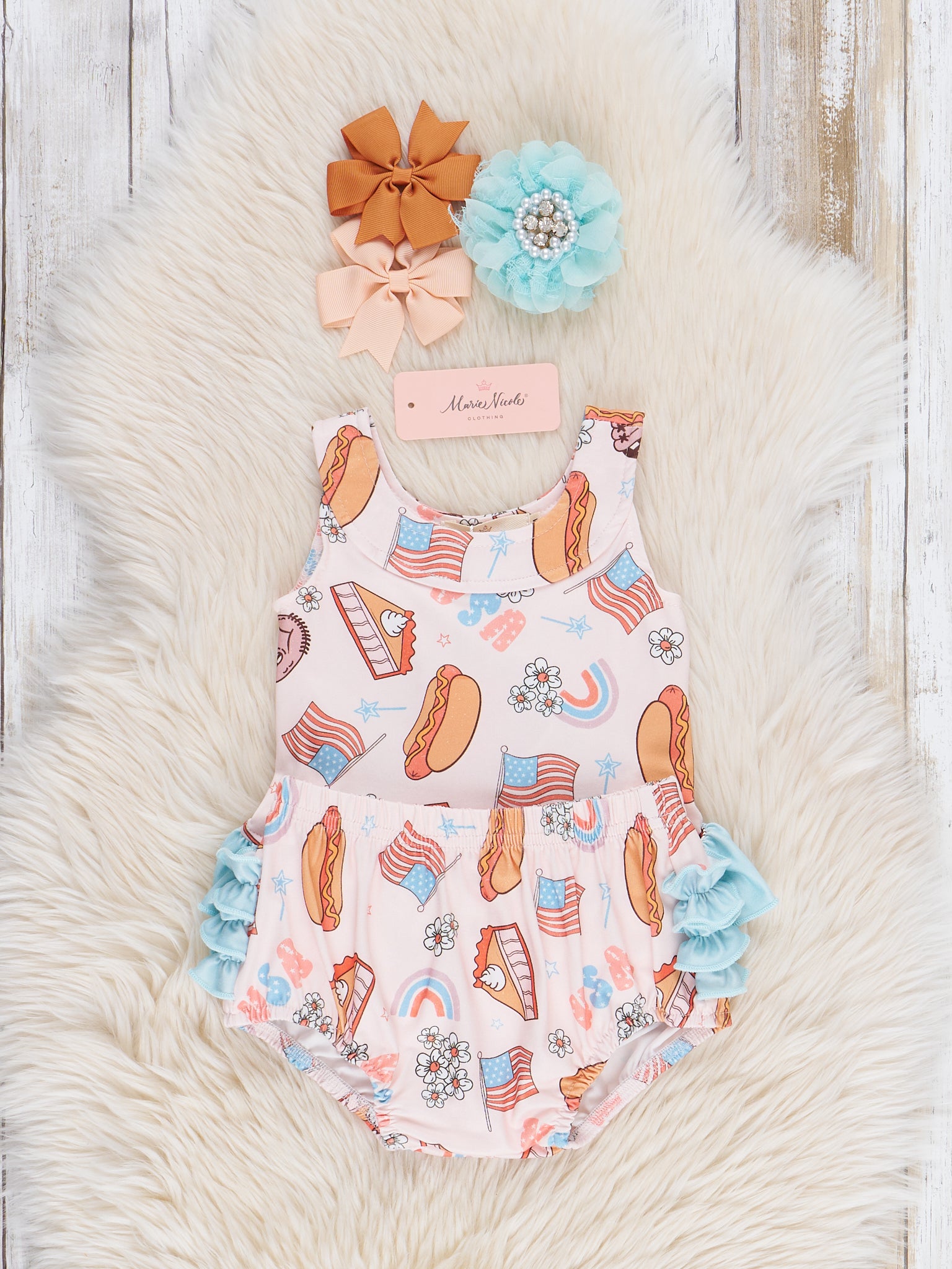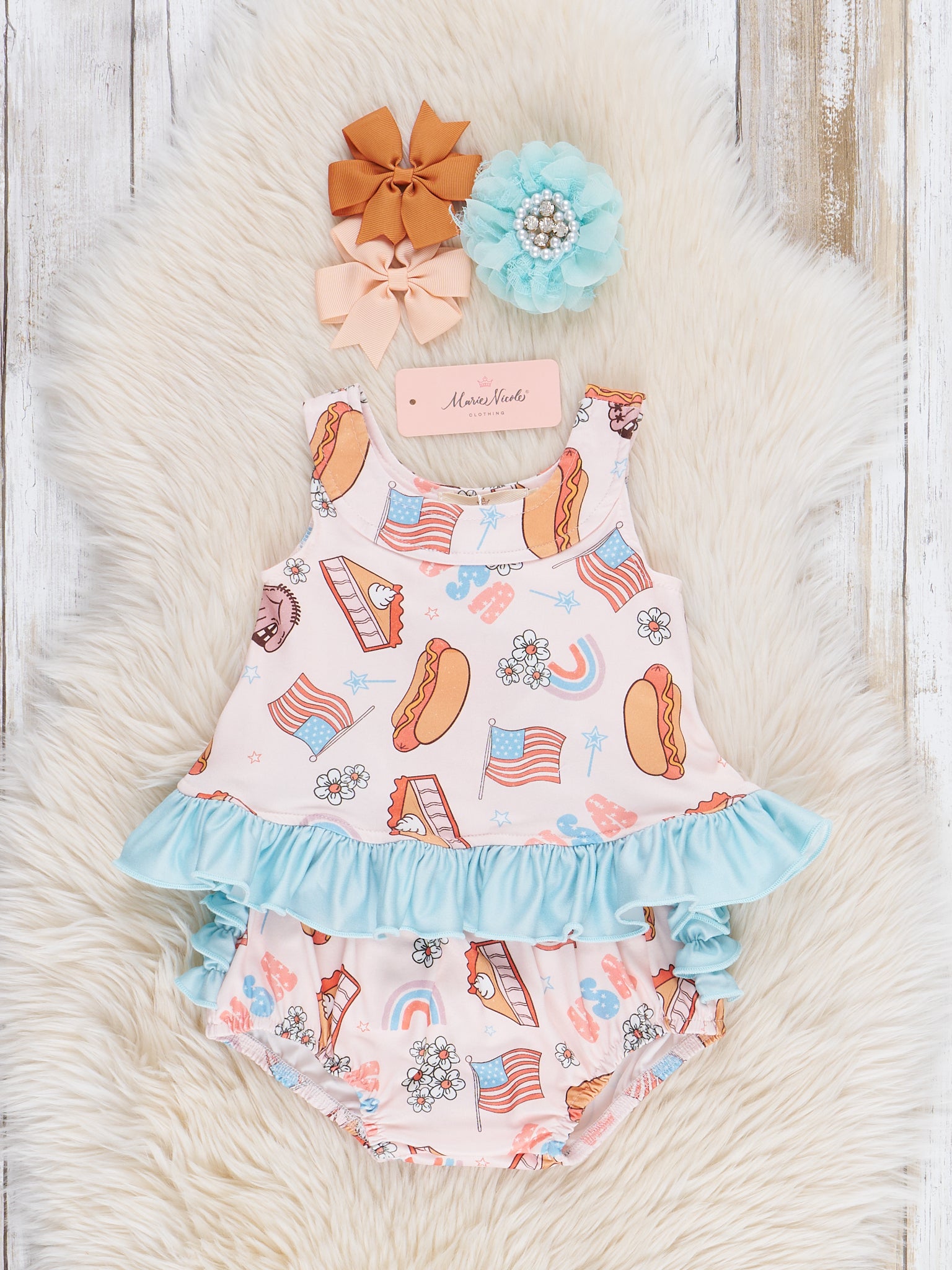 Dress them up for a 4th of July celebration fit for a patriot in this fun and festive Patriotic Party Ruffle Bloomers Outfit by Marie Nicole Clothing! It's perfect for both picnics and parties, with a ruffle tank top, comfy bloomers, and a patriotic party pattern that will have them feeling all-American in no time! Who knew patriotism could look so cute?