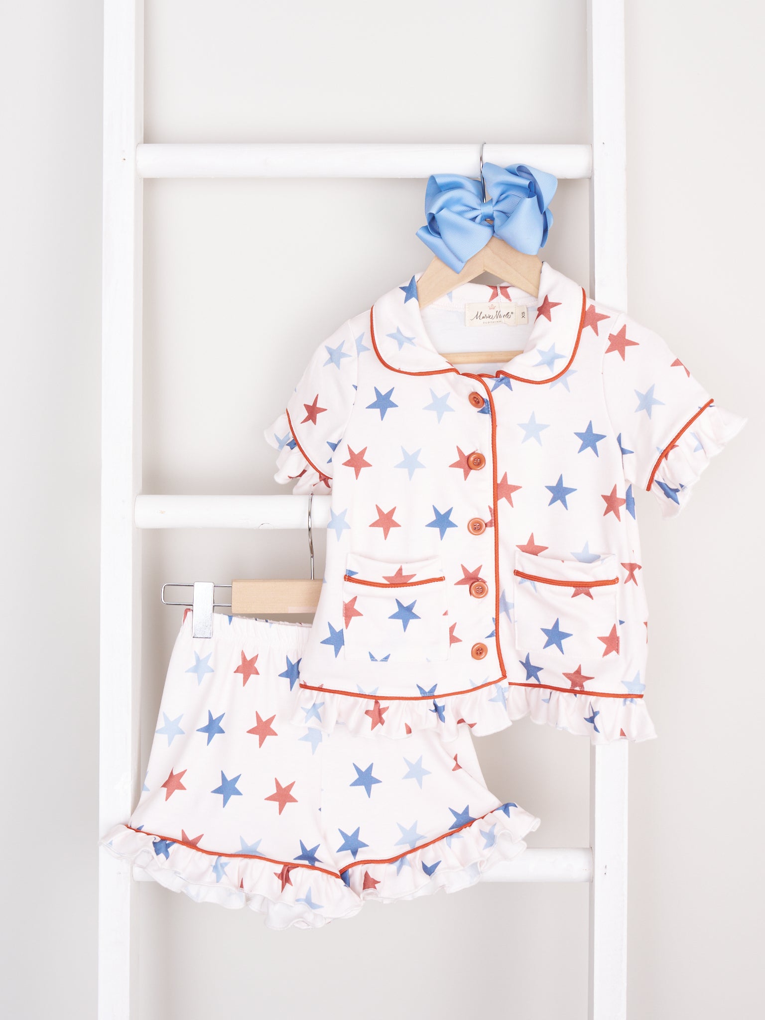 Let your kiddos show off their pride in style with these Patriotic Star Pajamas! These comfy jammies come with pockets, elastic waistband, and a unique twist of fun - ruffles on the girl's sets! Perfect for a fun, patriotic night of sleep!