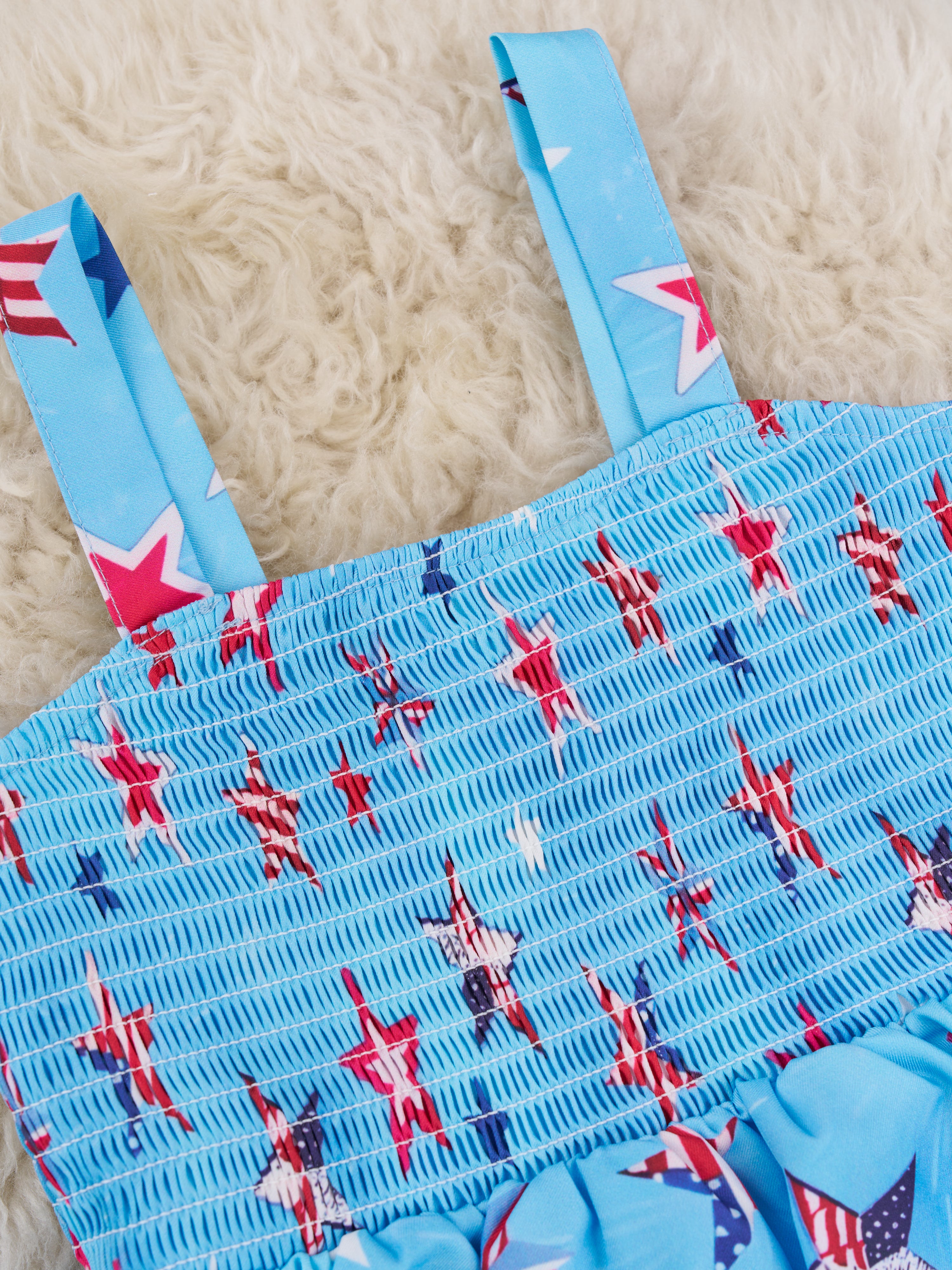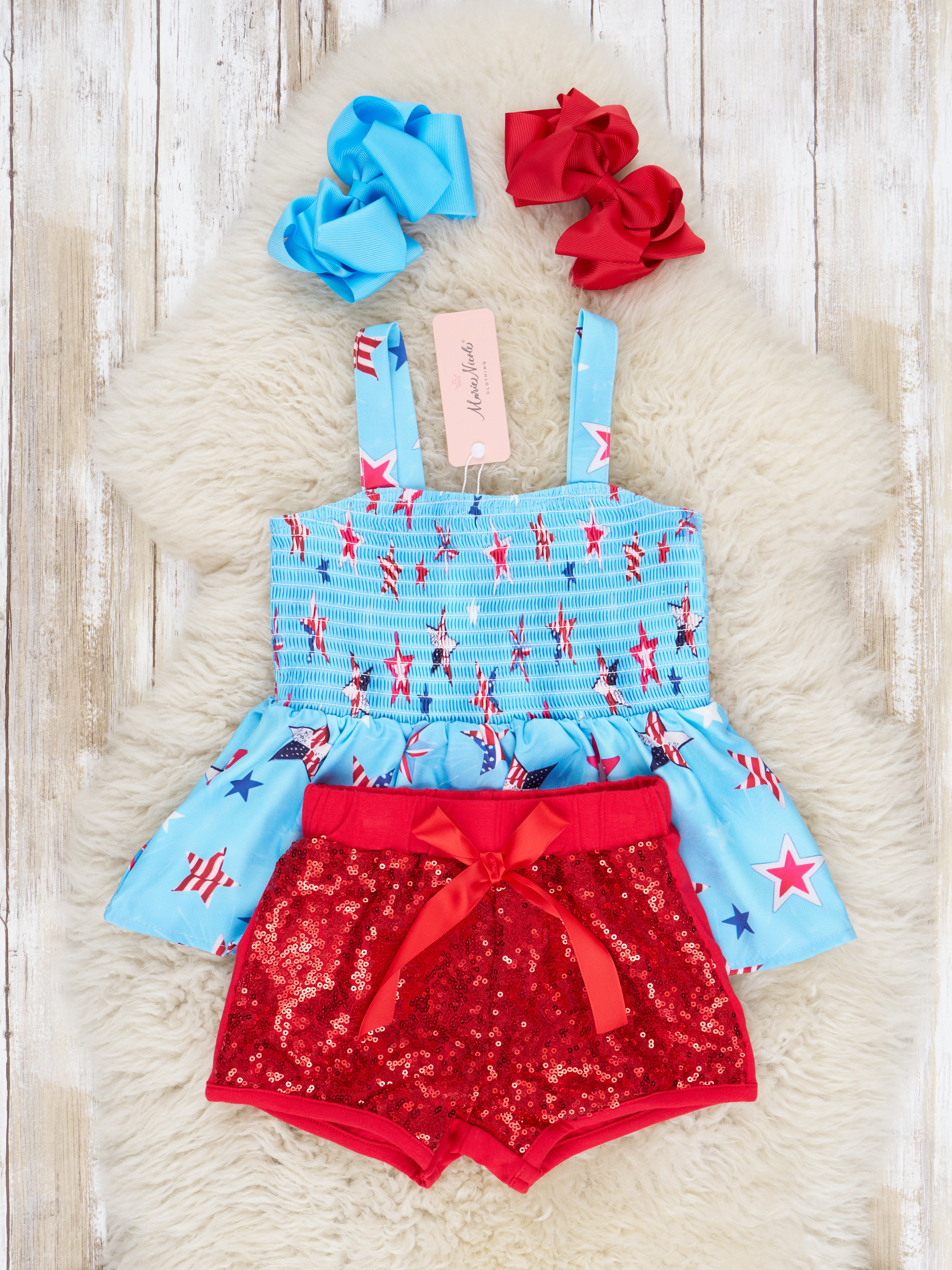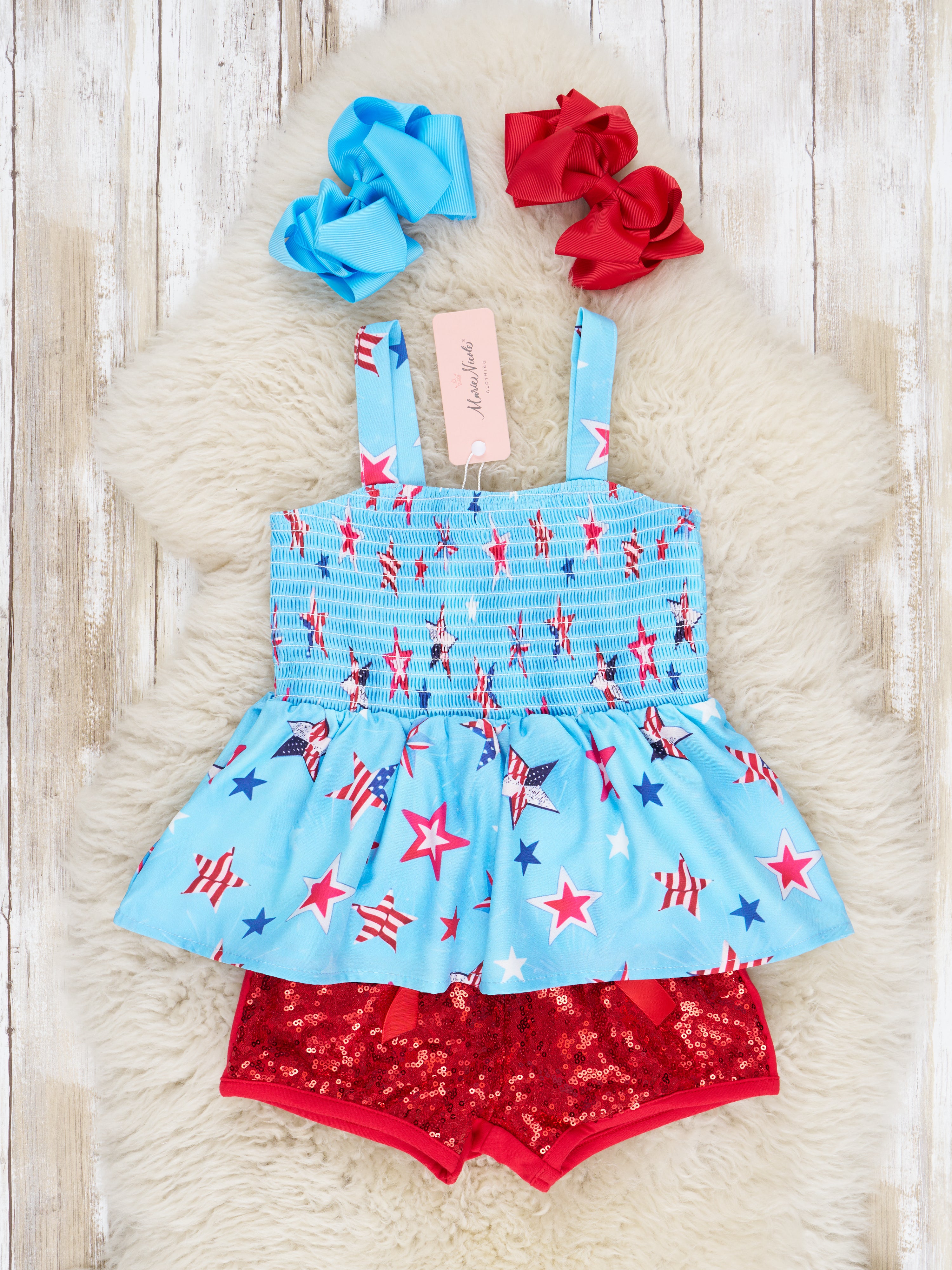 Show your little star some love with this Patriotic Stars Smocked Sequin Outfit! With a blue top featuring smocking and a star pattern, plus red sequin shorts with an elastic waistband - you'll have your little patriot ready to shine bright in no time.