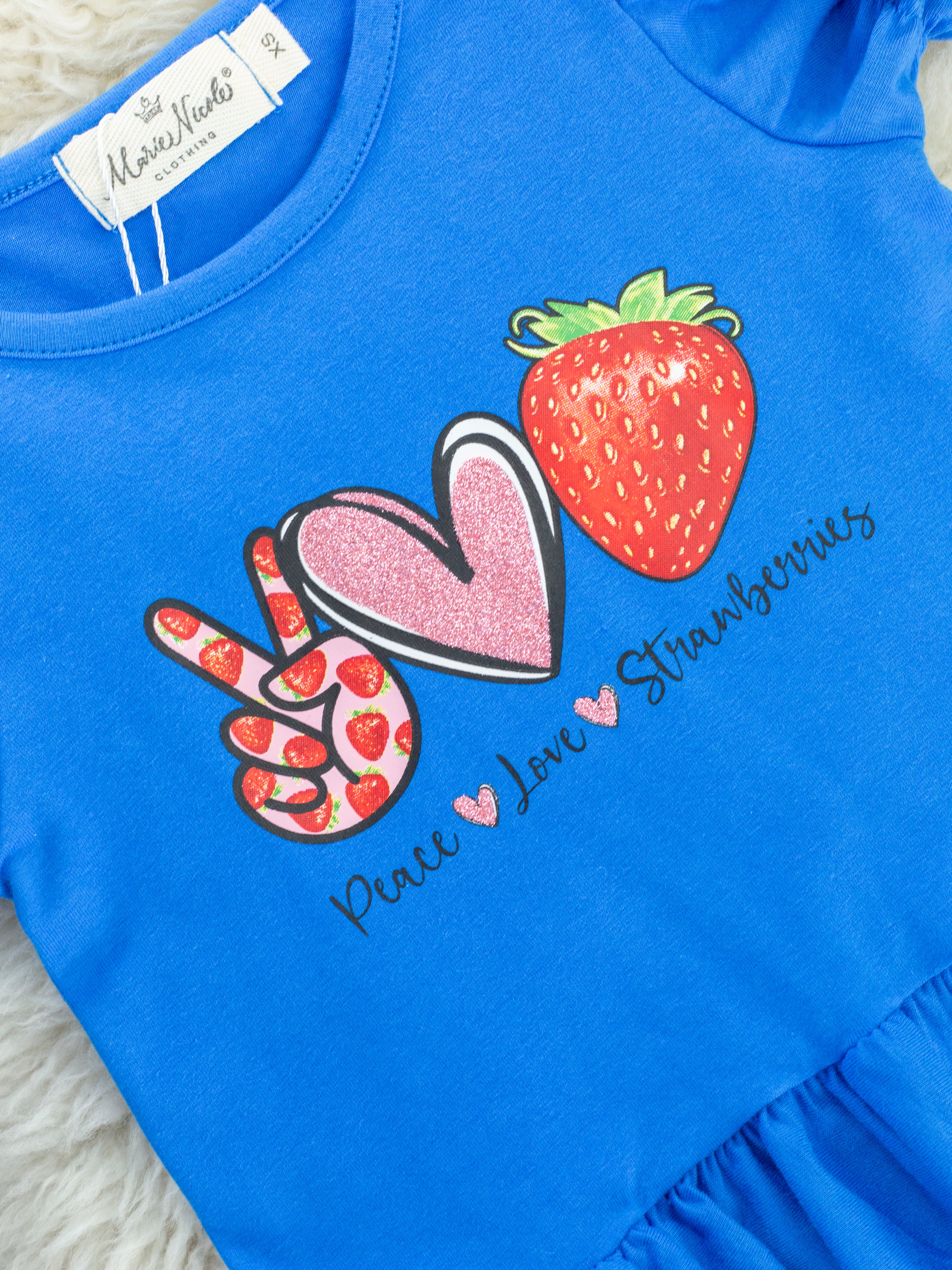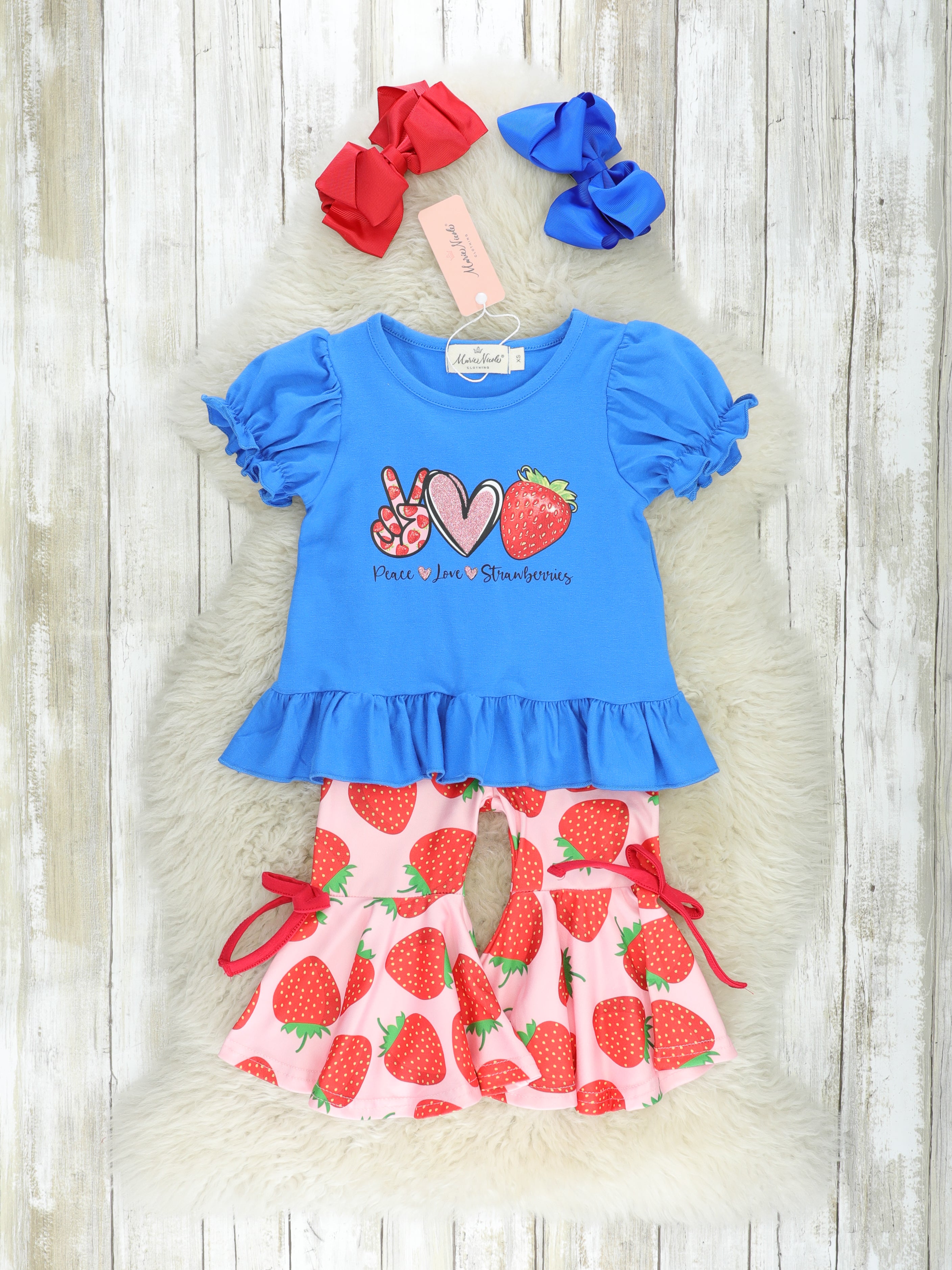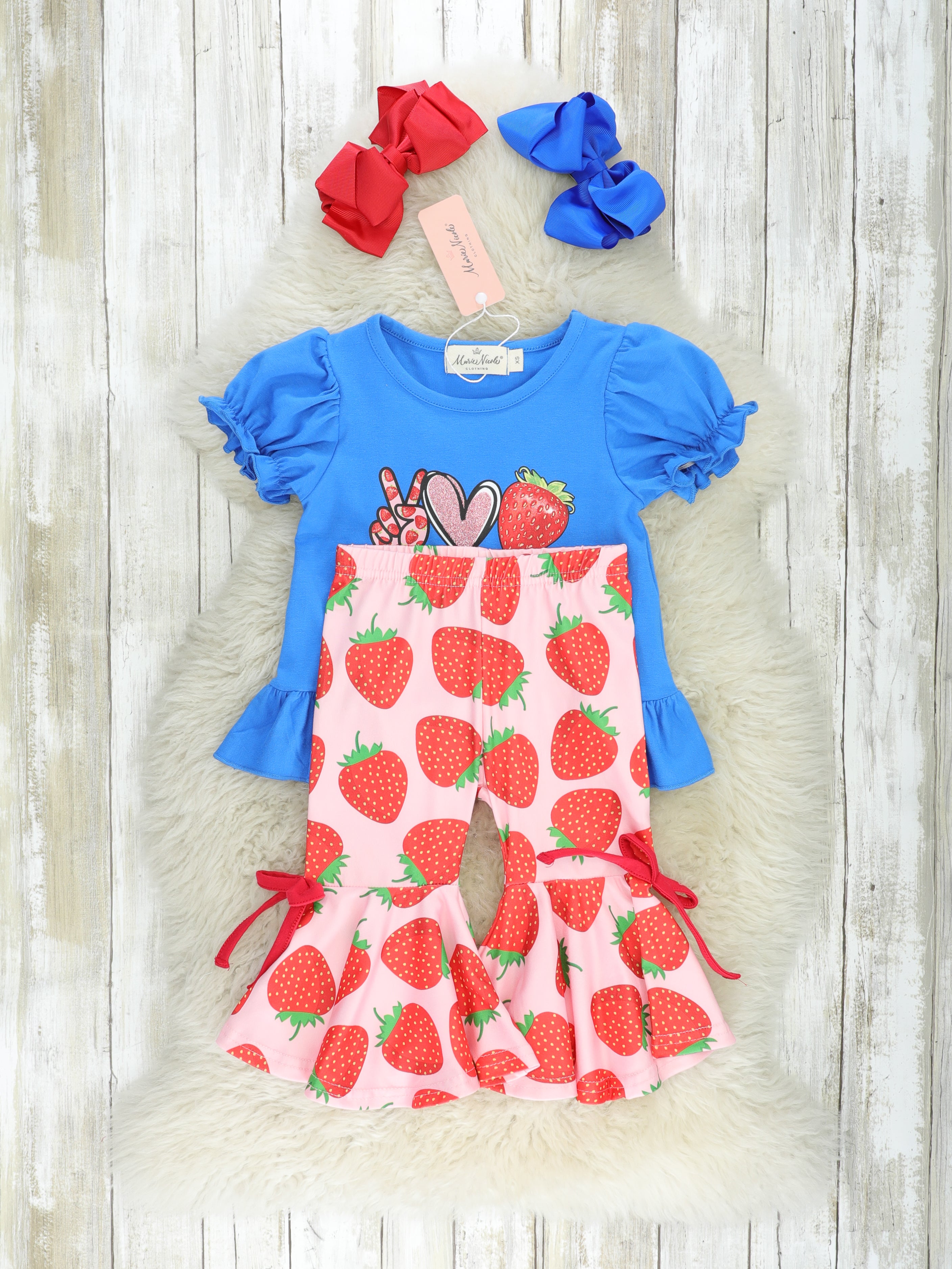 Let your little ones express themselves in this whimsical Sibling Set -- Peace, Love, Strawberry! Featuring ruffles and a vibrant strawberry pattern, it's just the right amount of sass. Plus, bow details and bell bottoms make the look complete. Both will enjoy peace, love, and plenty of style.