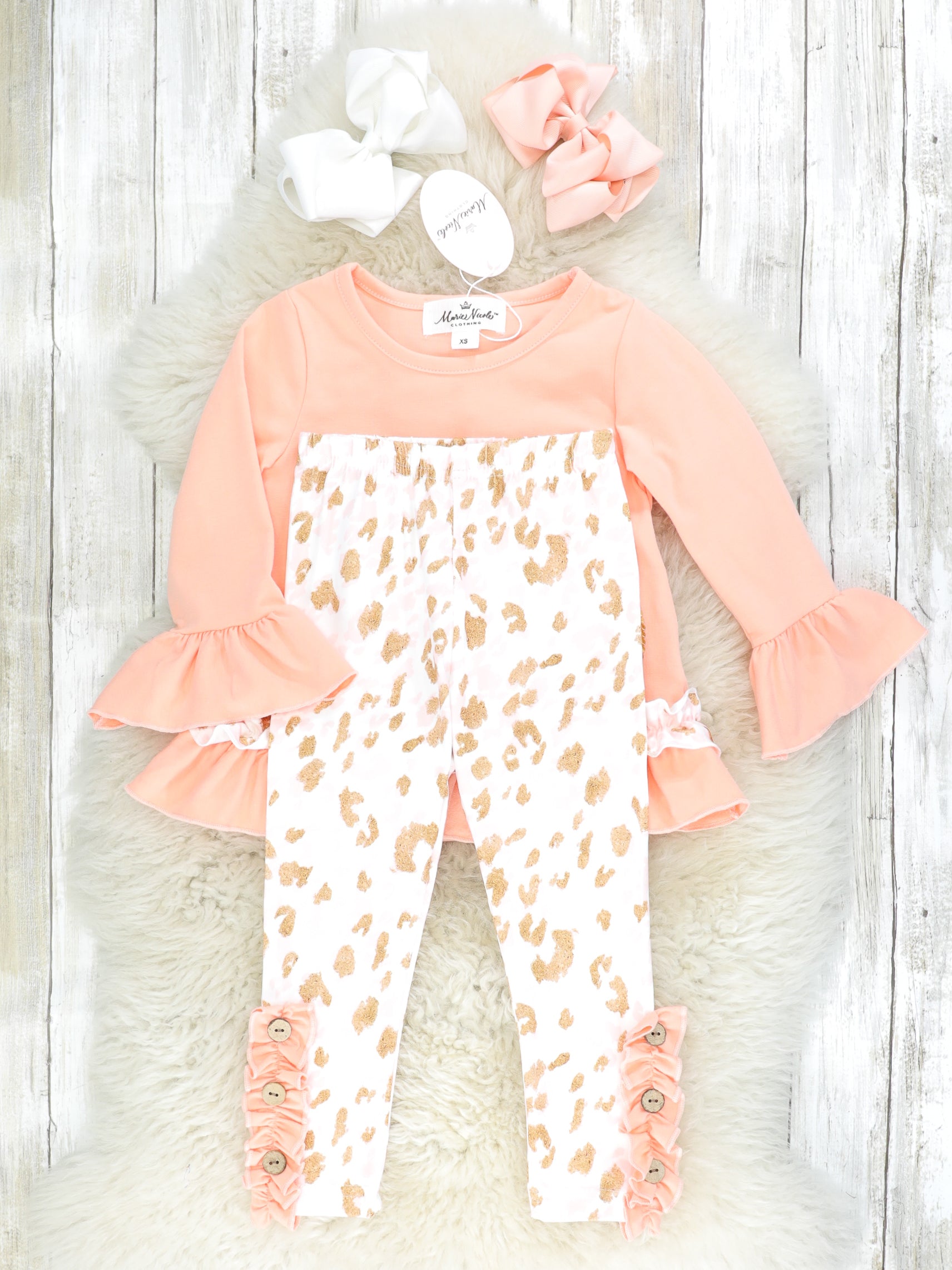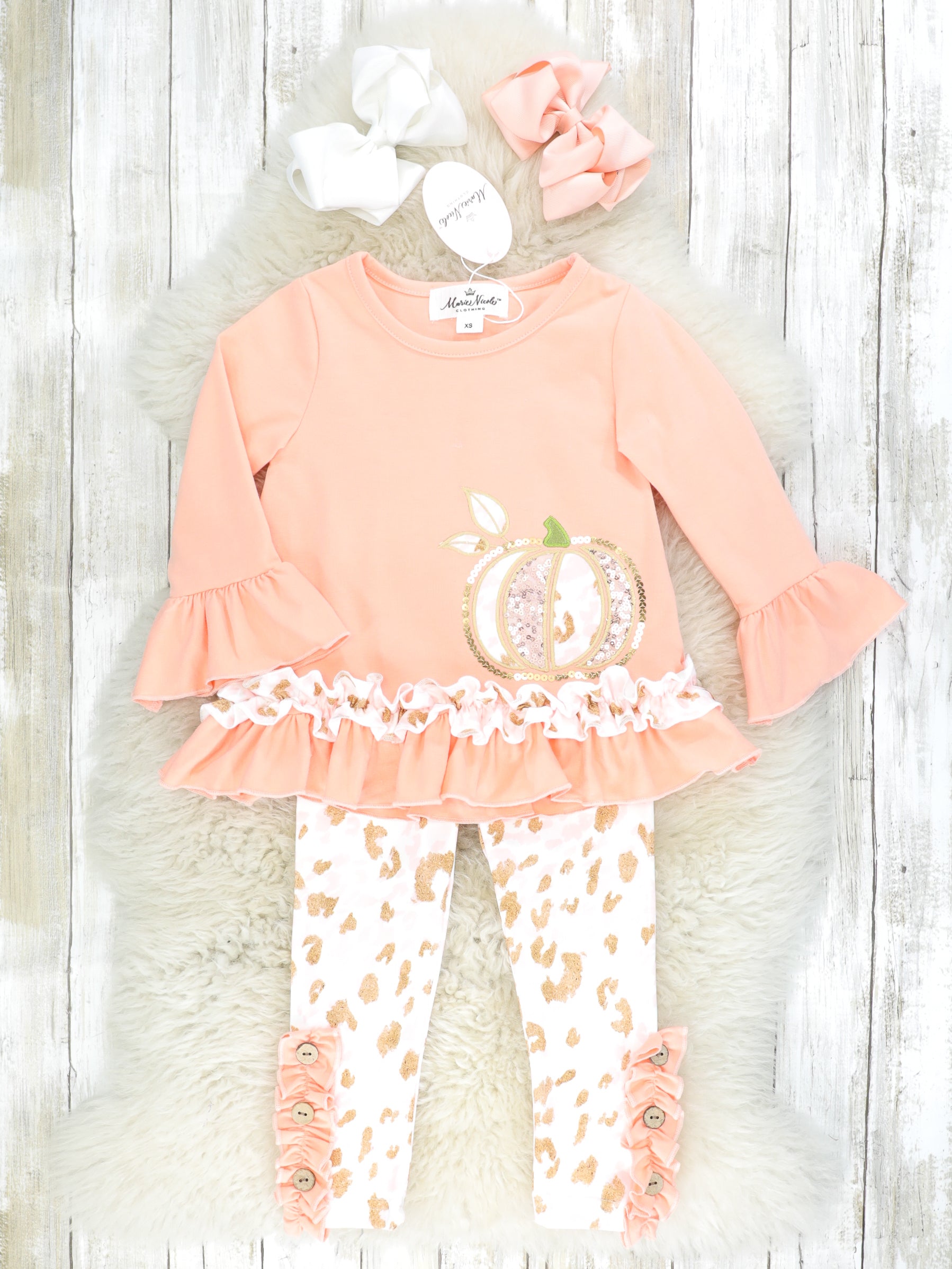 This peachy sister set is worth more than gold! This outfit features a peach top with bell sleeves, ruffle trim, a gold pumpkin detail, & leopard leggings with decorative buttons at the ankles.