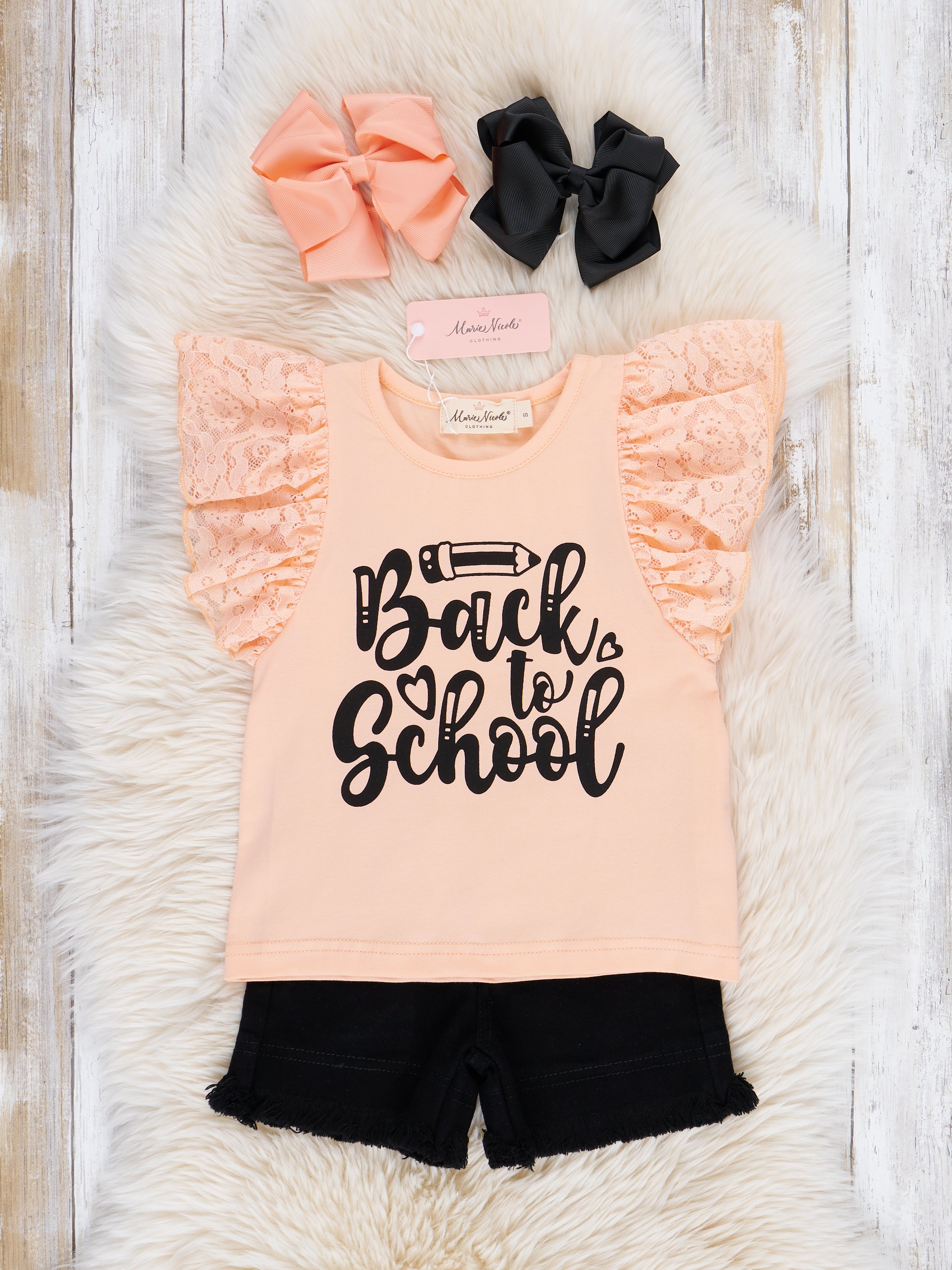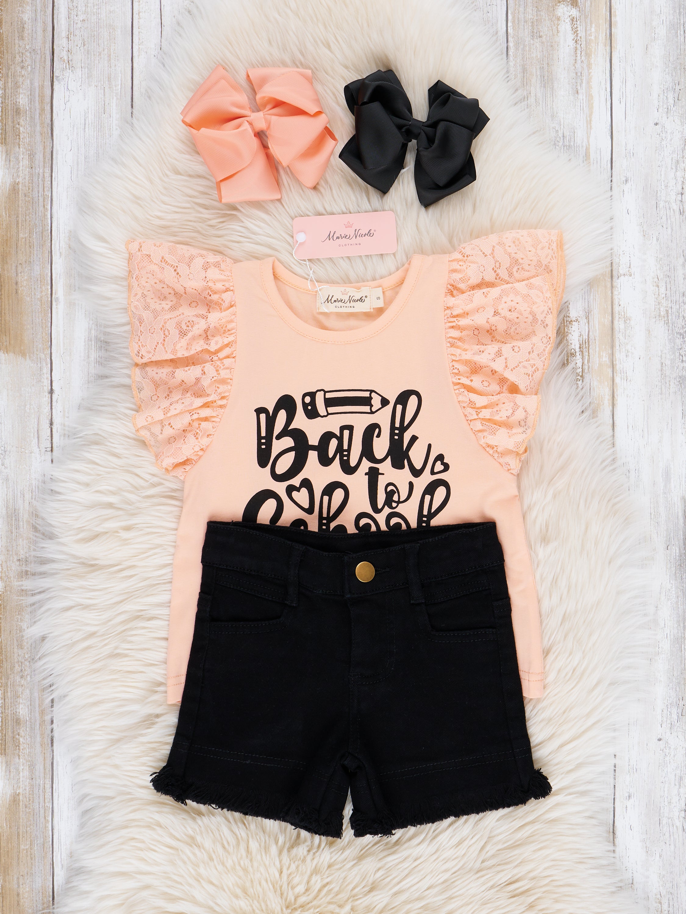 Make the first day of school a breeze with our Peach & Black "Back to School" Outfit. The peach lace ruffle sleeve top adds a touch of sweetness while the black shorts keep it cool and practical. Perfect for girls who want to make a statement while staying comfortable.