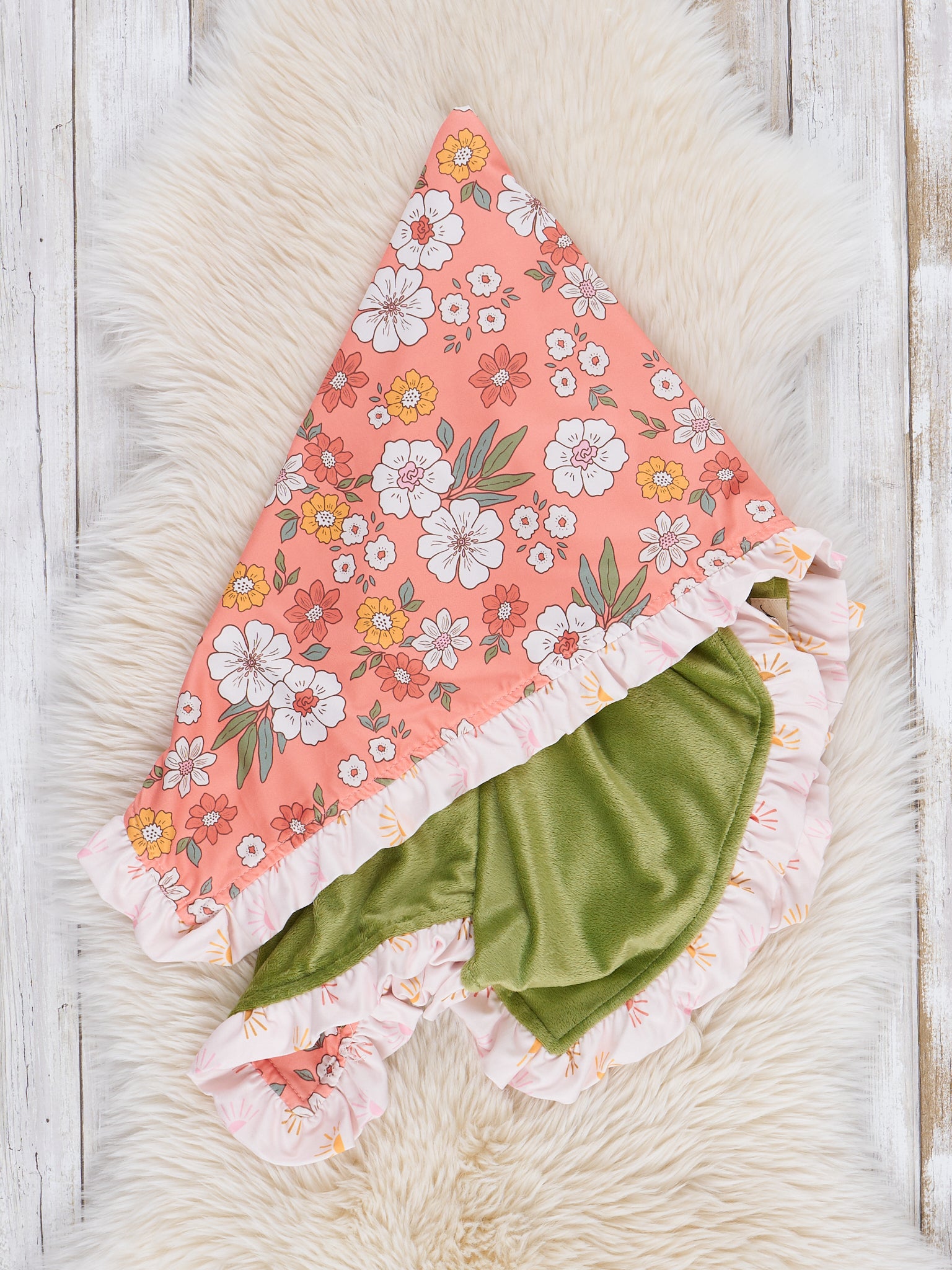 Peach & Green Daisy Garden Ruffle Minky Blanket