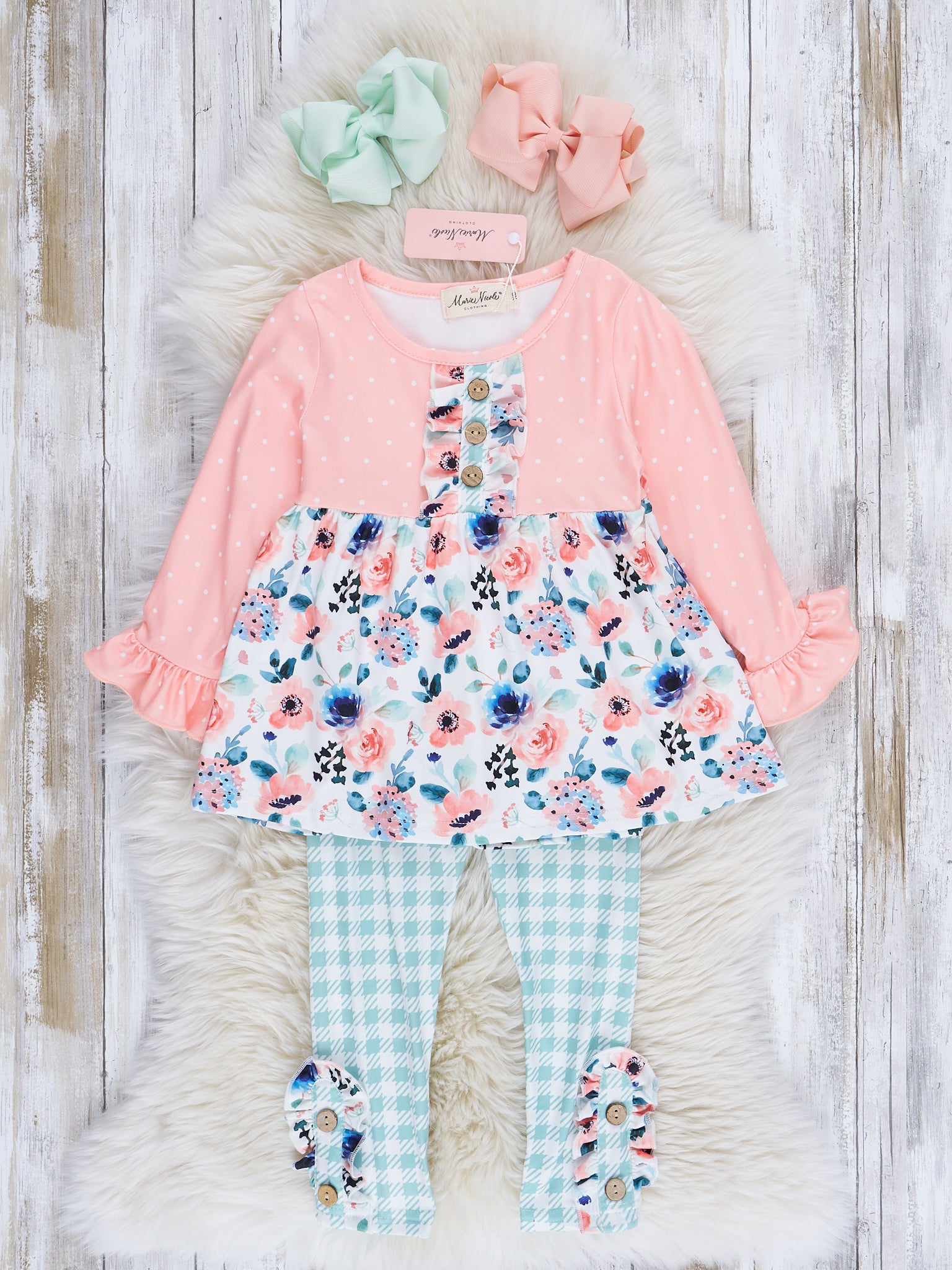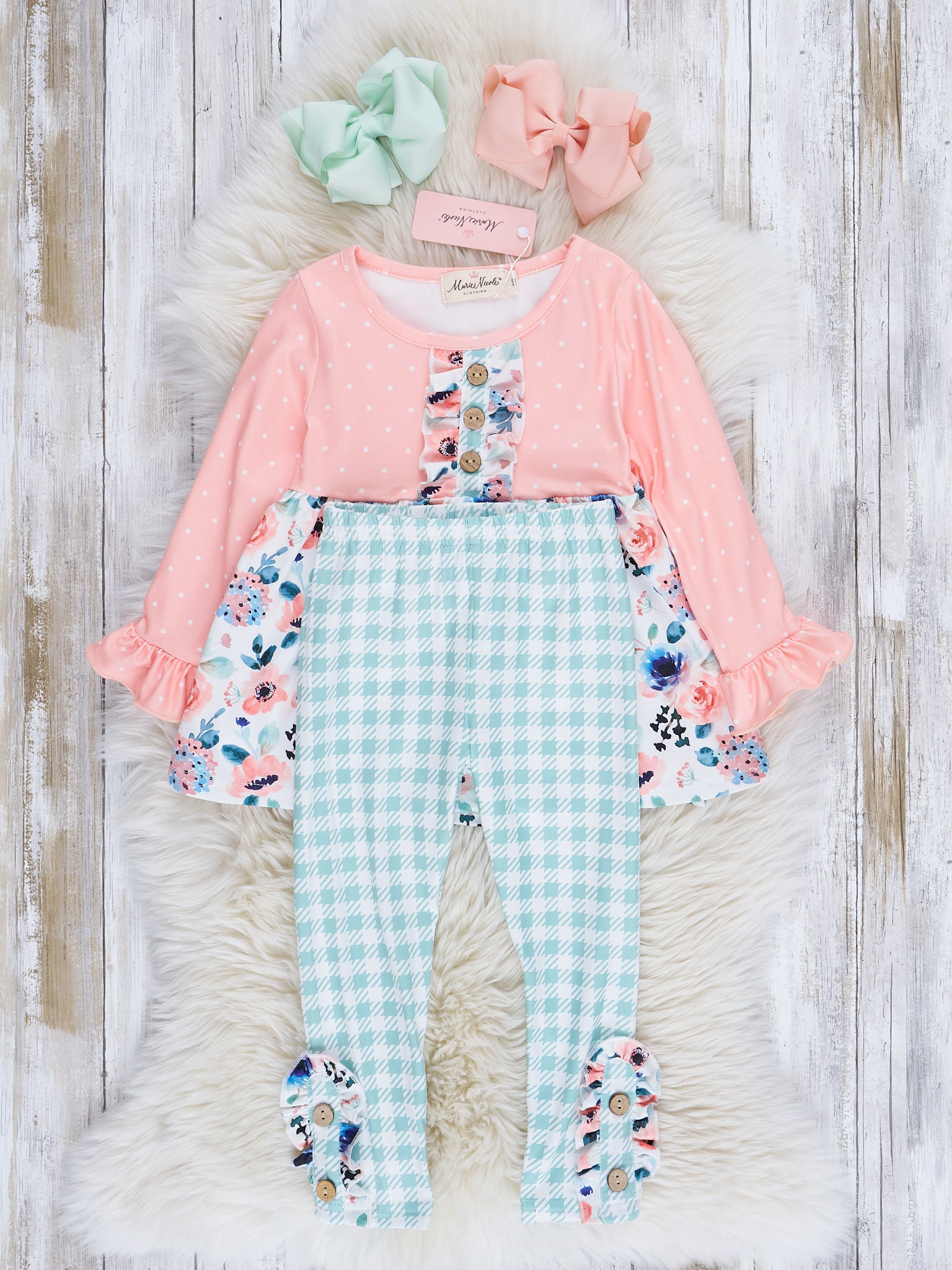 Our Peach & Mint Floral Ruffle sister set is the perfect transitional weather look! With mint gingham ruffle leggings, the flouncy floral & pink polka dot top is just the cherry on top! And don't forget the wooden buttons to finish off the look! She'll be looking Sweet and Sassy!