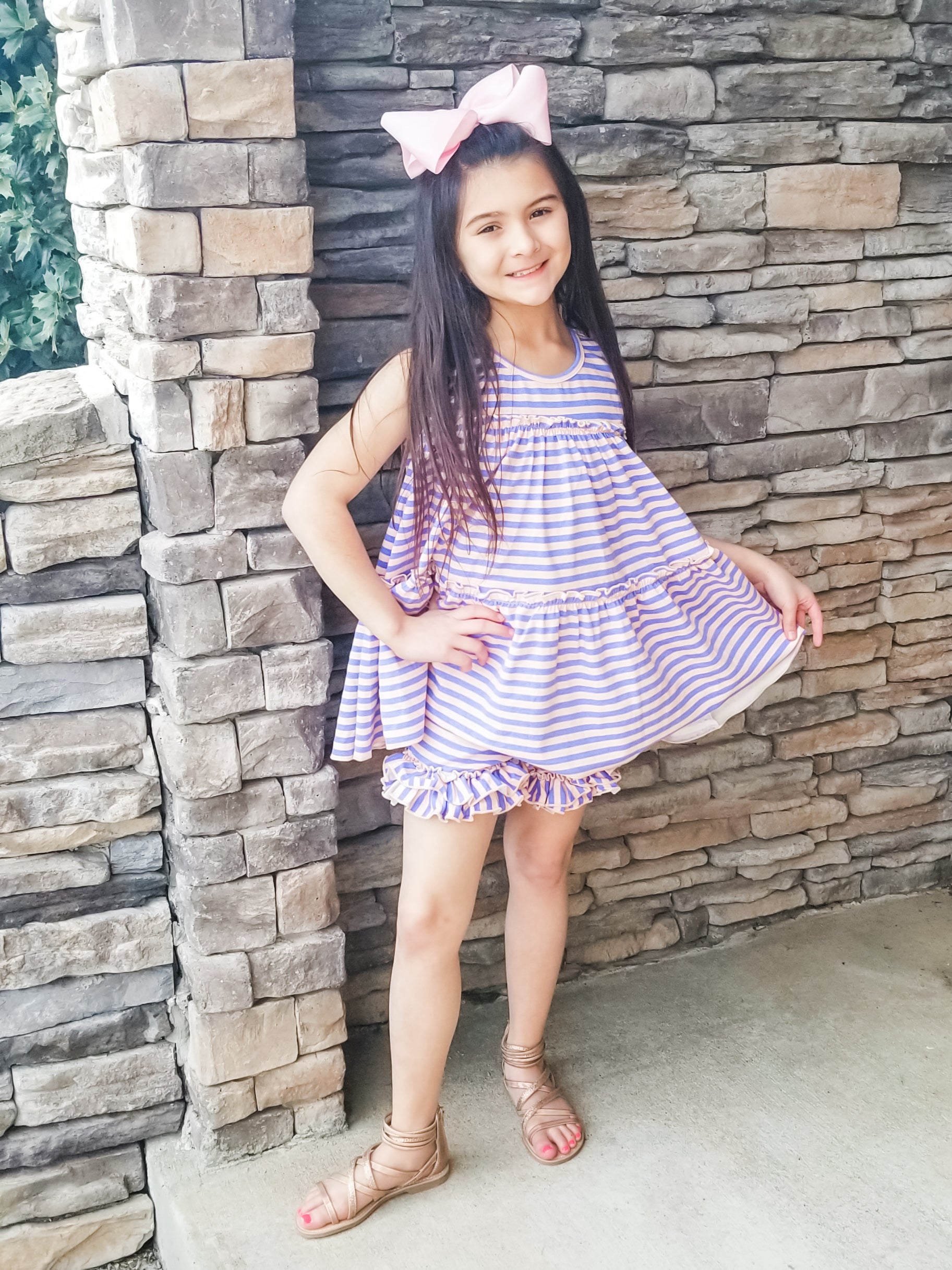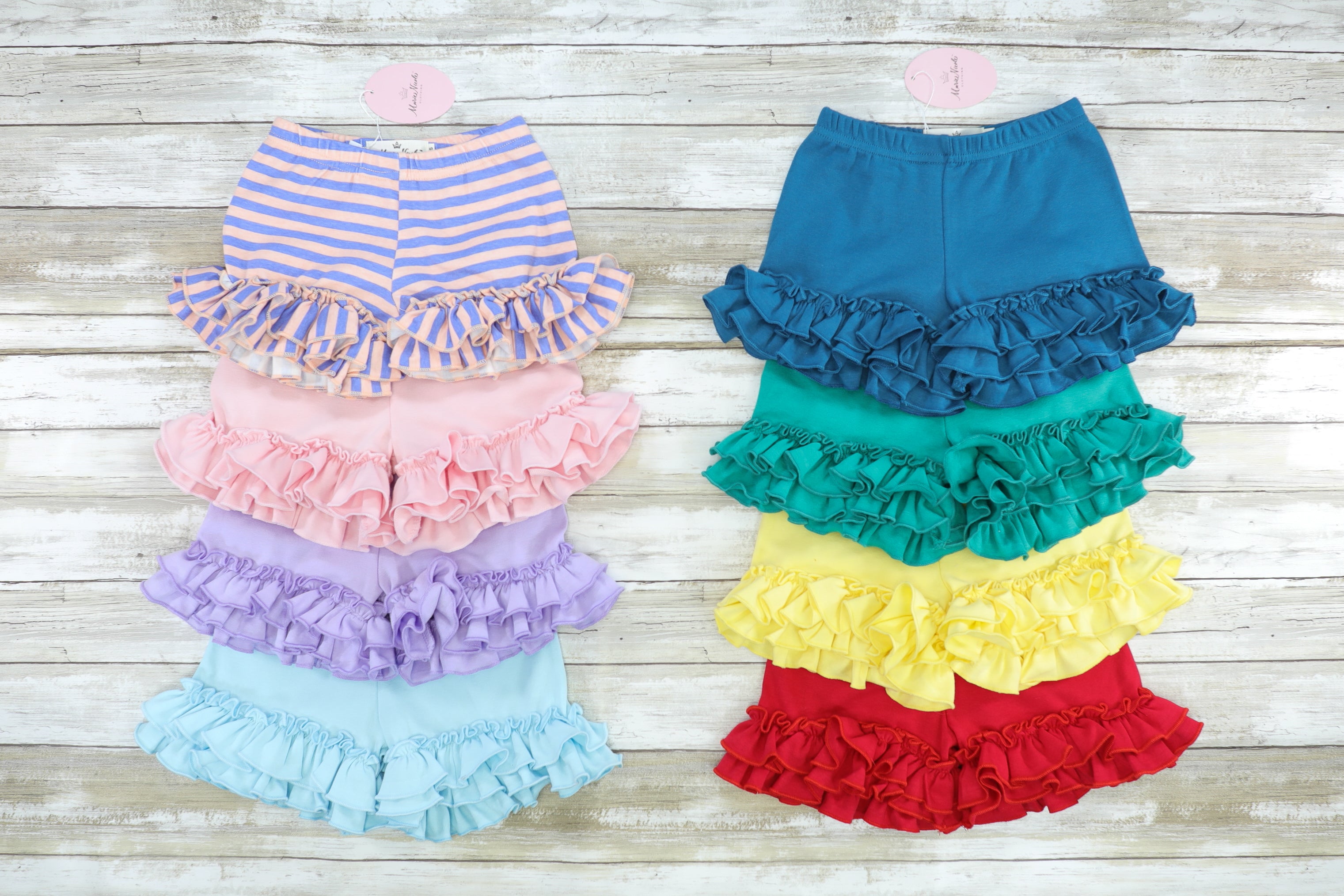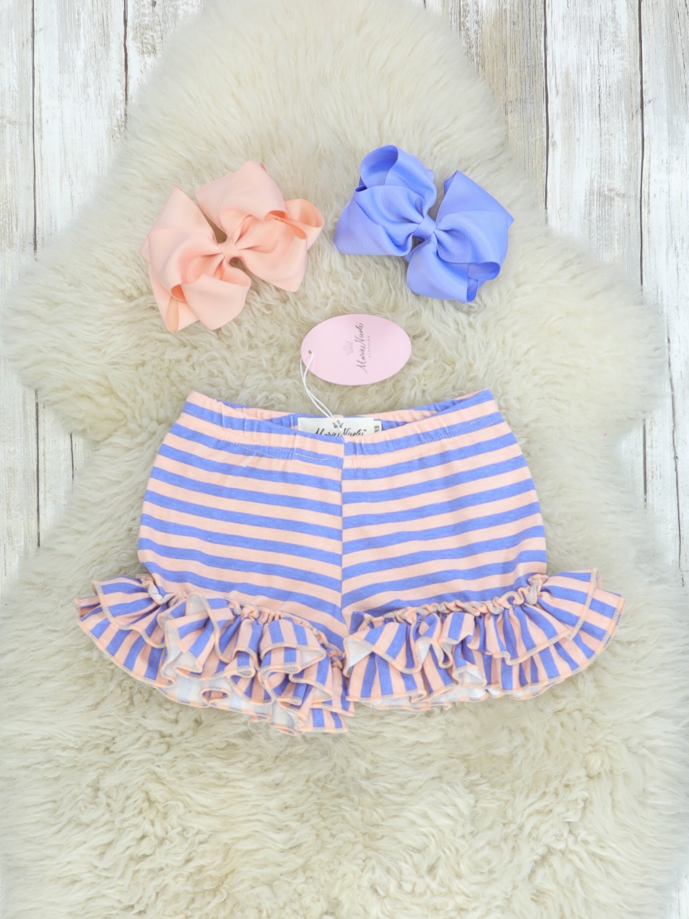 MNC's classic ruffle shorts in pretty peach and orchid striped!