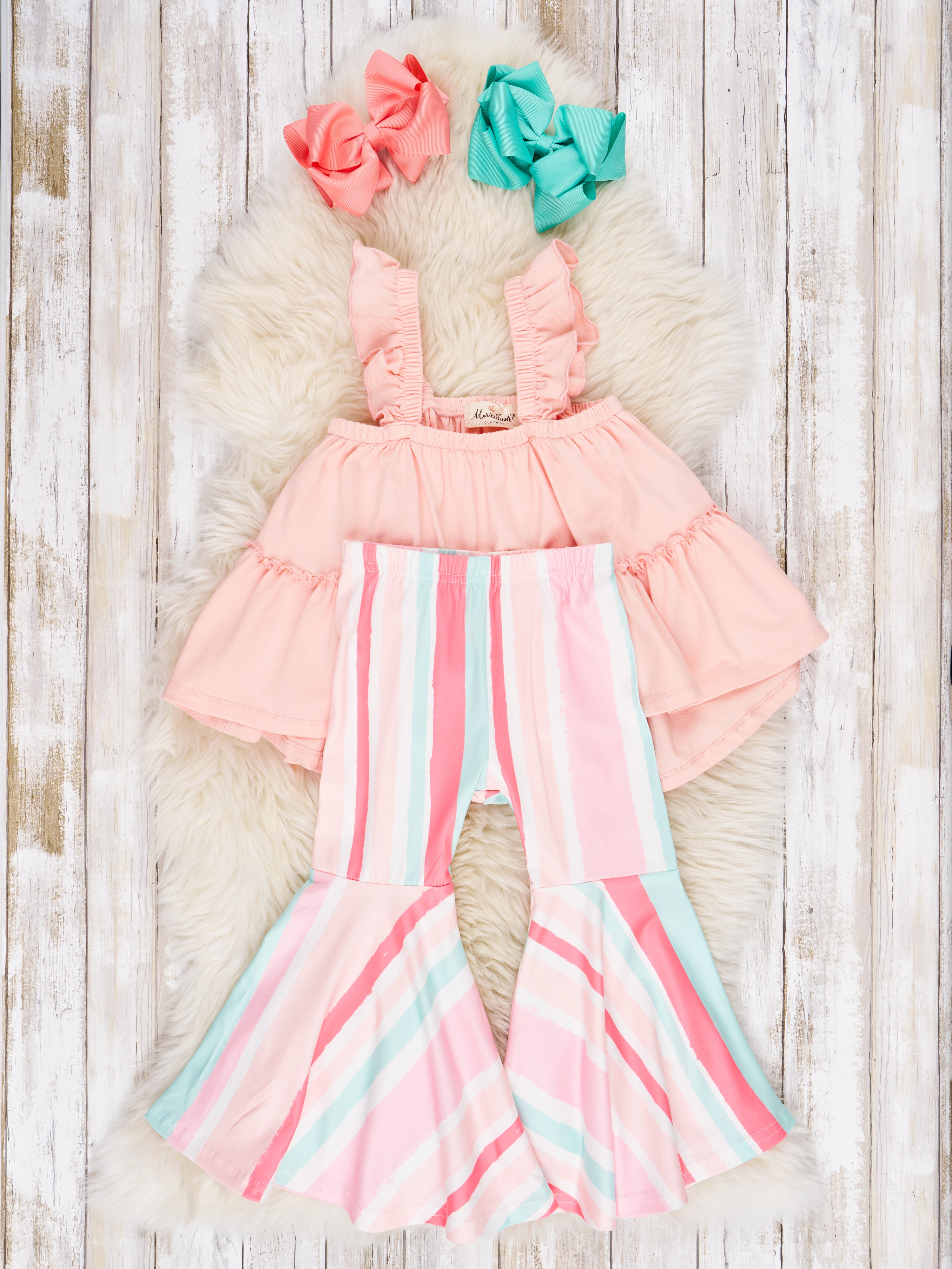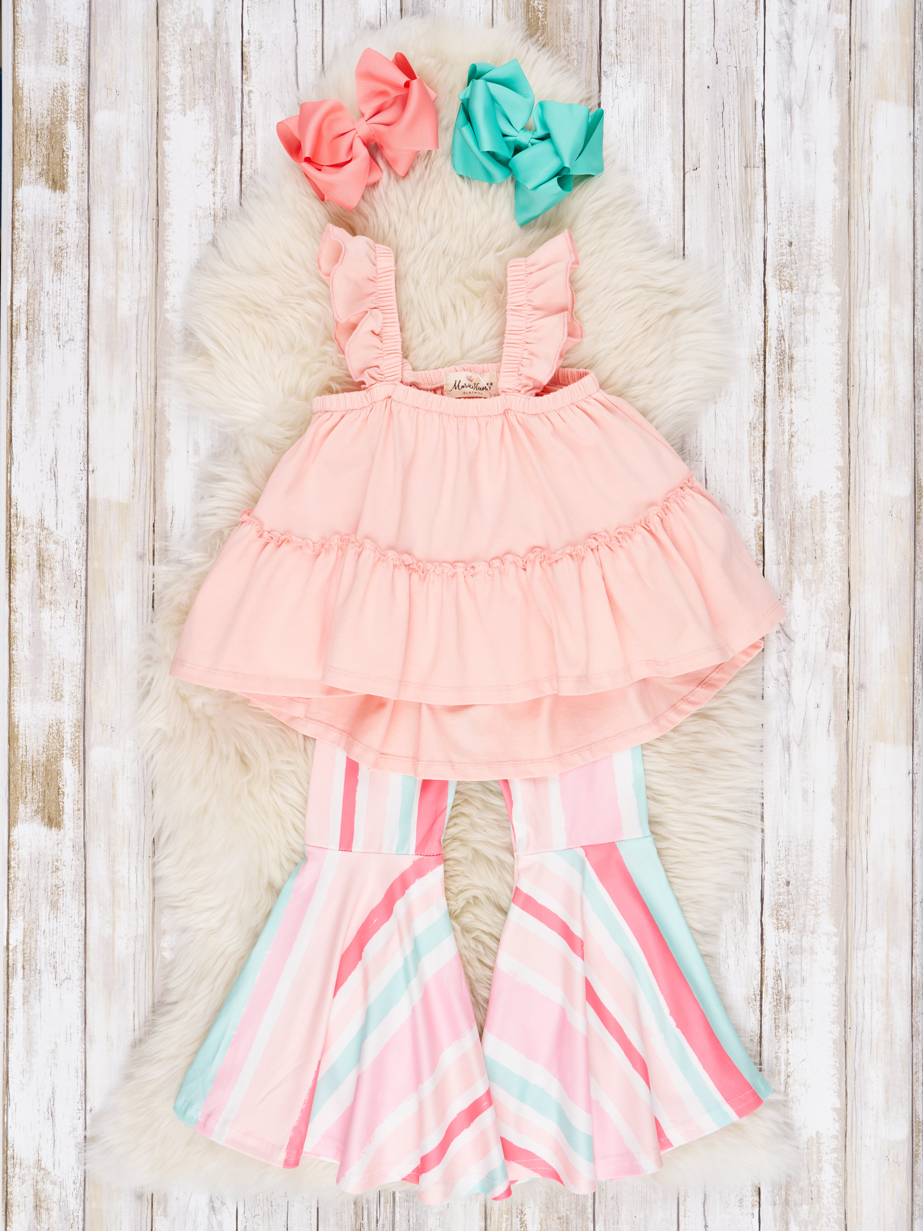 This Peach Tiered Ruffle Tank & Bell Bottoms Outfit is guaranteed to make your kiddo the life of the party! Let 'em show off their style with the tiered tank and cheerful stripes of the bell bottoms, complete with an elastic waist to make it so comfy they'll never want to take it off!