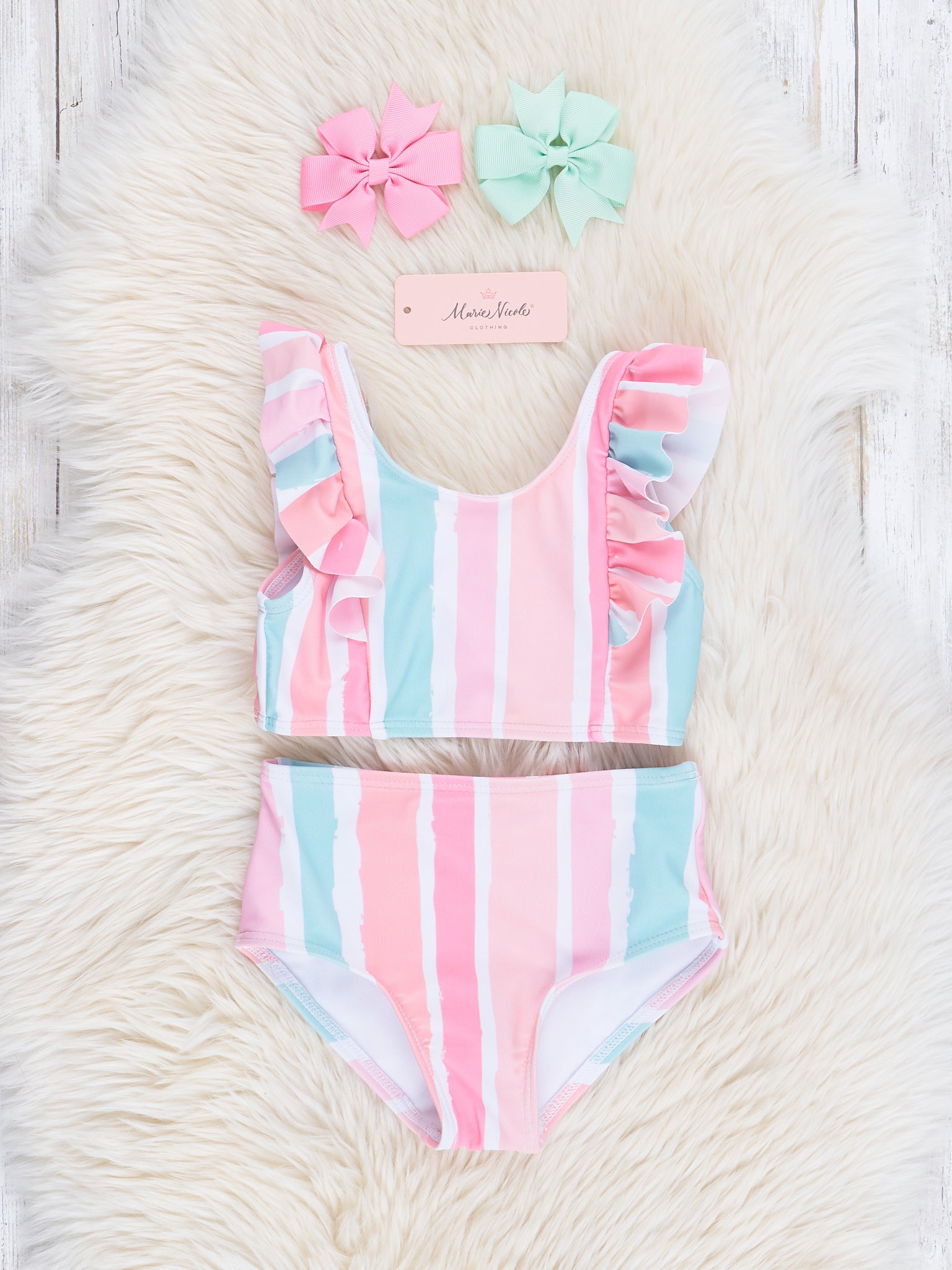 Get ready for some serious fun in the sun with our Peach & Turquoise Stripes Two-Piece Swimsuit! The ruffle shoulders add a touch of cuteness while the high waist design provides comfort & coverage. Perfect for any pool party or beach day, this swimsuit is sure to make a splash! 🌊