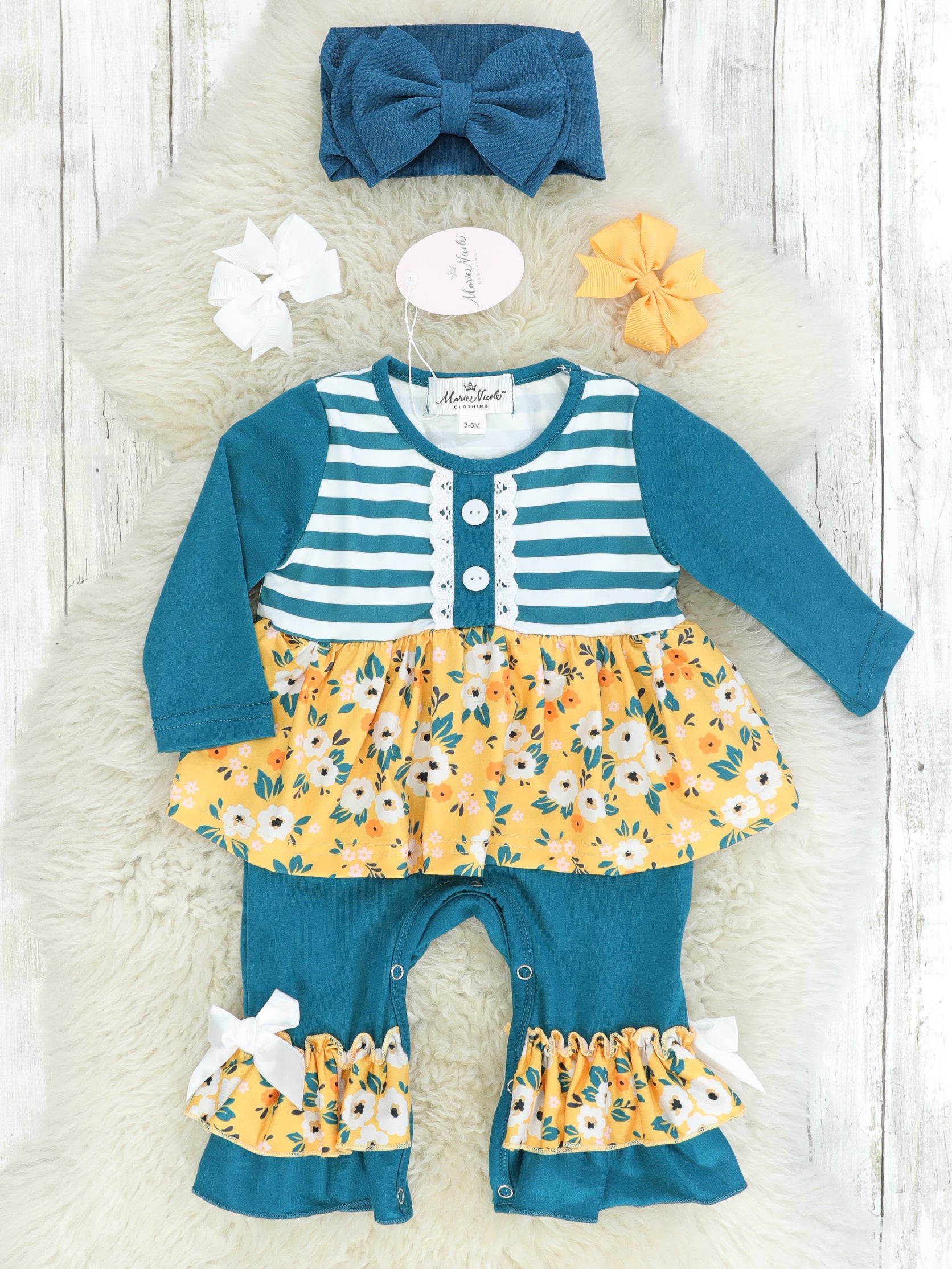 The cutest sibling set for all the kiddos! This floral romper features stripes, nonfunctional buttons, lace trim, & ruffles.