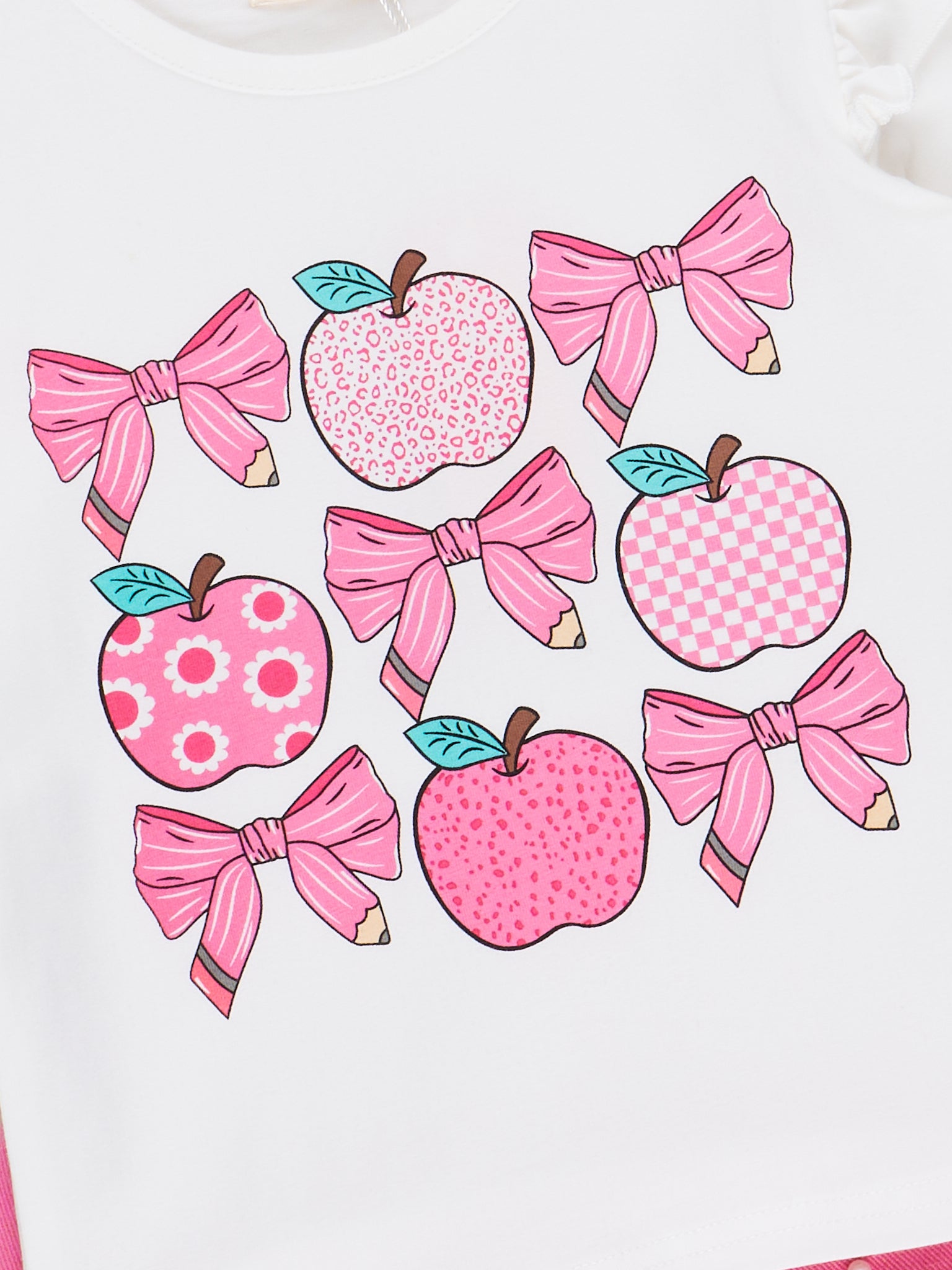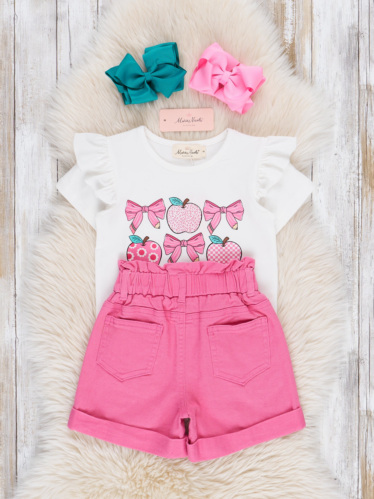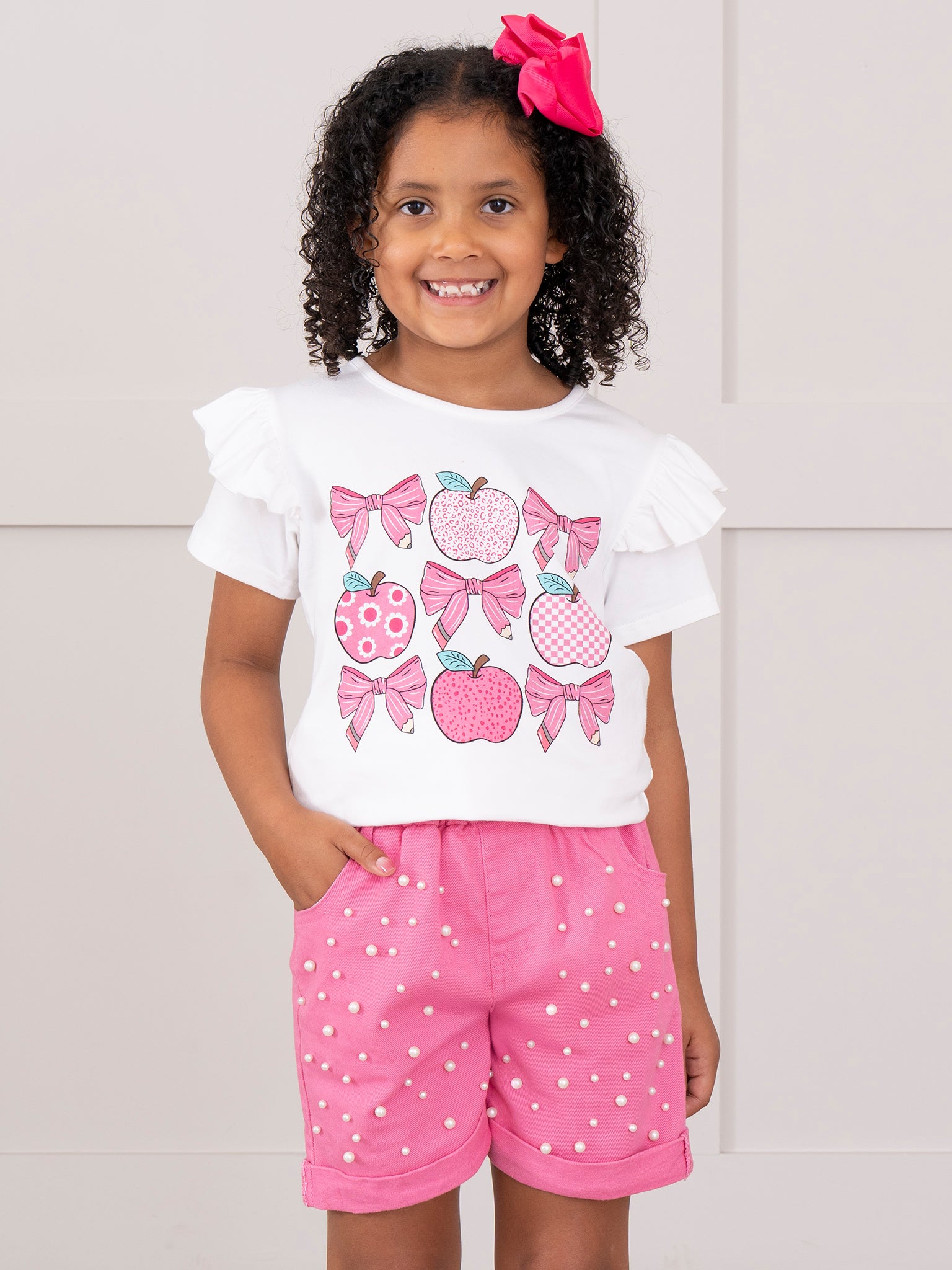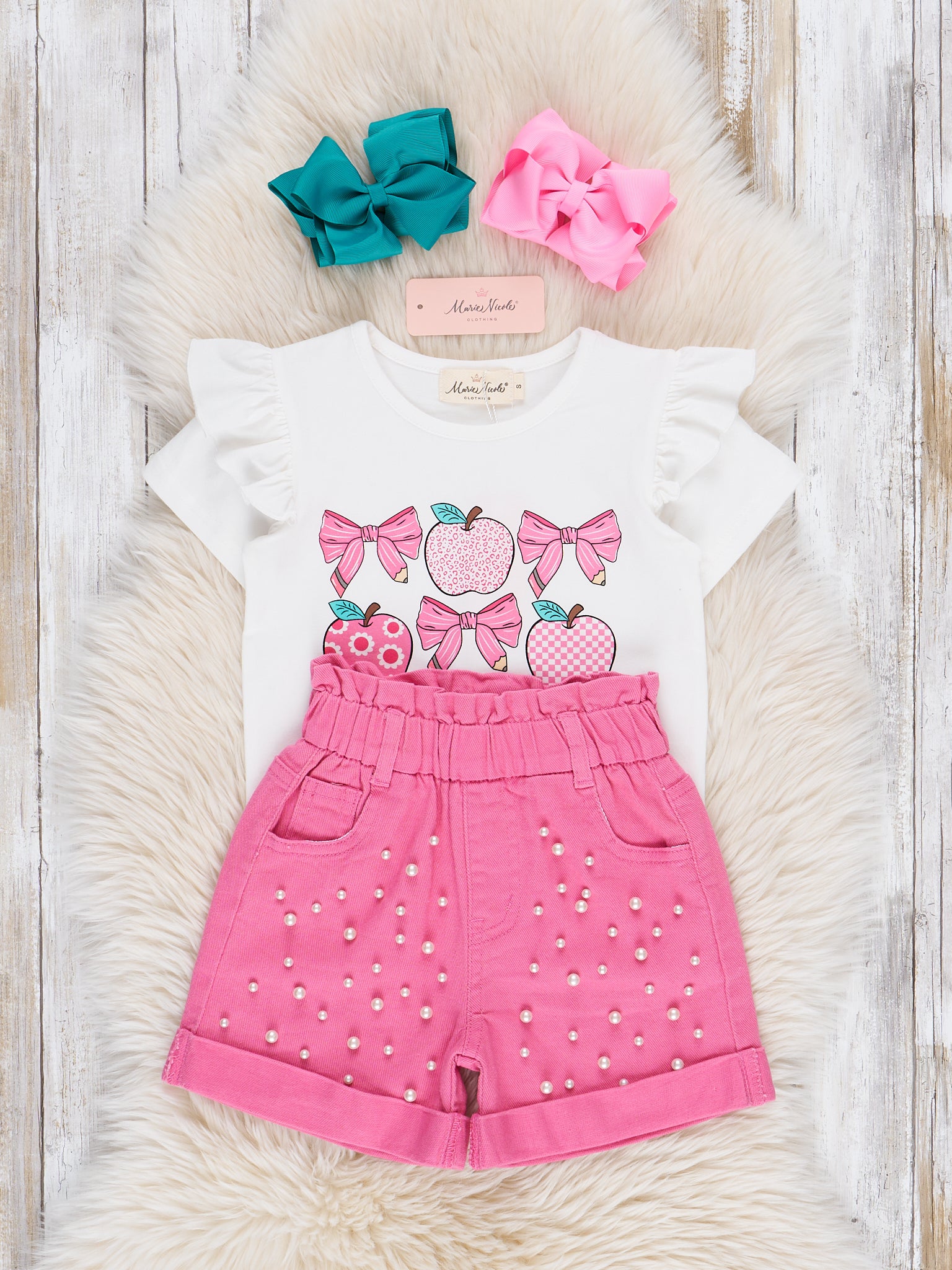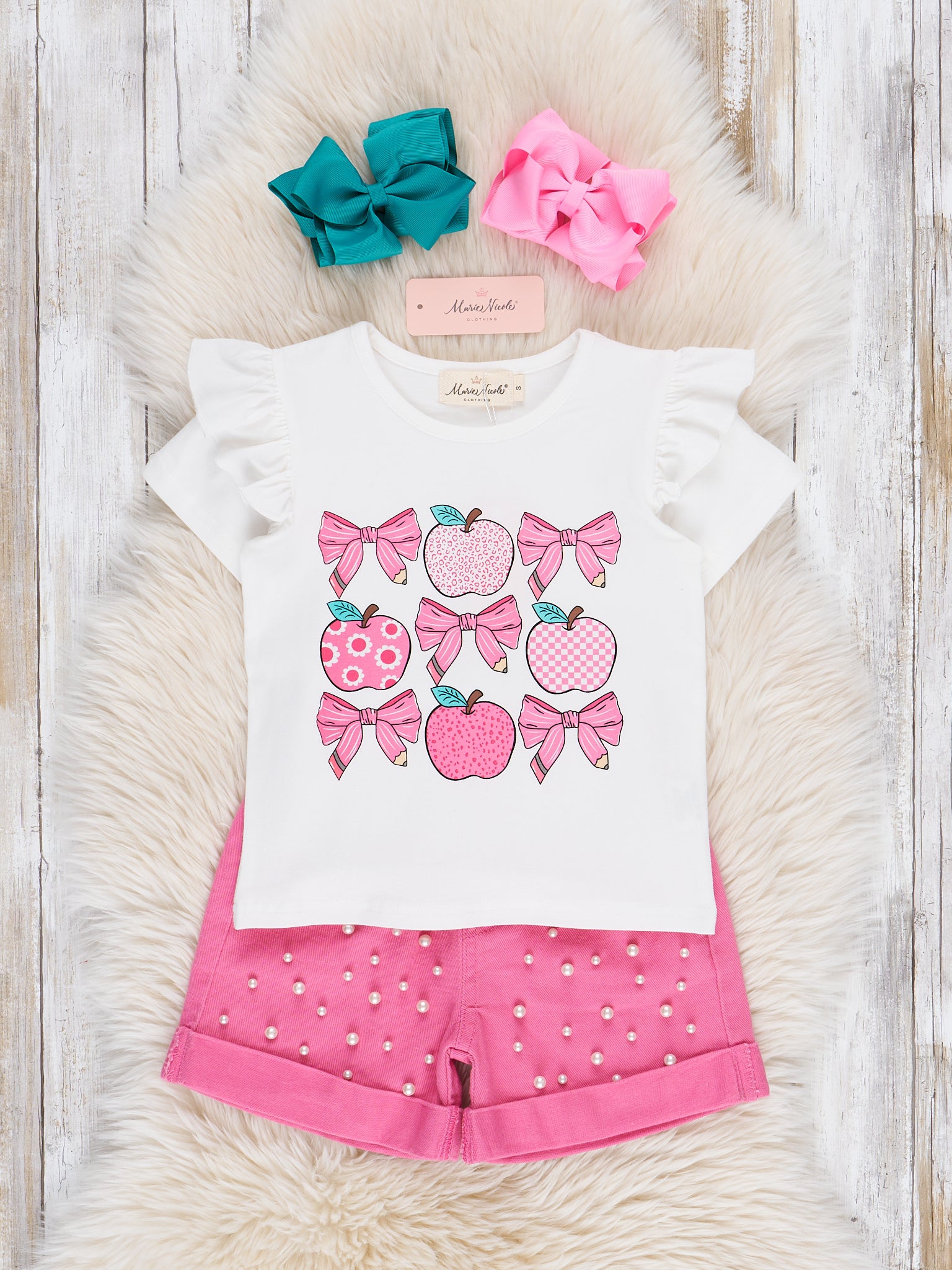 The Pearly Apples Bows Outfit is a sweet and sophisticated set perfect for school days and special occasions. Featuring delicate pearl-accented apple details and charming bow embellishments, this outfit from Marie Nicole Clothing brings timeless elegance with a playful twist. Made from soft, breathable fabric and finished with sweet ruffles, it’s ideal for picture day, classroom fun, or anytime she wants to shine in style.