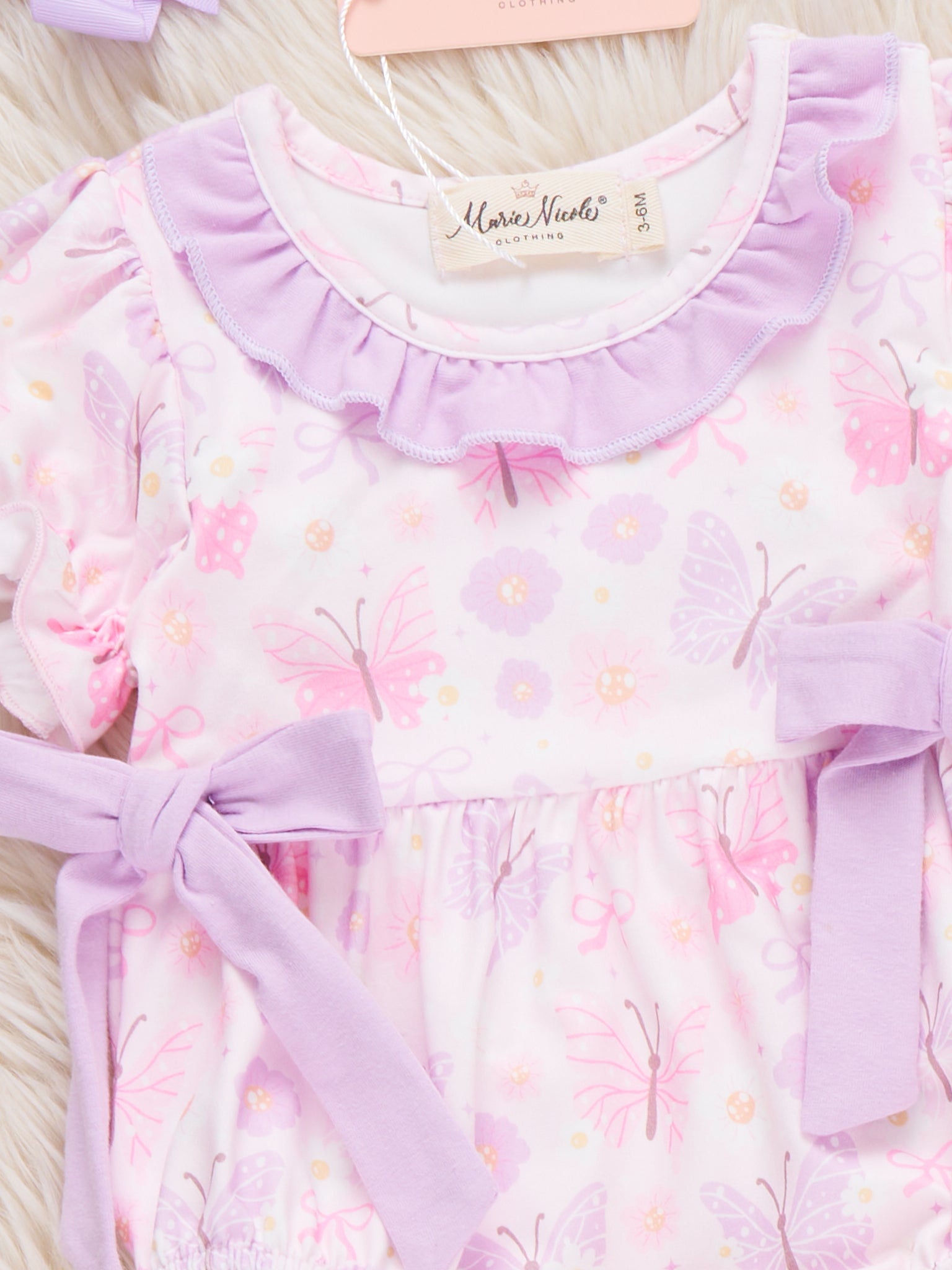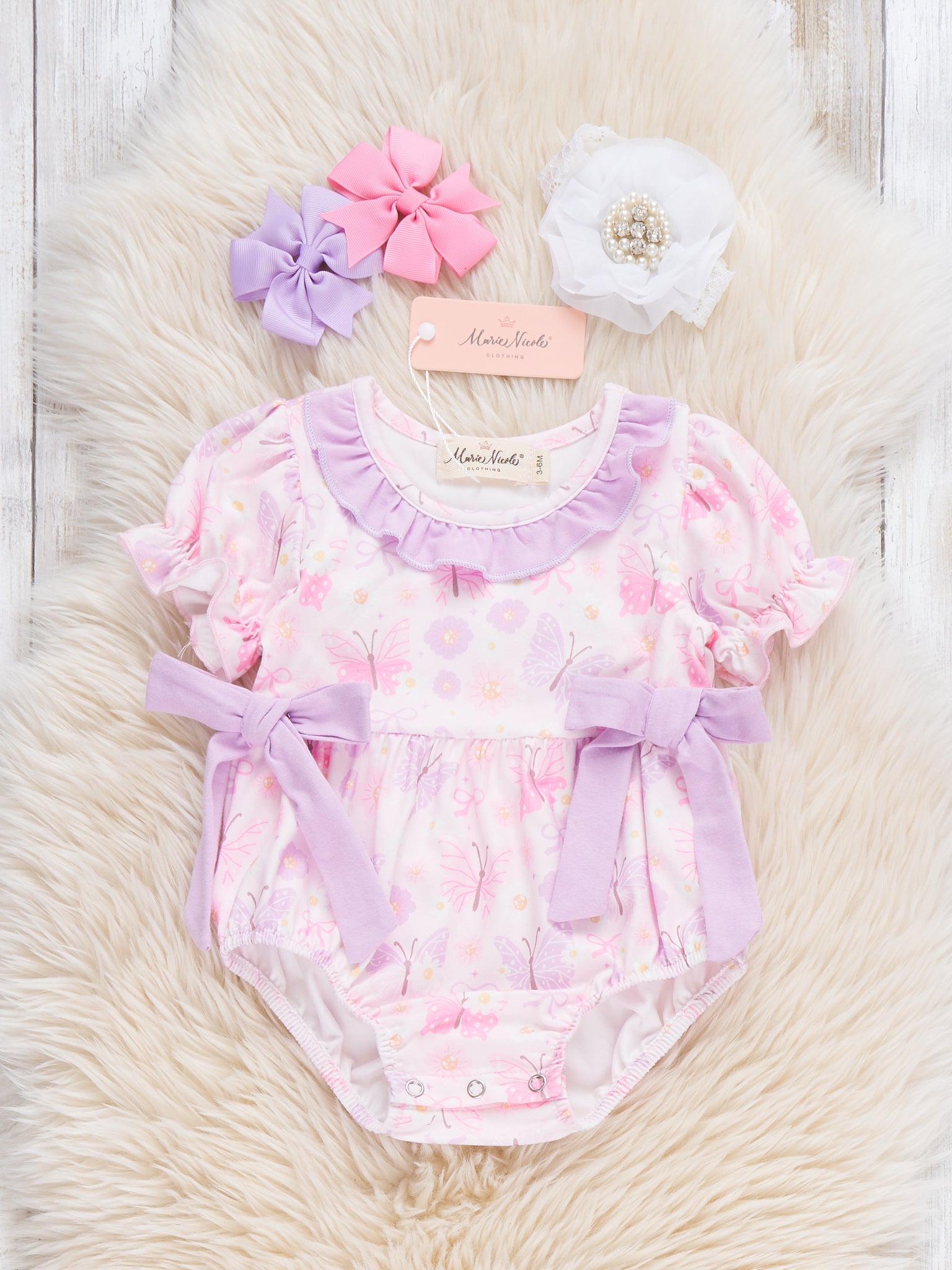 Petal Play Ruffle Bubble by Marie Nicole Clothing. This infant bubble features a pastel floral and butterfly print, soft ruffle collar, puff sleeves, and matching side bows, combining adorable style with practical comfort for little ones.