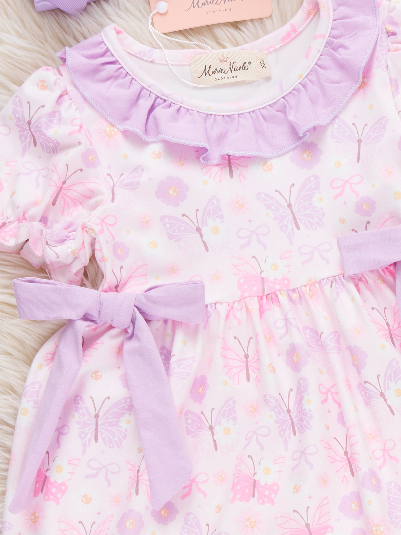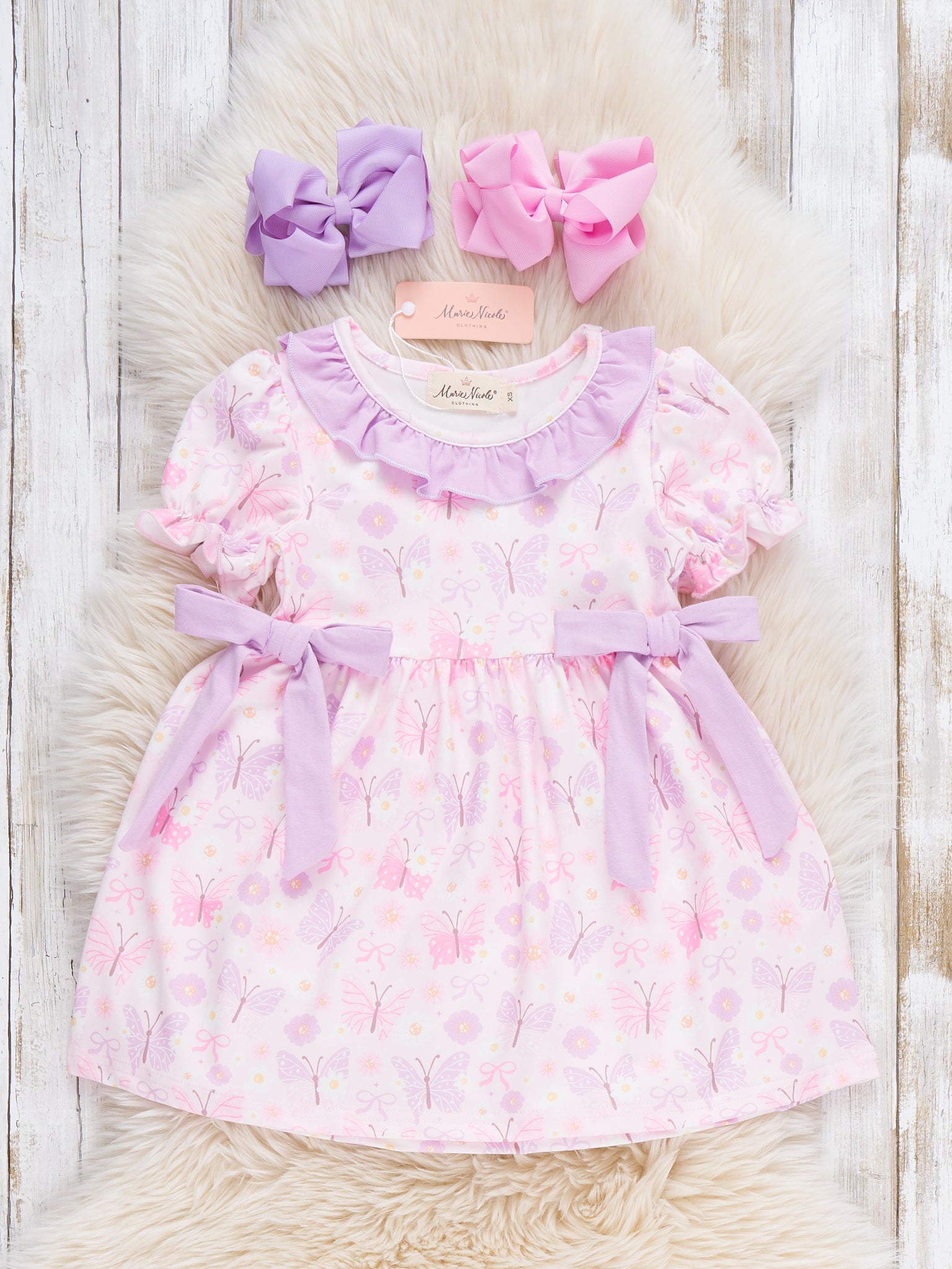 Petal Play Ruffle Dress by Marie Nicole Clothing. This sweet dress features a pastel floral and butterfly print, lavender ruffle trim at the neckline, puff sleeves, and matching waist bows for a classic, charming springtime look.