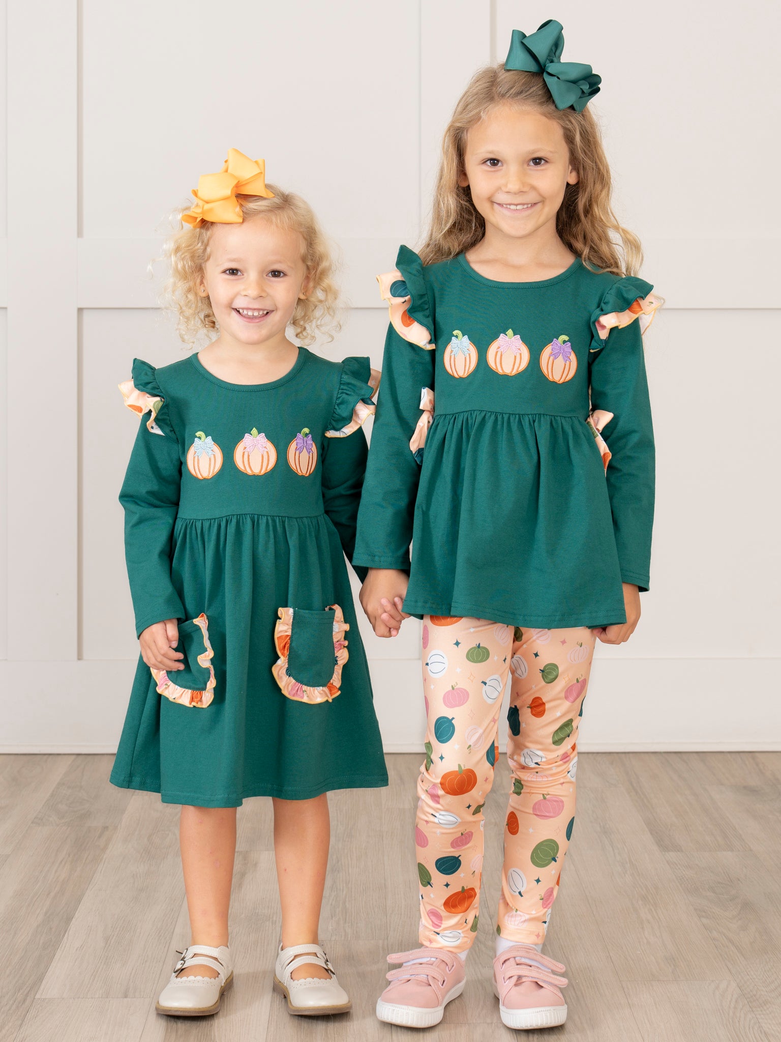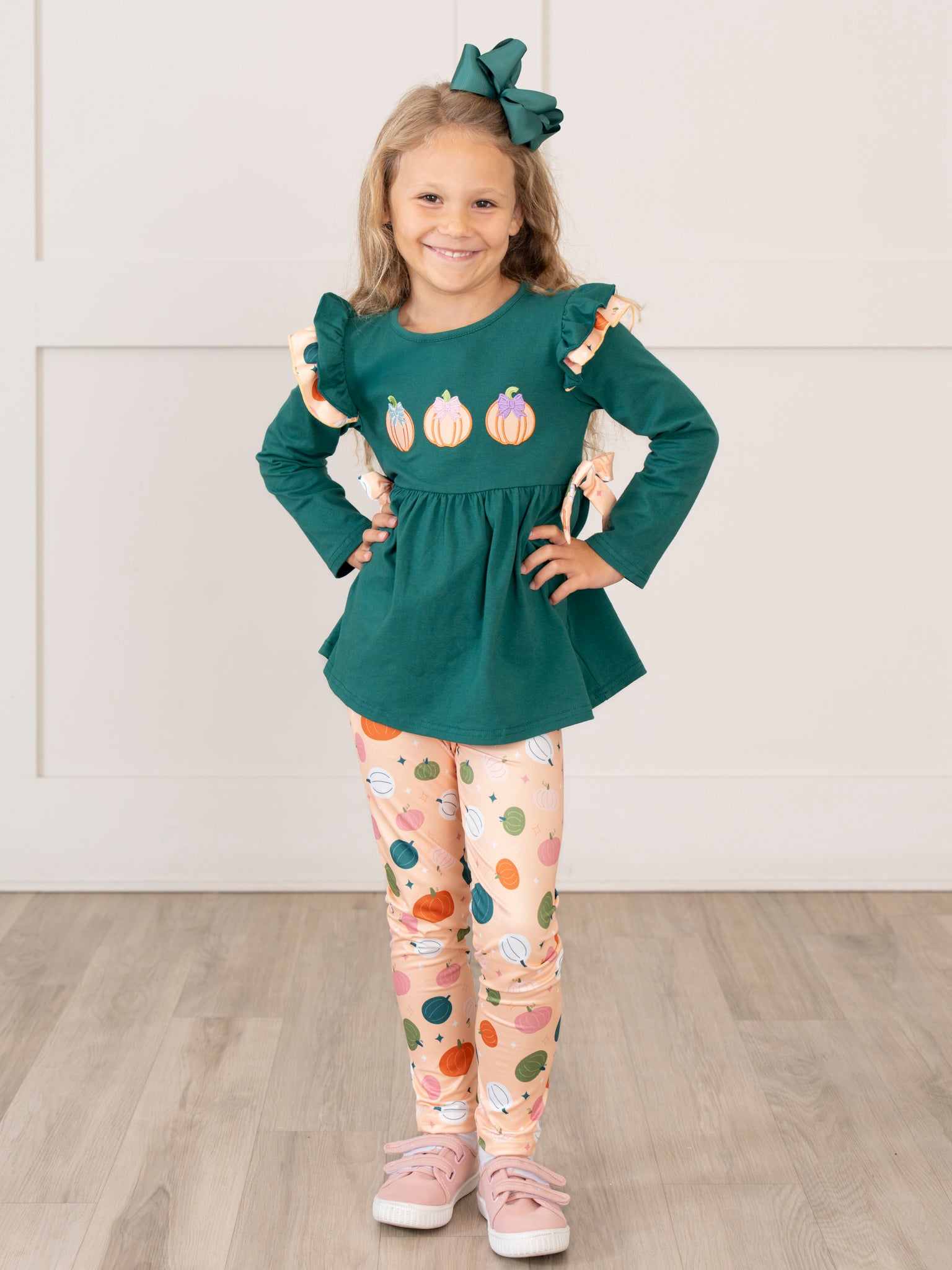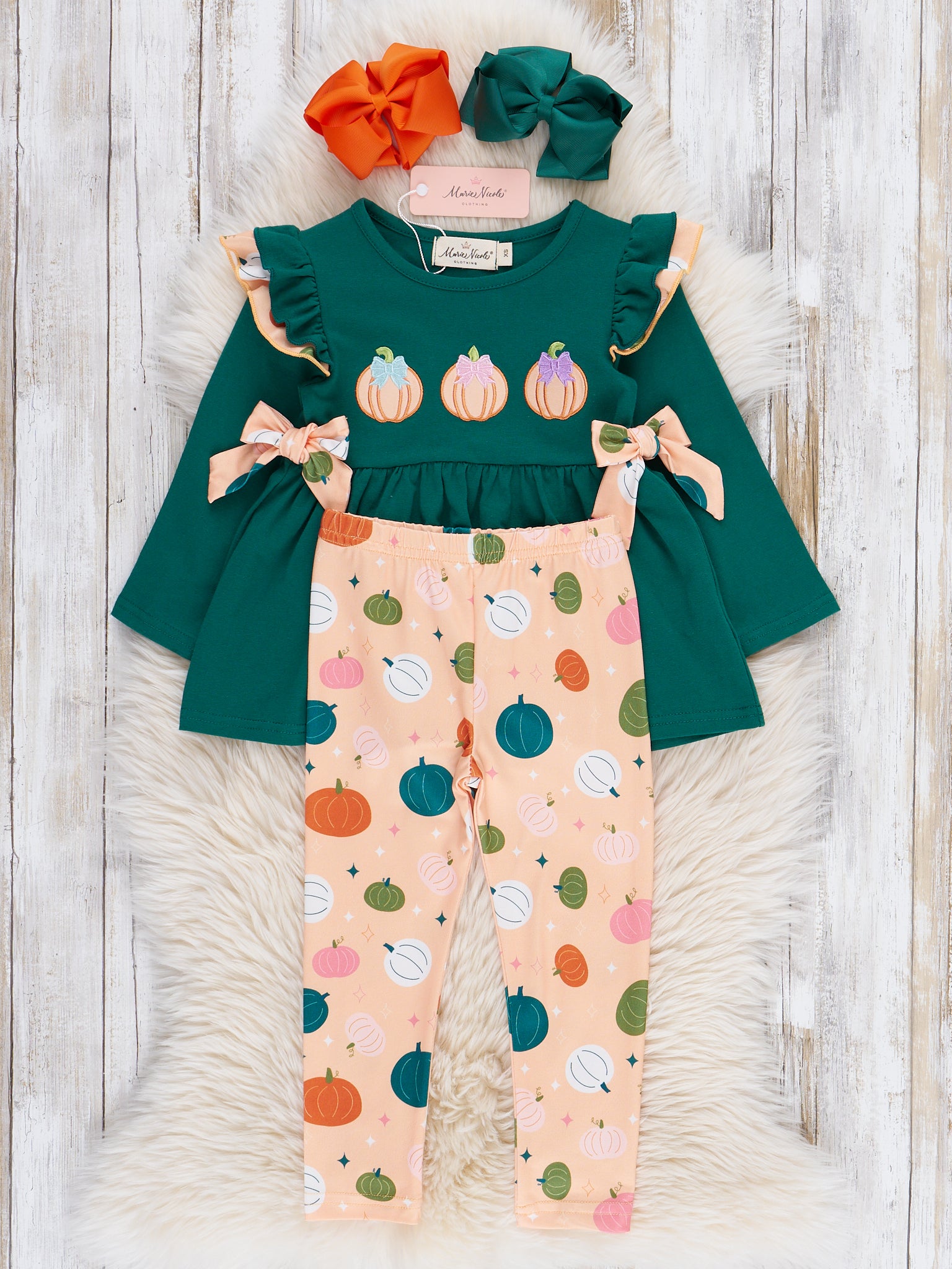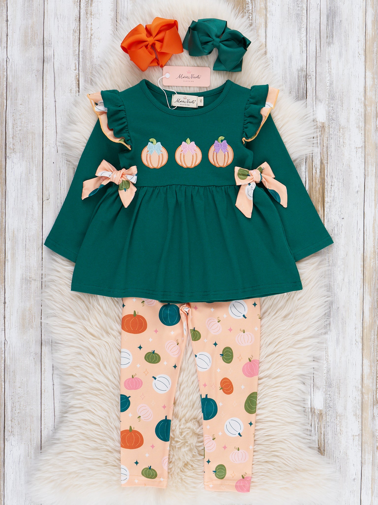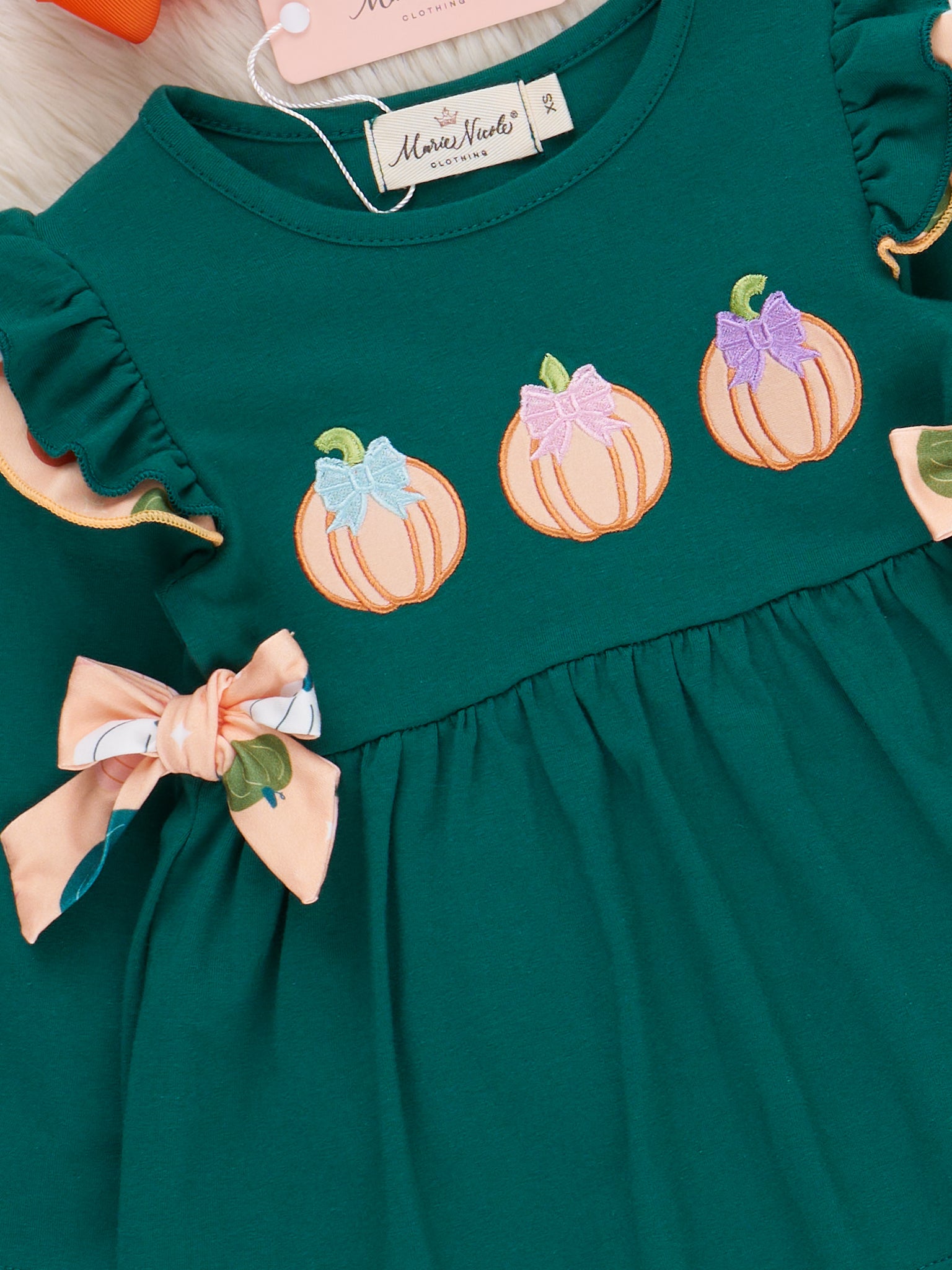 Pick out the perfect pumpkins with the Pick of the Patch Ruffle Outfit! Along with pleasant bows, ruffles, and pumpkin patterns, this two-piece set from Marie Nicole Clothing is delicately embroidered with cute pumpkins and designed with comfortable fabric. Your child will stay fun and festive in this outfit for all fall occasions!