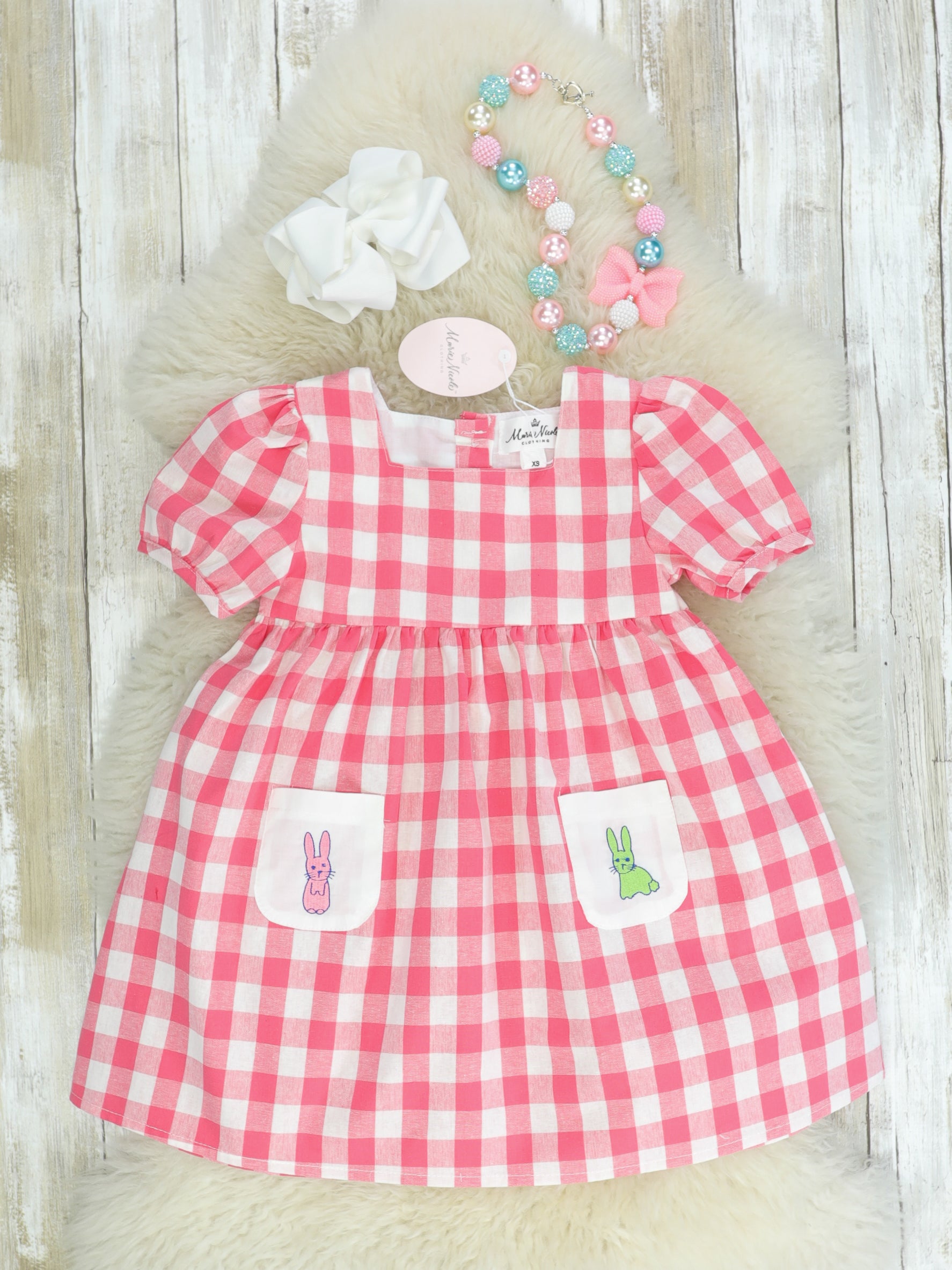 The perfect sibling set for an Easter picnic with your bunny crew! This red check dress features two white pockets- one with a pink bunny & the other with a green bunny.