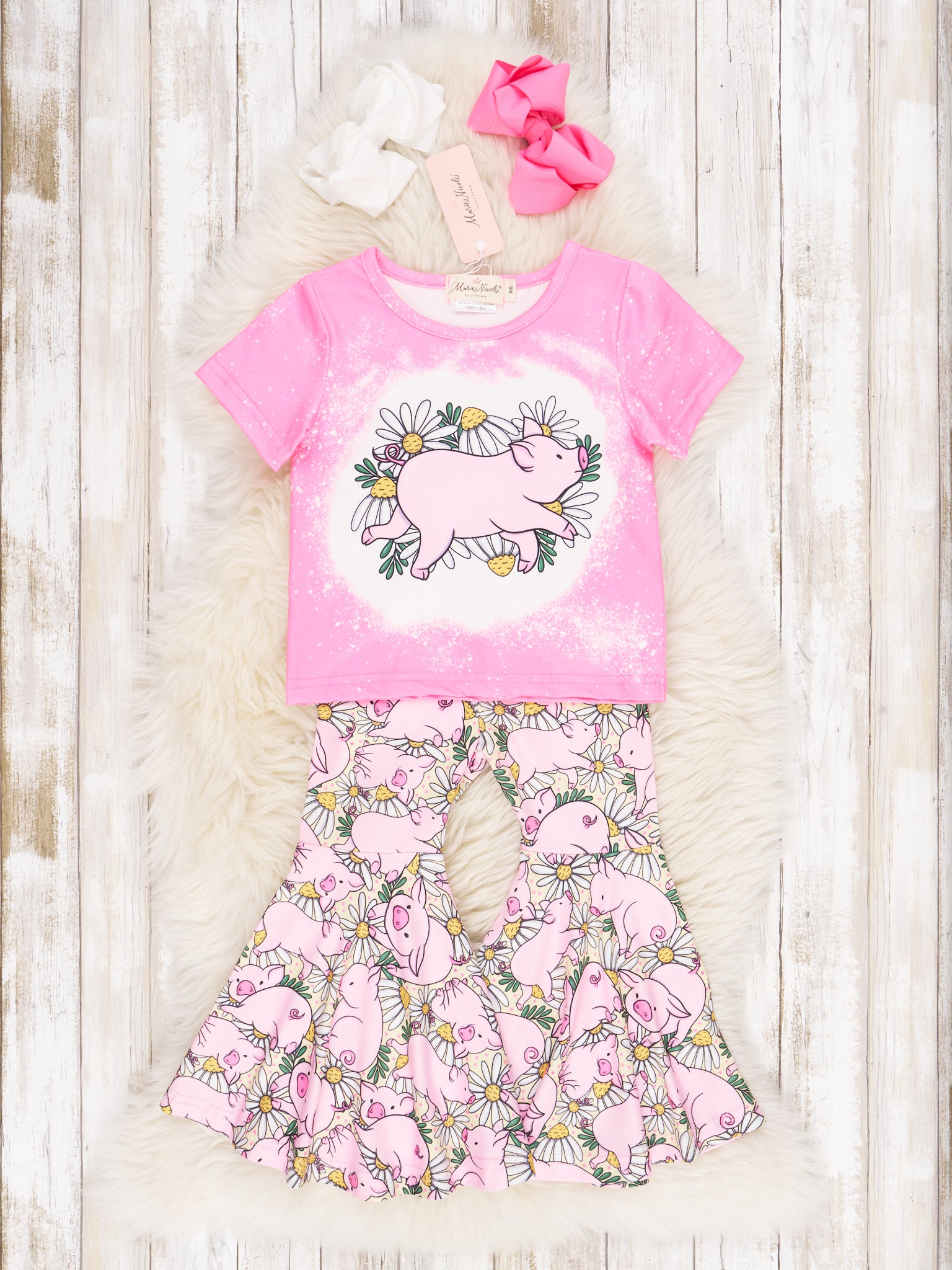 This Pigs & Daisies Bell Bottoms Outfit is perfect for the little one in your life! The adorable pink top features a pig with daisies detail that's sure to have 'em oinking with joy! The matching bell bottoms also feature an elastic waistband for the perfect fit. Let the good times roll!