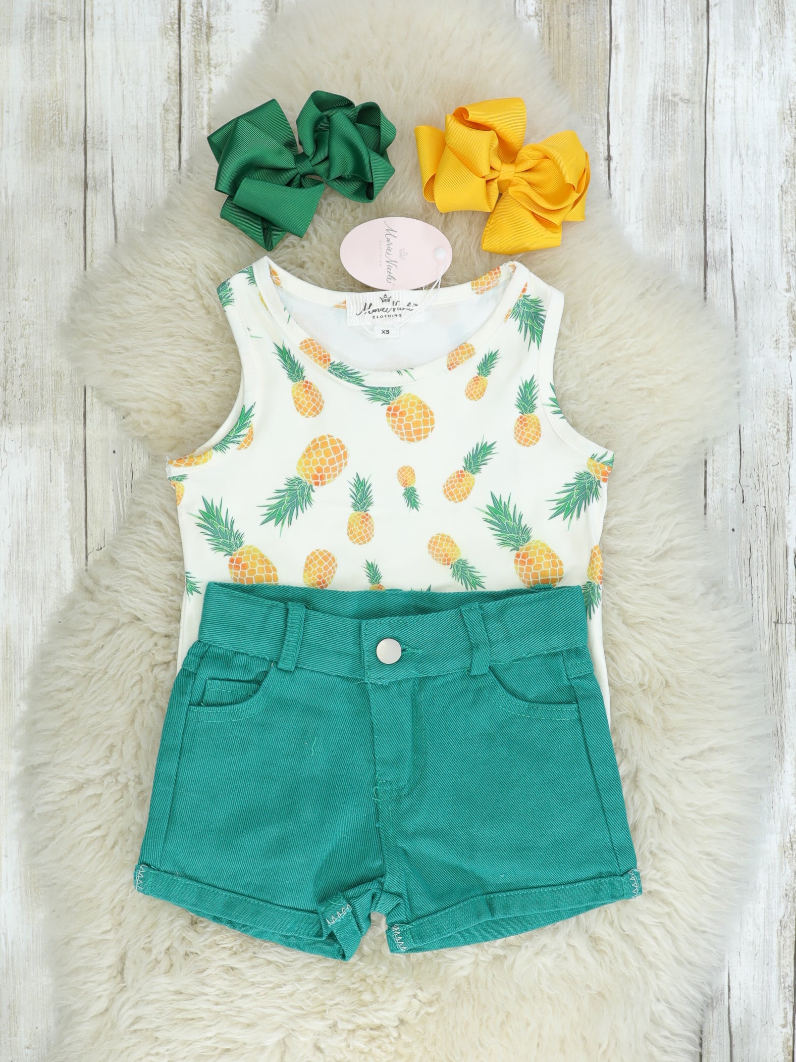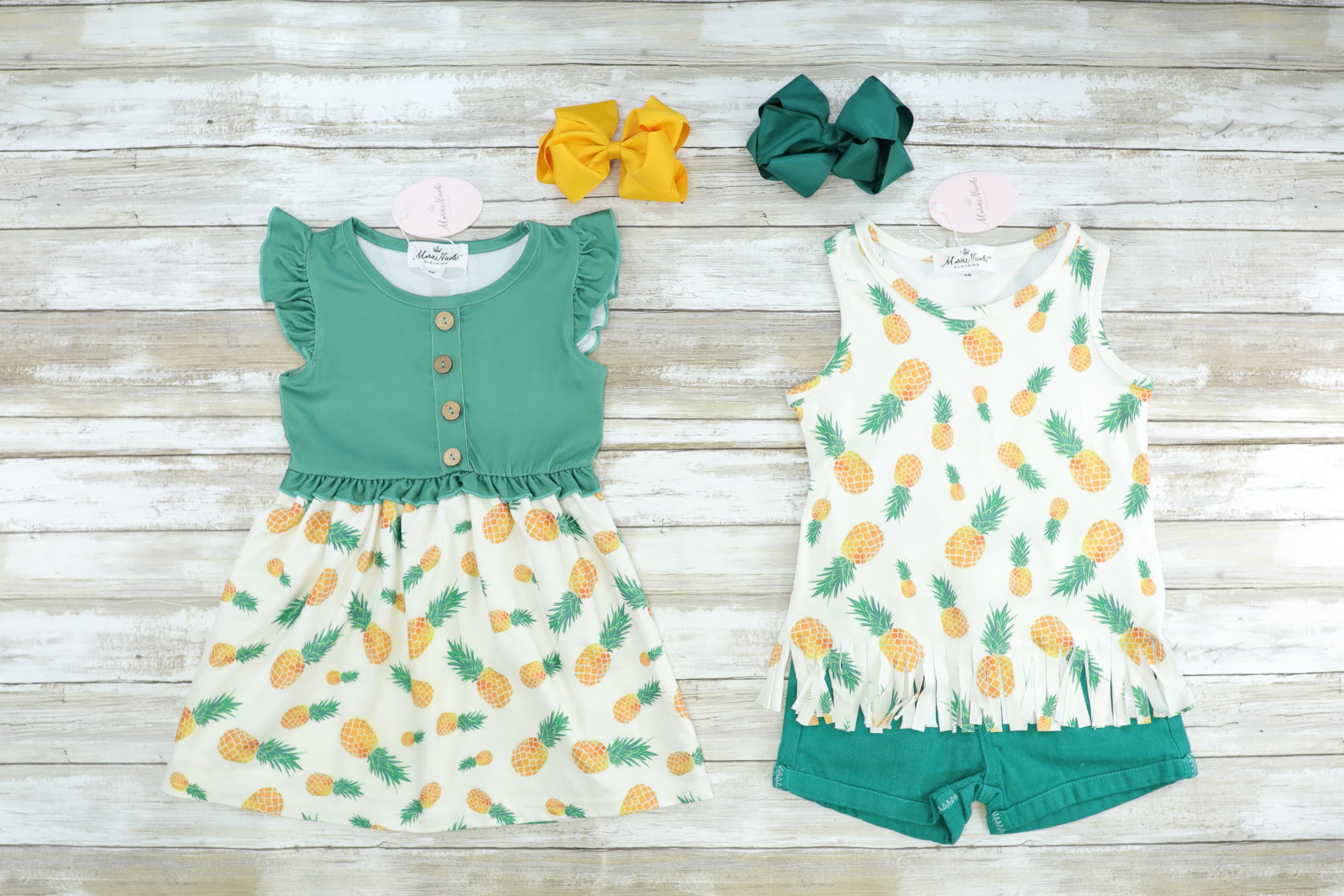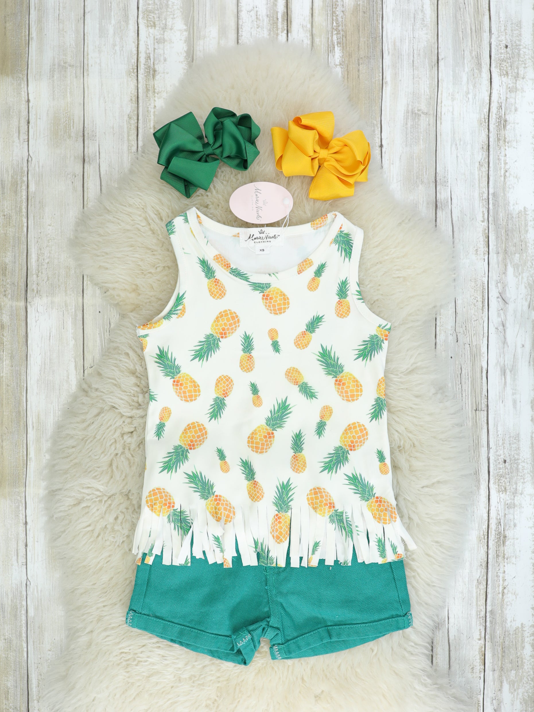 Stand tall and stay sweet in the cutest pineapple sister set! This outfit features a pineapple print with a fringe hem and matching stitched cuff rolled shorts.