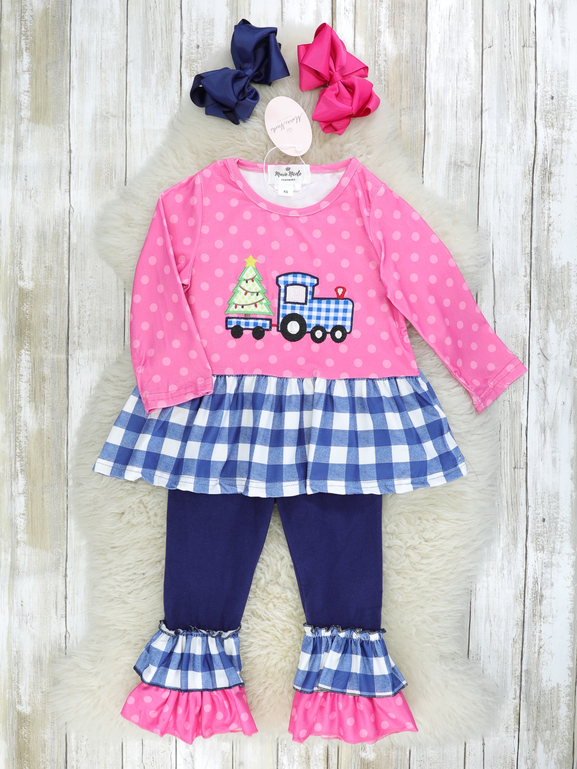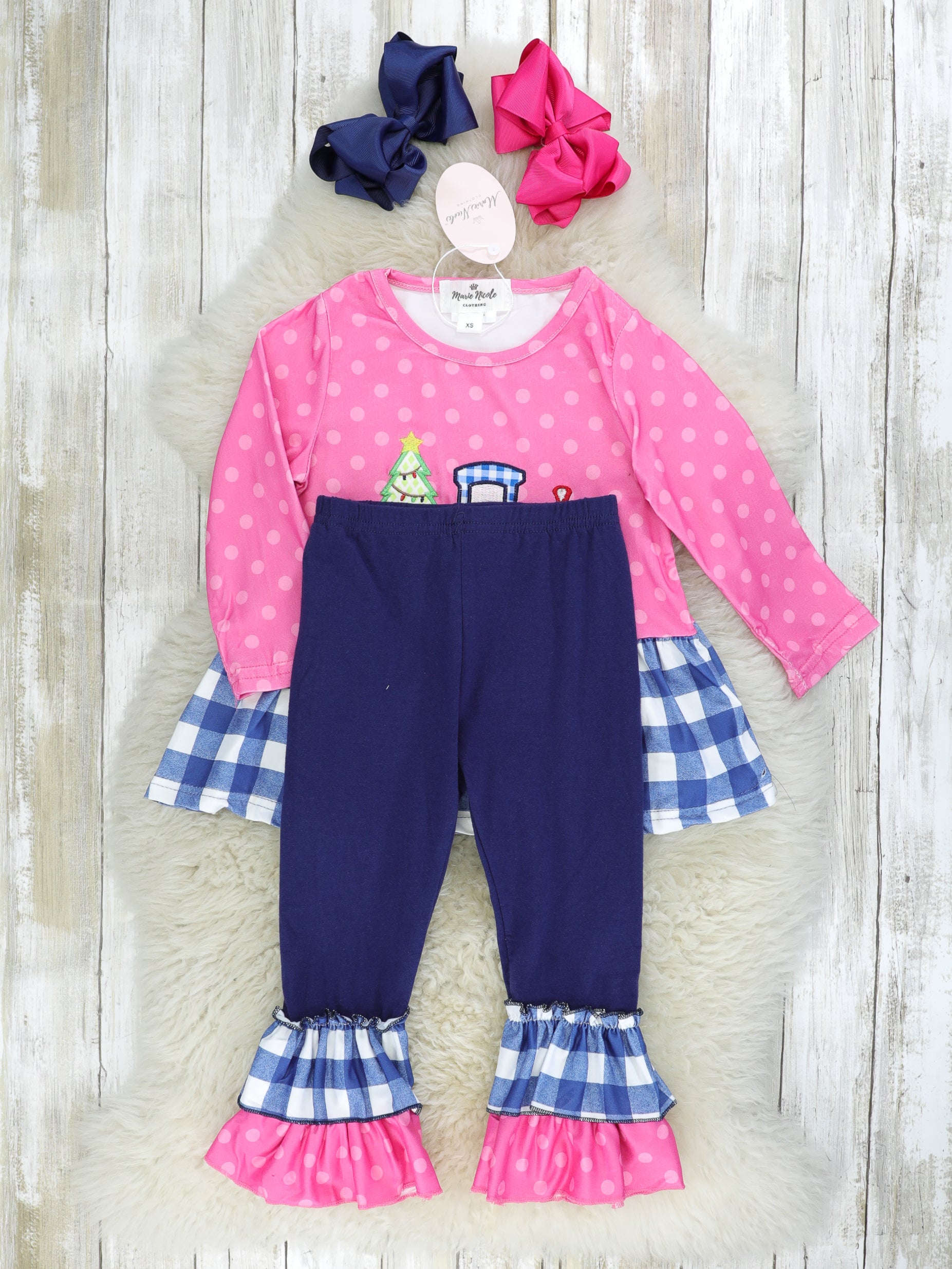 This precious sister set is a fir sure favorite! This outfit features a pink peplum top with a Christmas tree truck appliqué, blue gingham, polka dots, & matching ruffle pants.