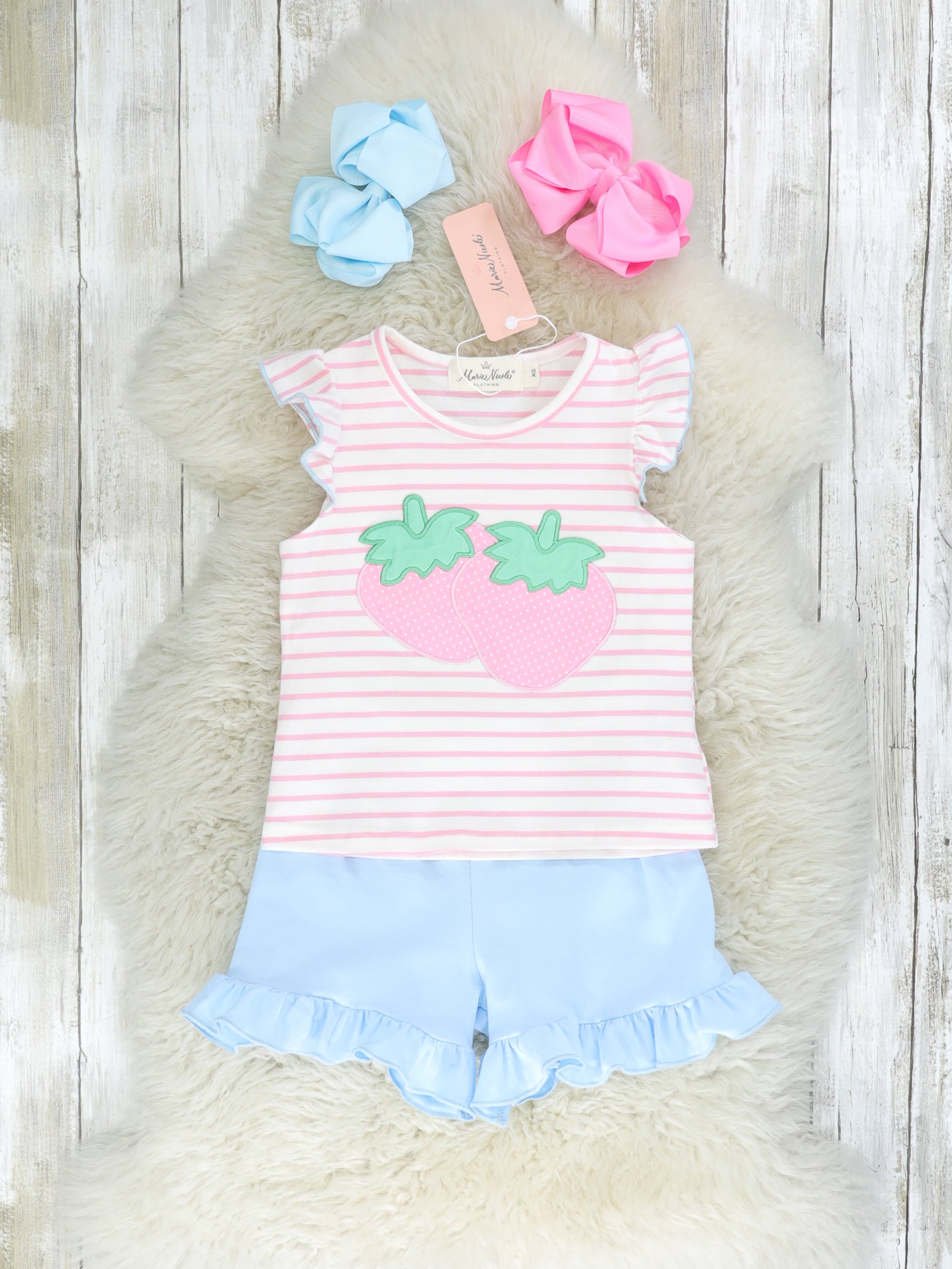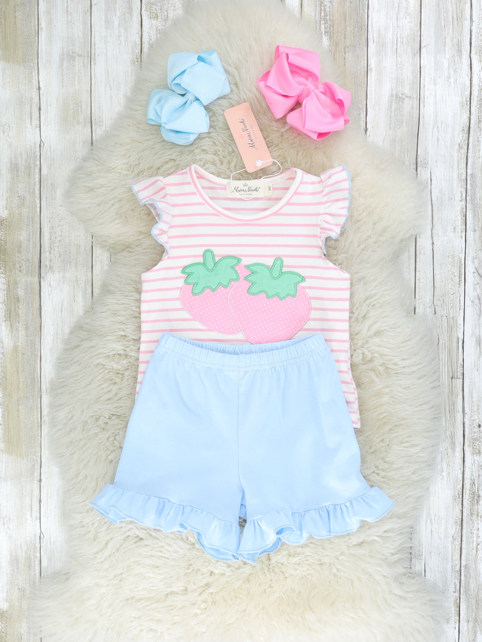 The perfect sibling set to go the strawberry farm! This outfit features pink stripes, darling strawberry appliqués, flutter sleeves, & blue shorts with an elastic waistband.