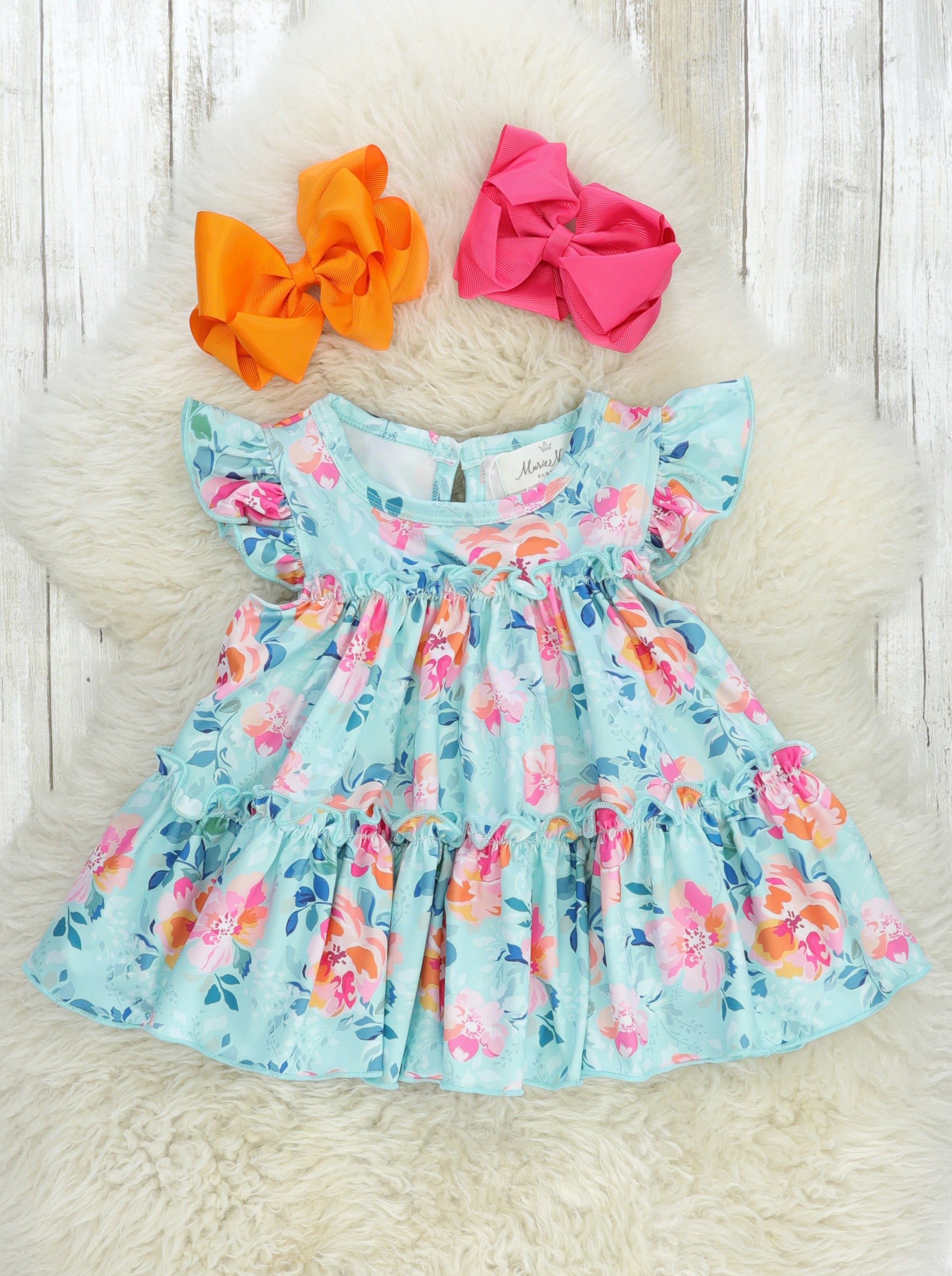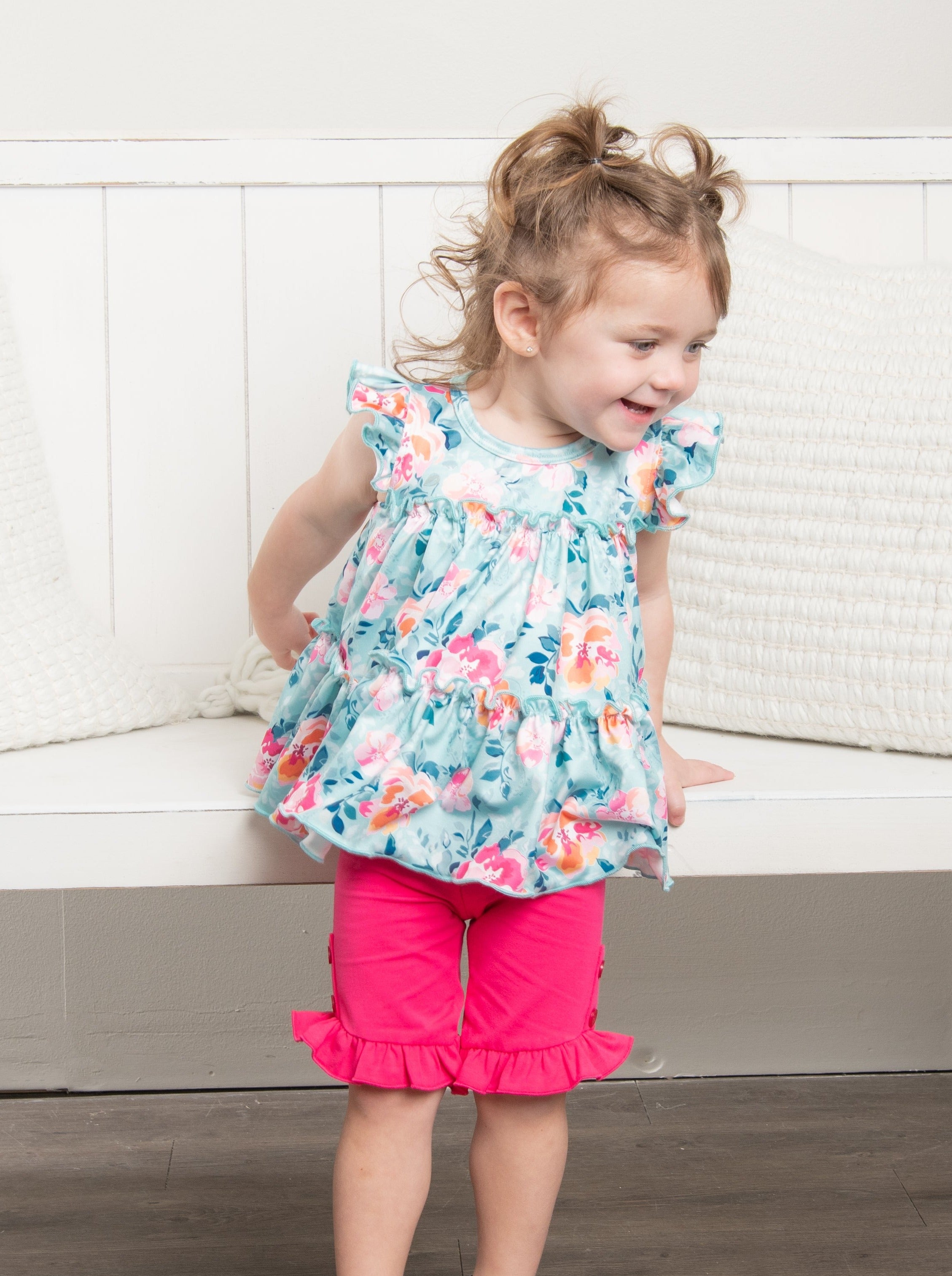 These sweet tunics are perfect for spring & summer fun! This tiered tunic features a stunning pink anemone design, ruffles, flutter sleeves, & a keyhole at the nape of the neck for easy changing.