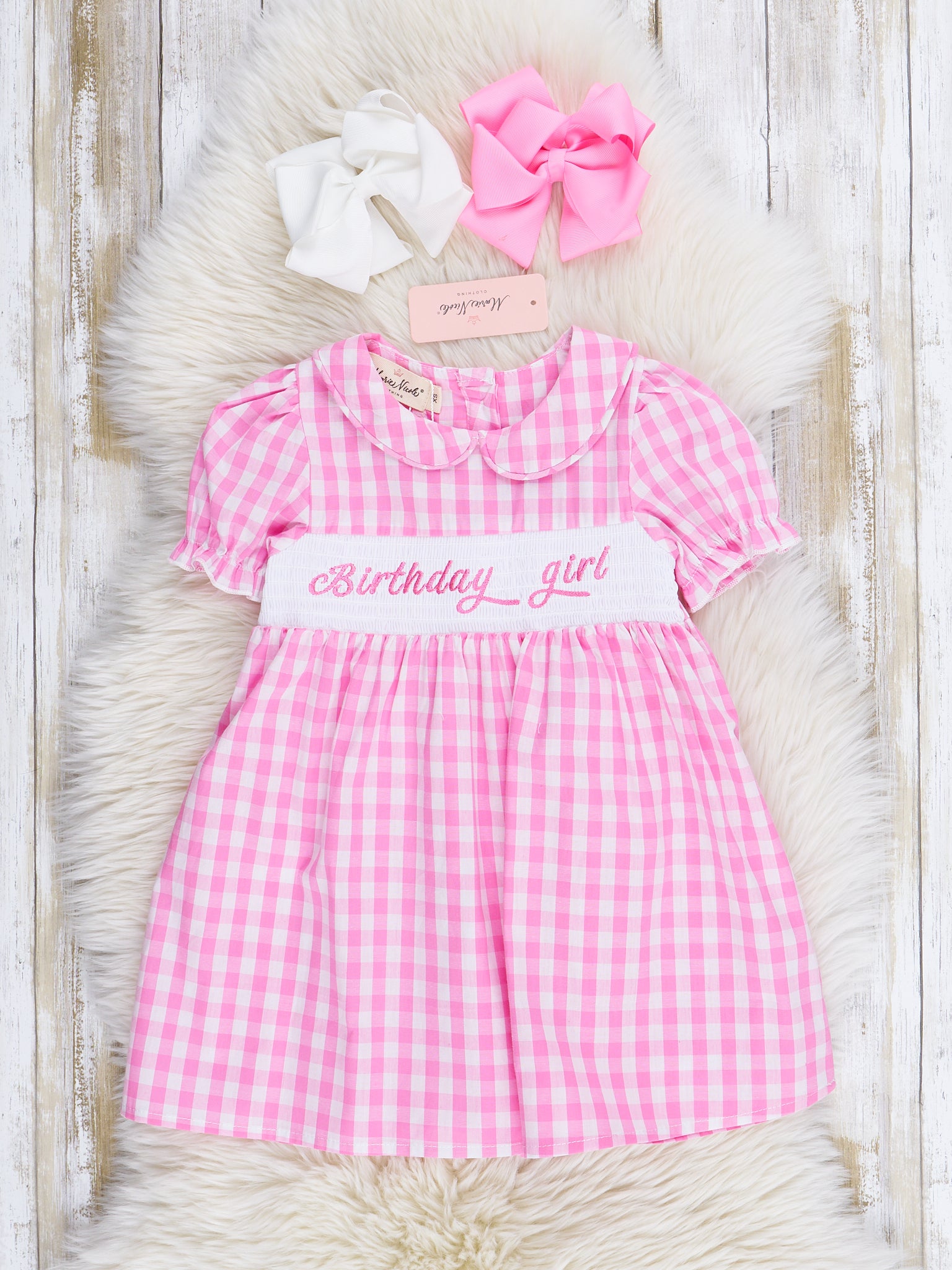 Celebrate in style with our Pink Birthday Girl Smocked Dress! This adorable dress features delicate embroidery over smocking, creating a unique and playful look. The pink gingham adds a touch of whimsy for the cutest birthday girl. A must-have for any birthday celebration! đ©·