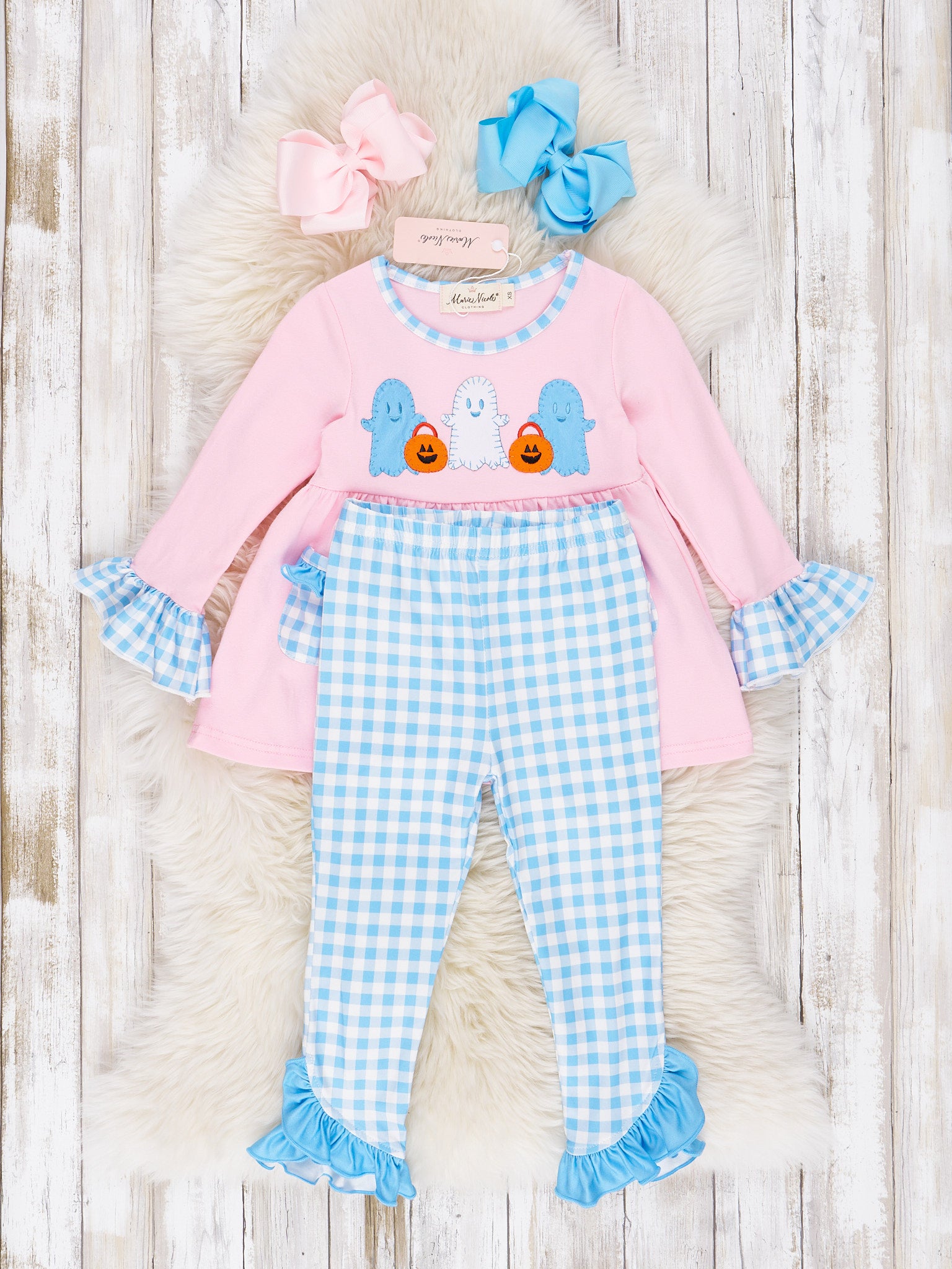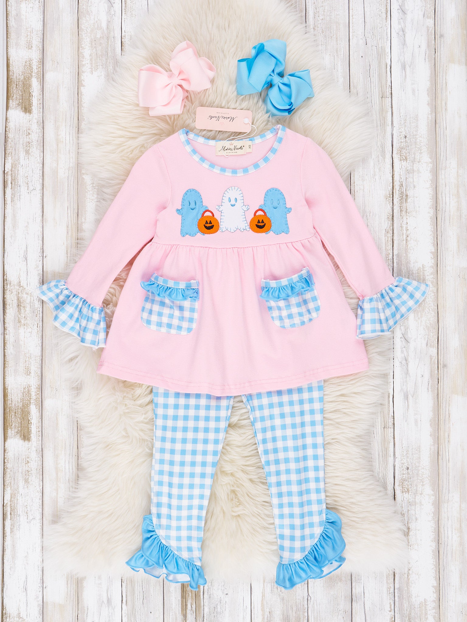 Send your little pumpkins to the pumpkin patch in this darling sister set! This outfit features a pink top with a pumpkin & ghost appliqué, gingham ruffle details at the collar, sleeves, and pockets, plus coordinating blue gingham ruffle pants.