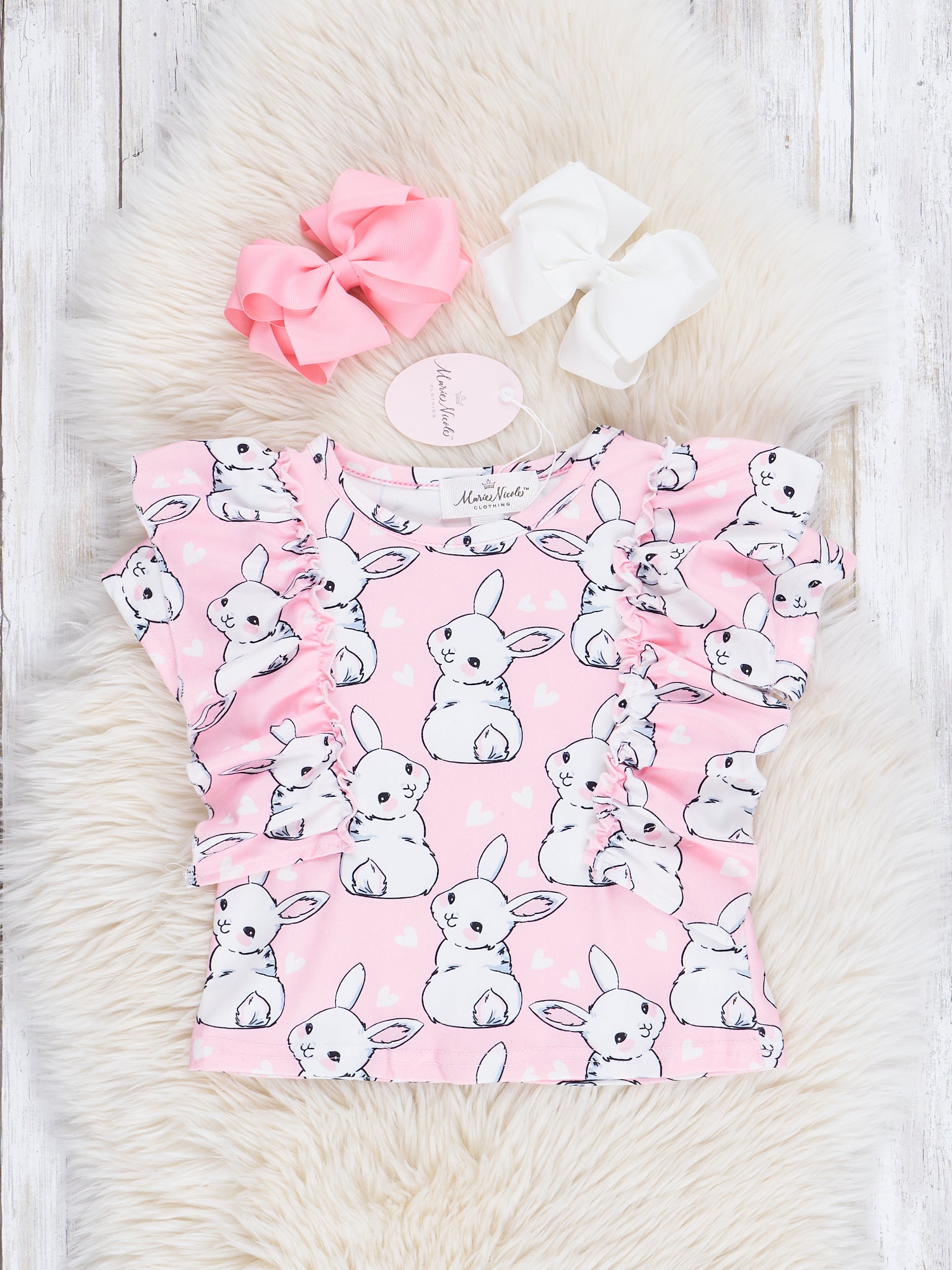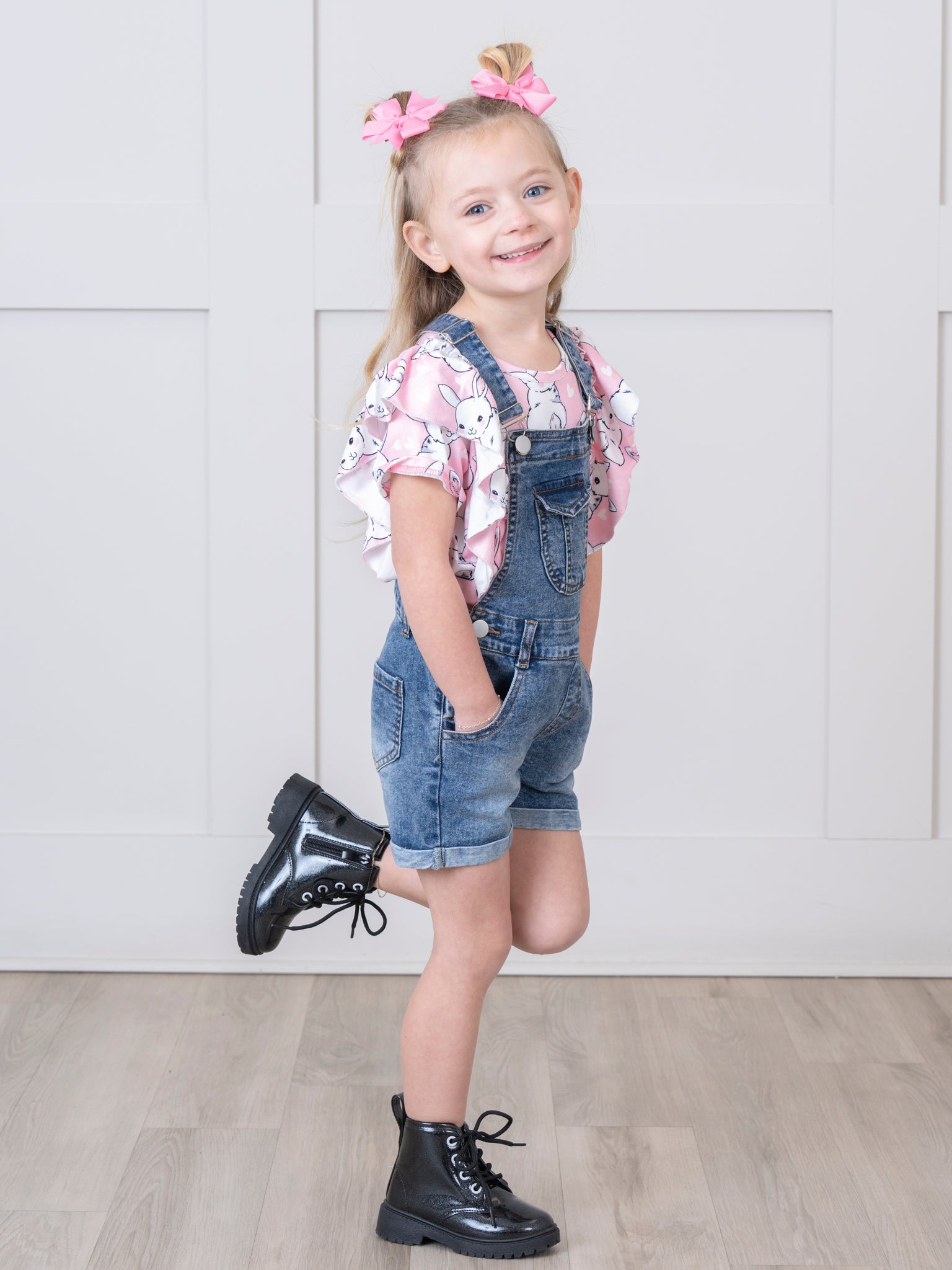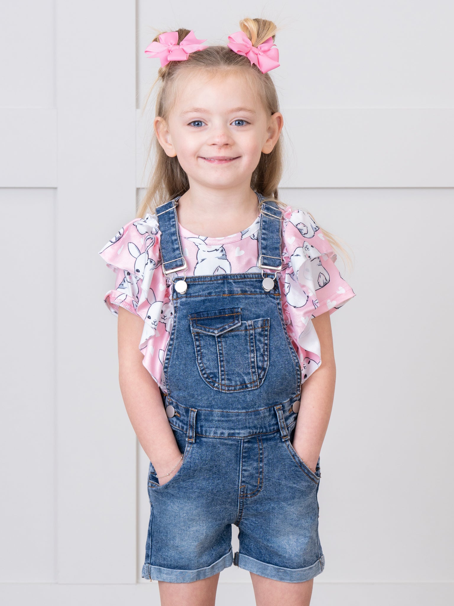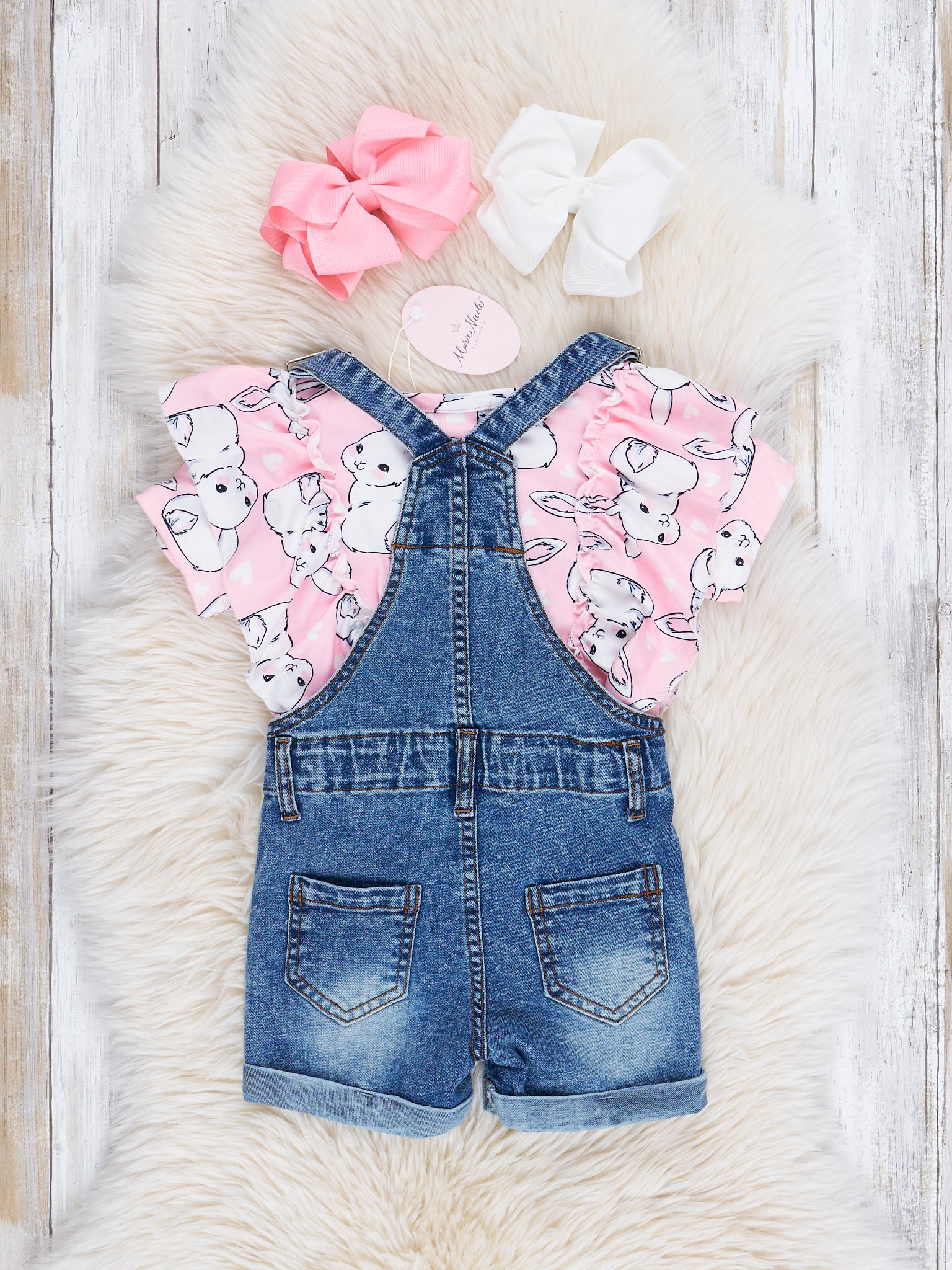 The sweetest outfit to leave your girls feeling hoppy! This outfit features a pink top with adorable bunnies, ruffle trim, & denim overalls with adjustable straps.