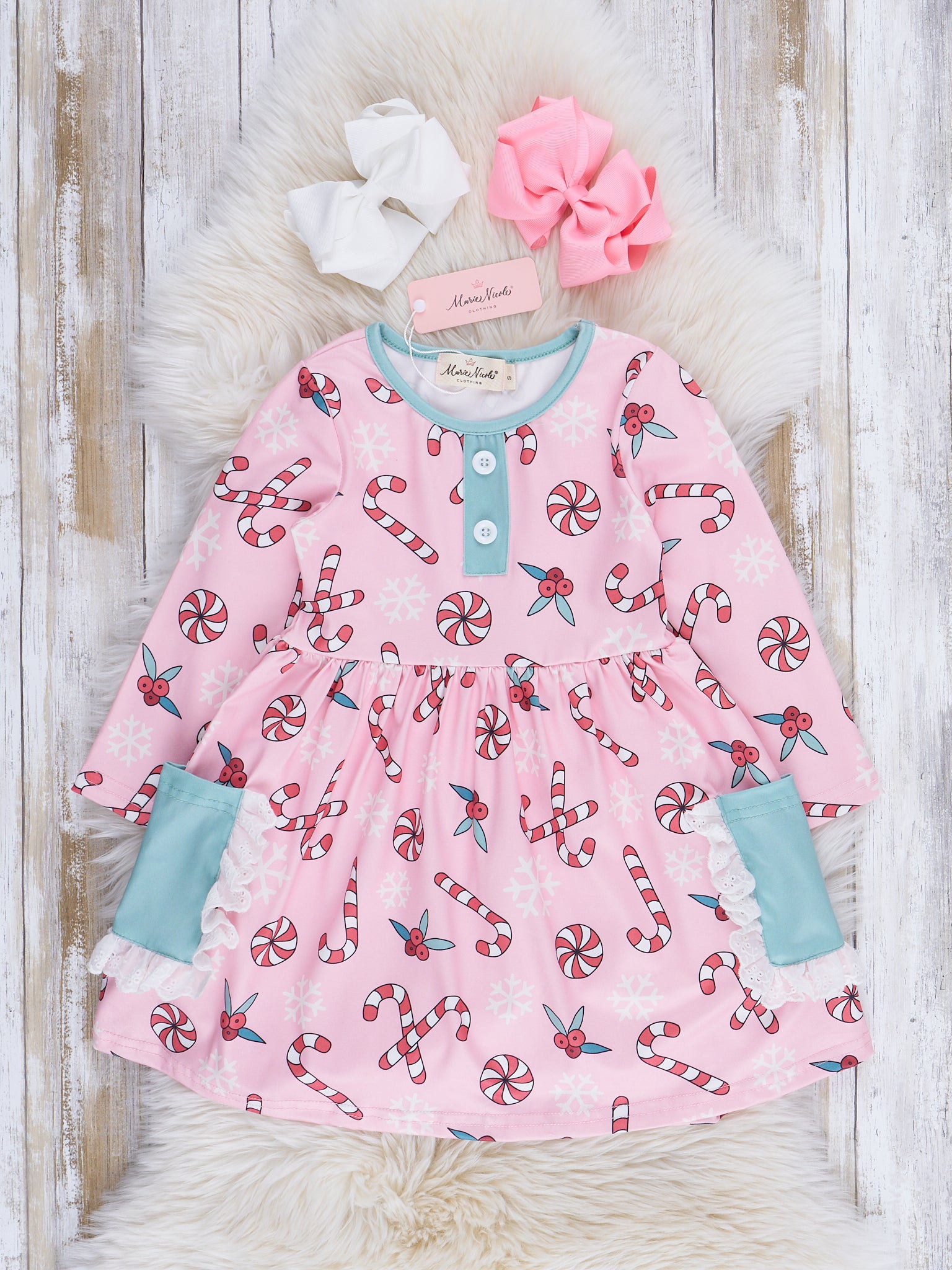 Let your style swing into the holidays with this Pink Candy Cane Lane Dress! Enjoy a playful candy cane print and soft teal trim, with lace trim pockets that'll make your look pop. Who says you can't have sweet style for the season?