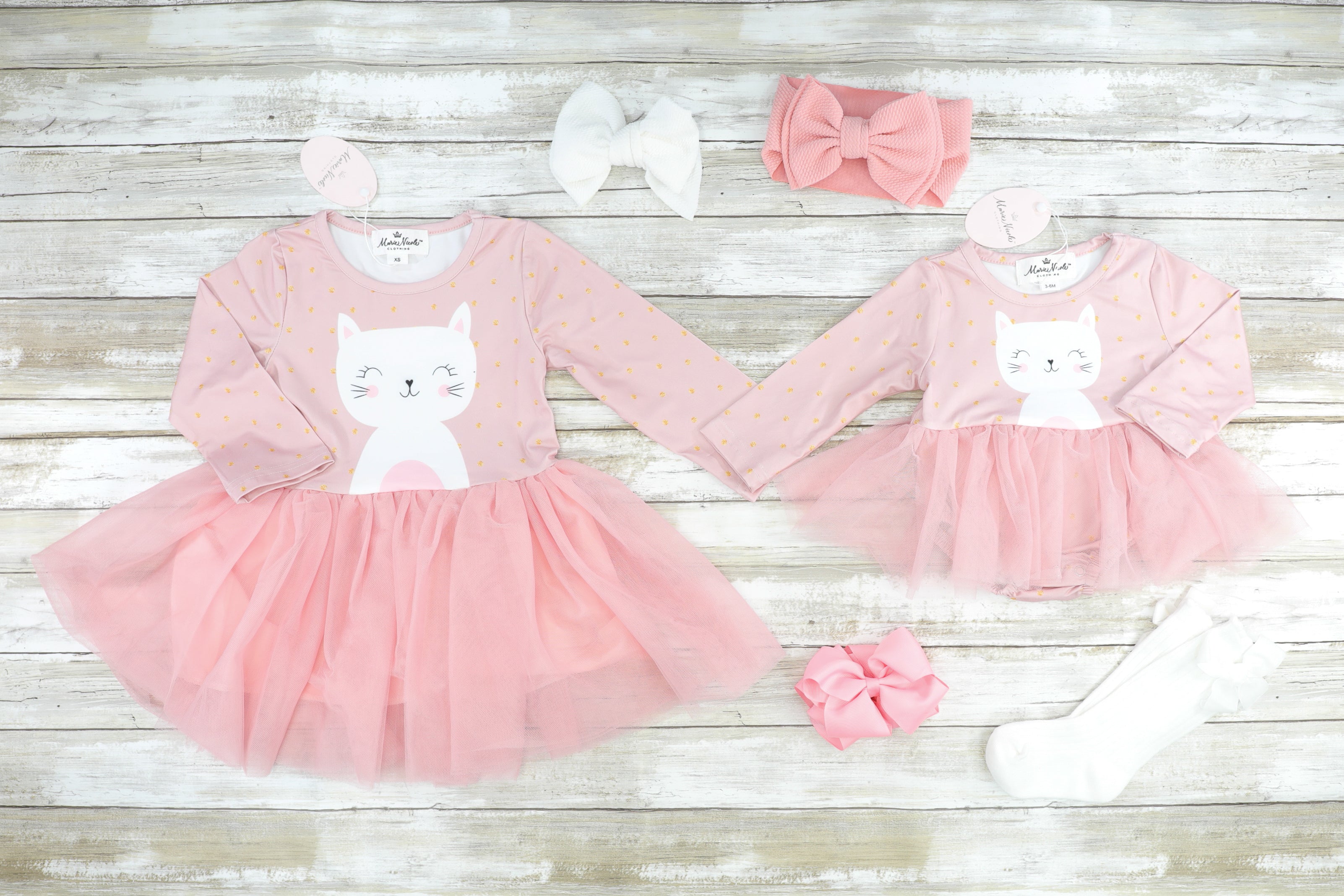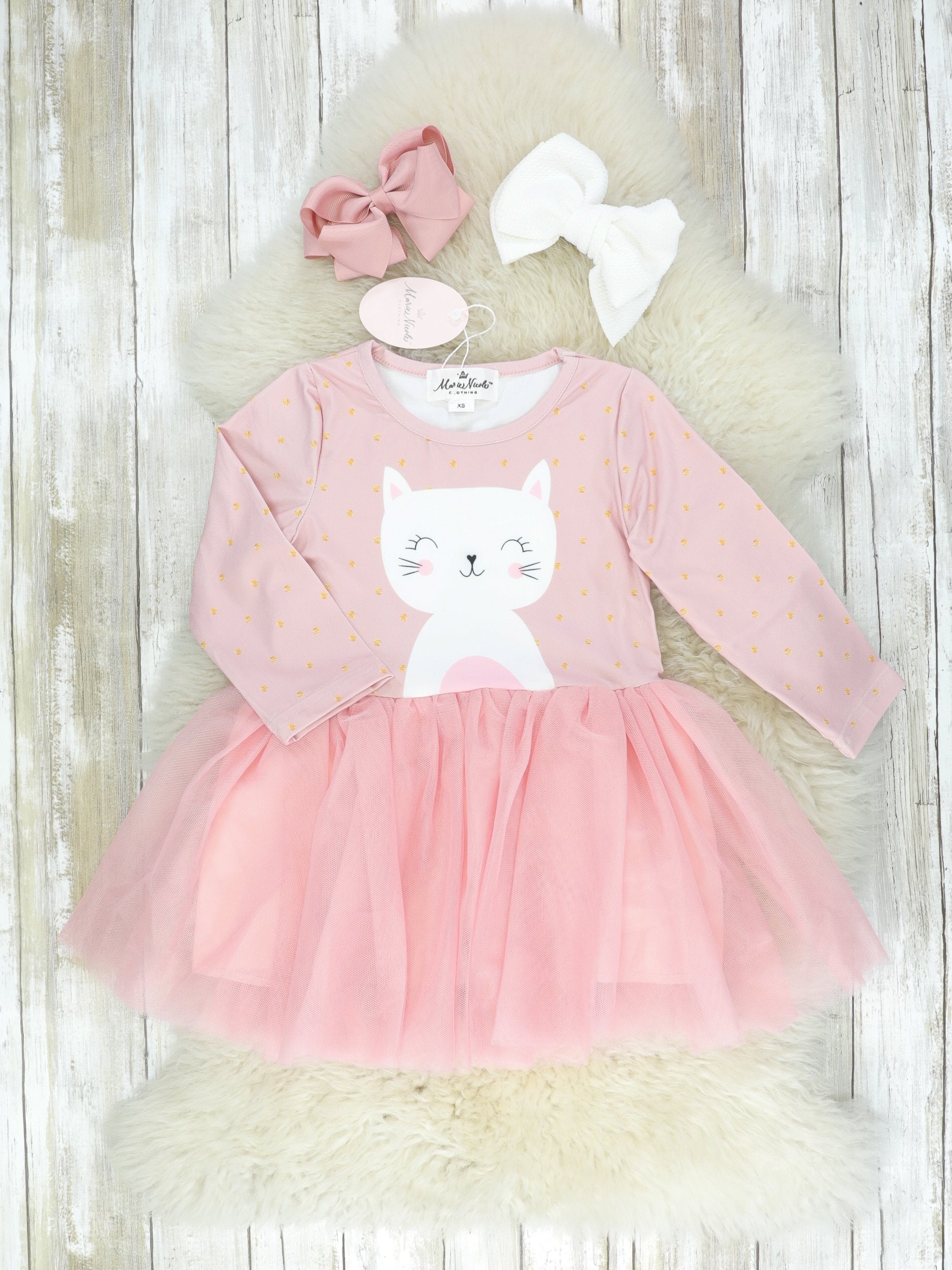 A sweet pink cat tulle set is exactly what your littles need! This pink dress features a white cat detail & a lined tulle skirt.