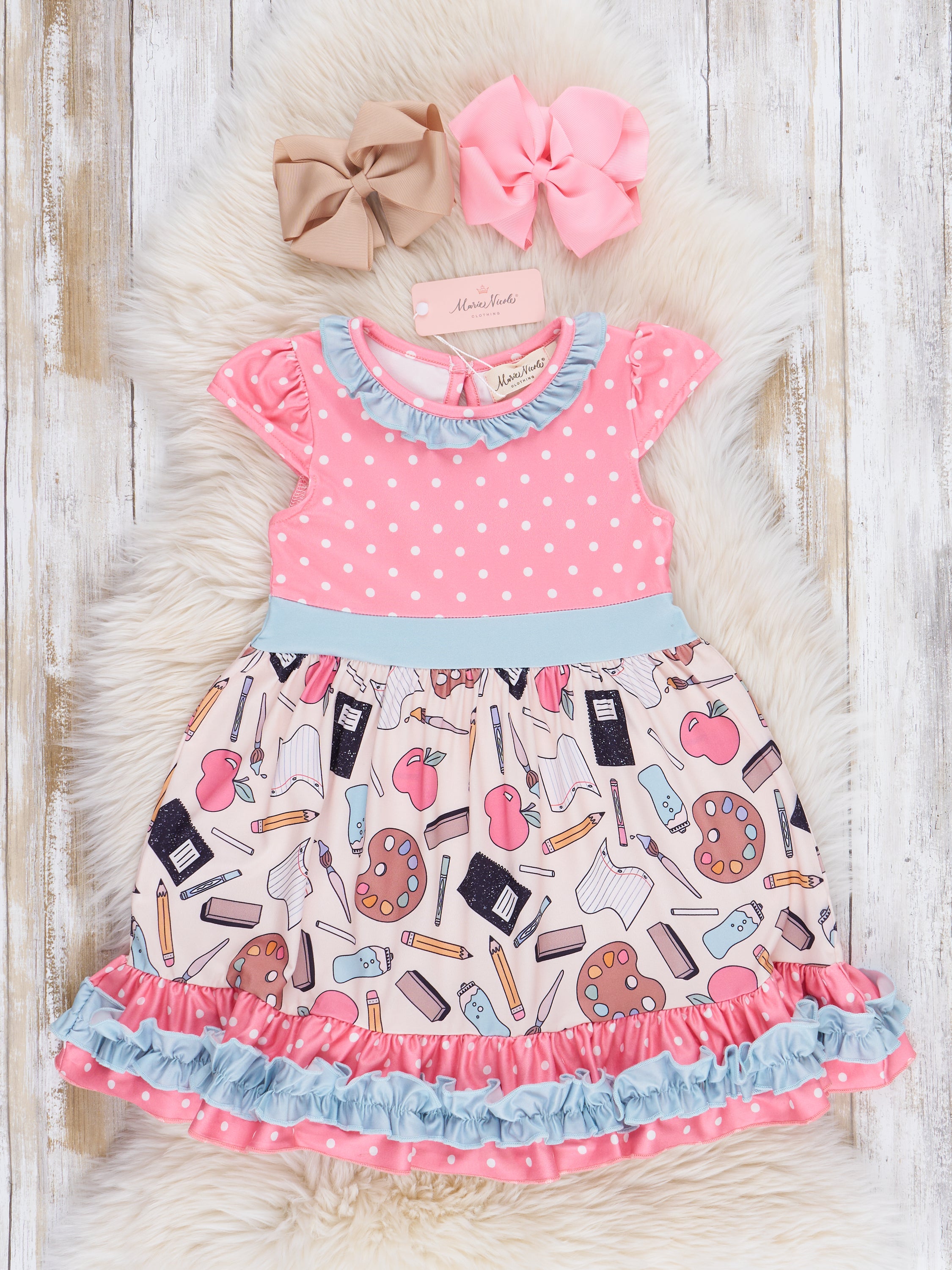 Get creative with the Pink Dots Art Class Ruffle Dress! This darling dress features playful ruffle trim and a playful pink polka dot design. The art supplies print adds a unique touch, making it the perfect dress for any artsy girl. Whether it's for back to school or a fun day out, this dress will keep your little one stylish and comfortable.