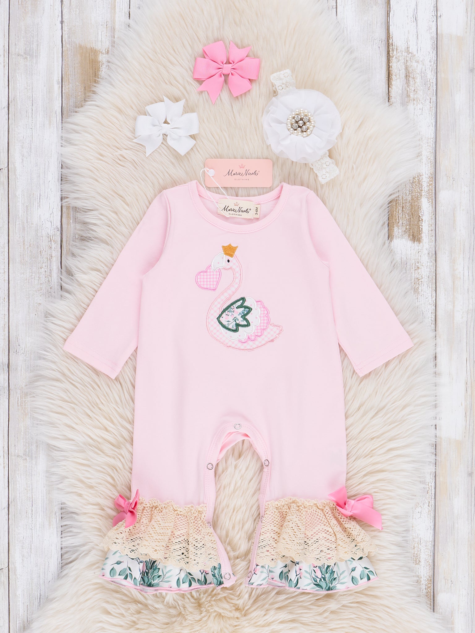 Get ready for Valentine's Day with our Pink Embroidered Heart Swan Ruffle sister set! This playful girls romper by Marie Nicole Clothing features a beautiful embroidered swan queen with a heart, perfect for your little queen. The ruffle ankles add a touch of whimsy, and the pink bodice adds a touch of sweetness. Love at first sight!