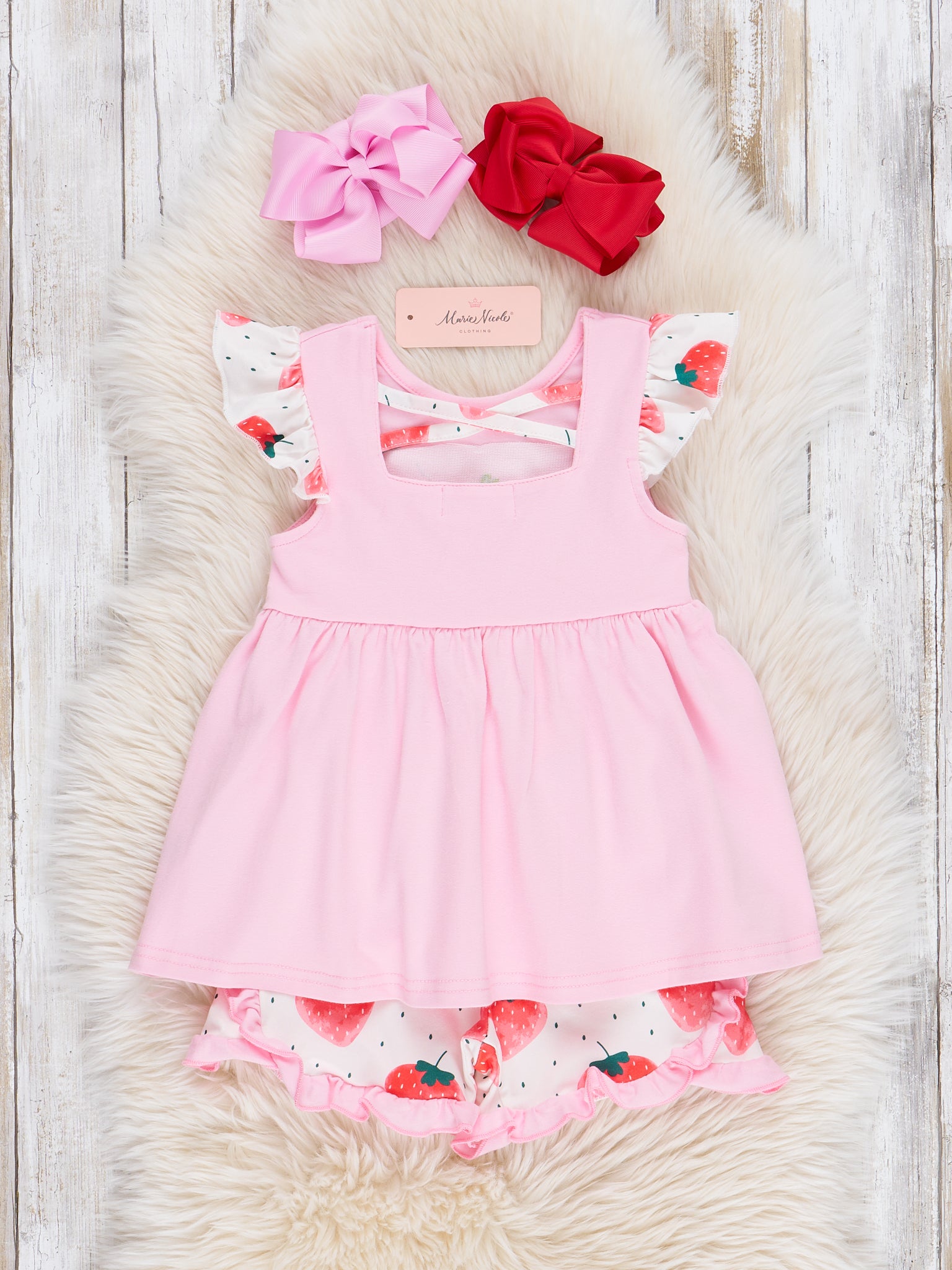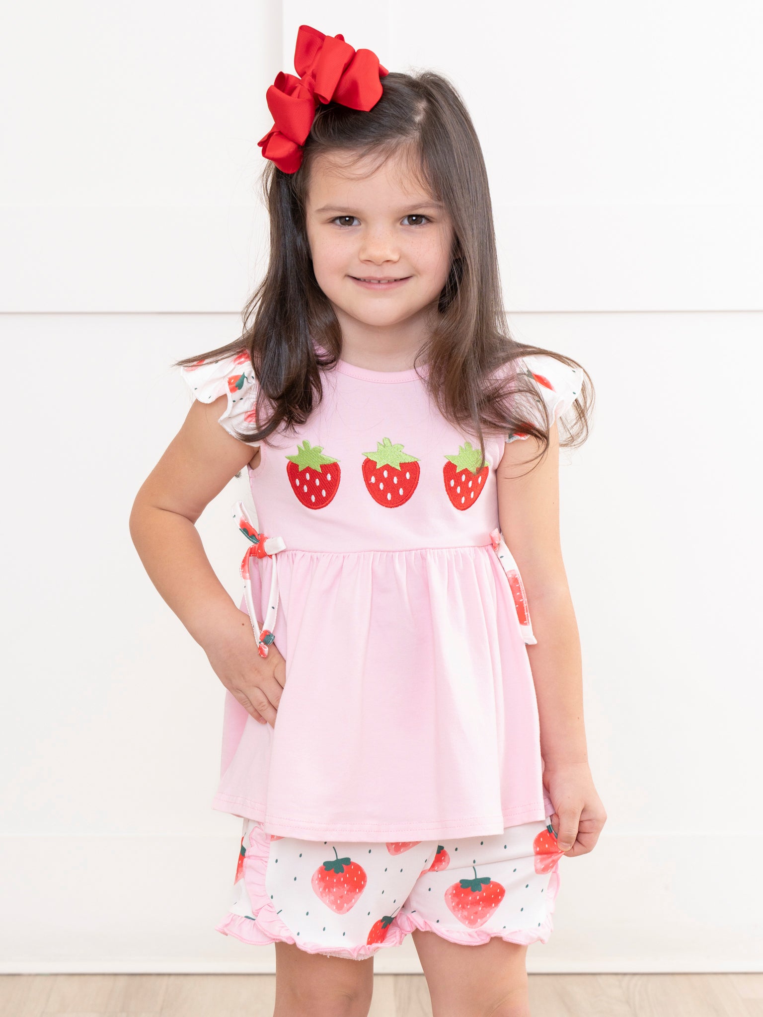 Add some sweetness to your little ones' wardrobe with this sister set by Marie Nicole Clothing! The outfit features embroidered strawberries and adorable ruffle shorts that will make your child look as cute as a berry! 🍓 The ruffle sleeves add an extra touch of charm to this playful outfit.