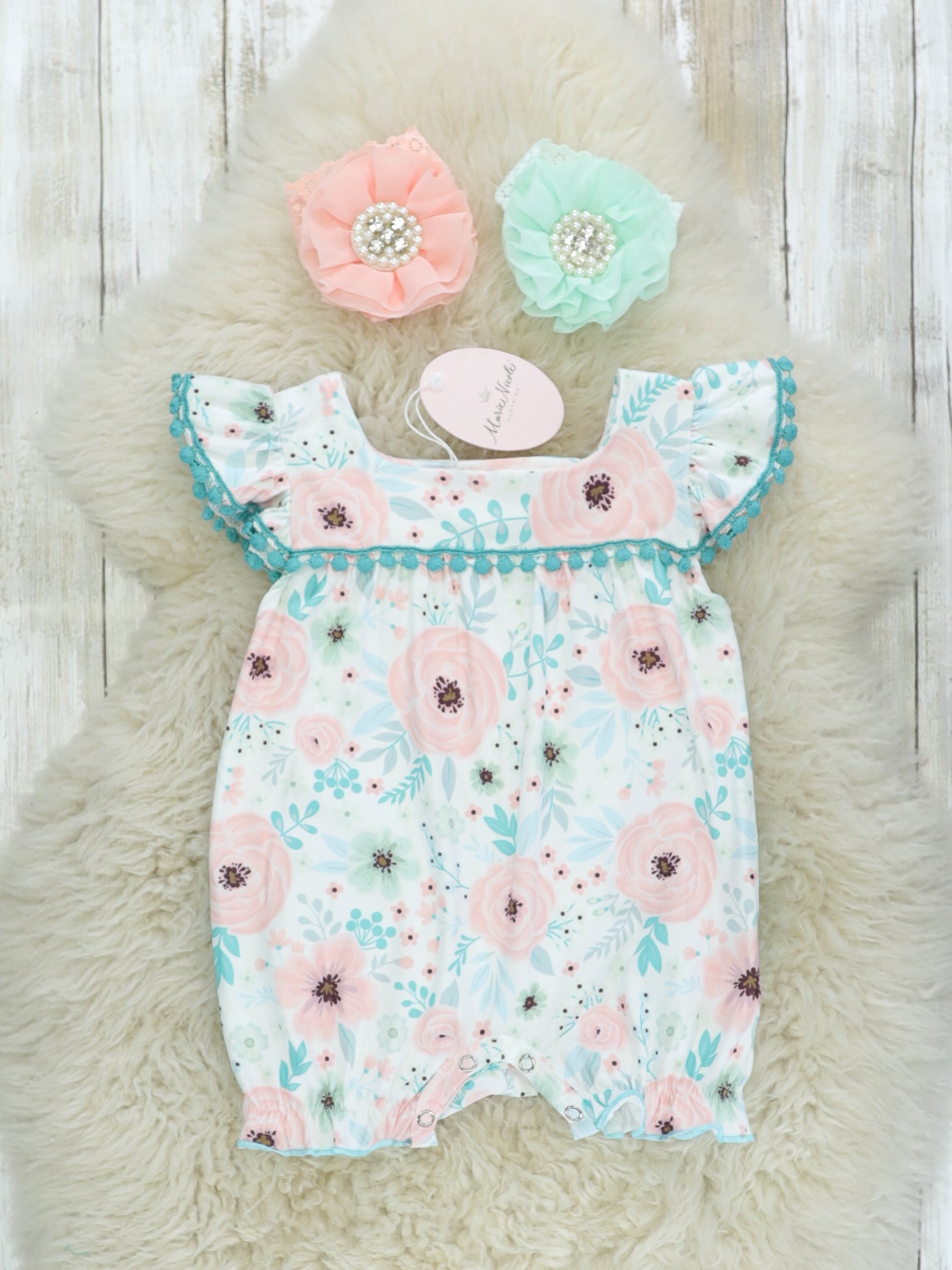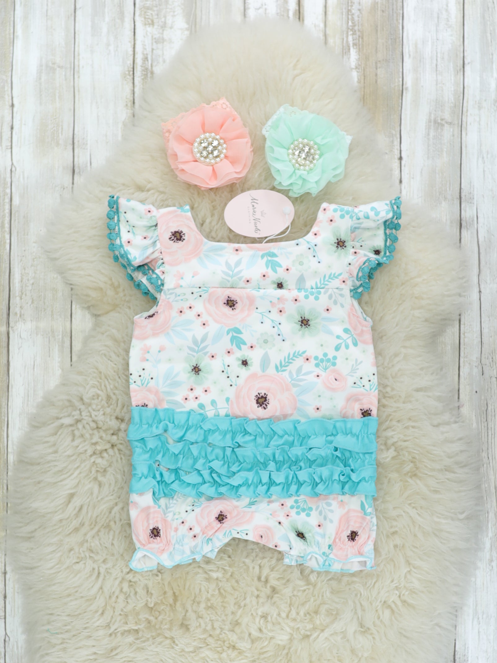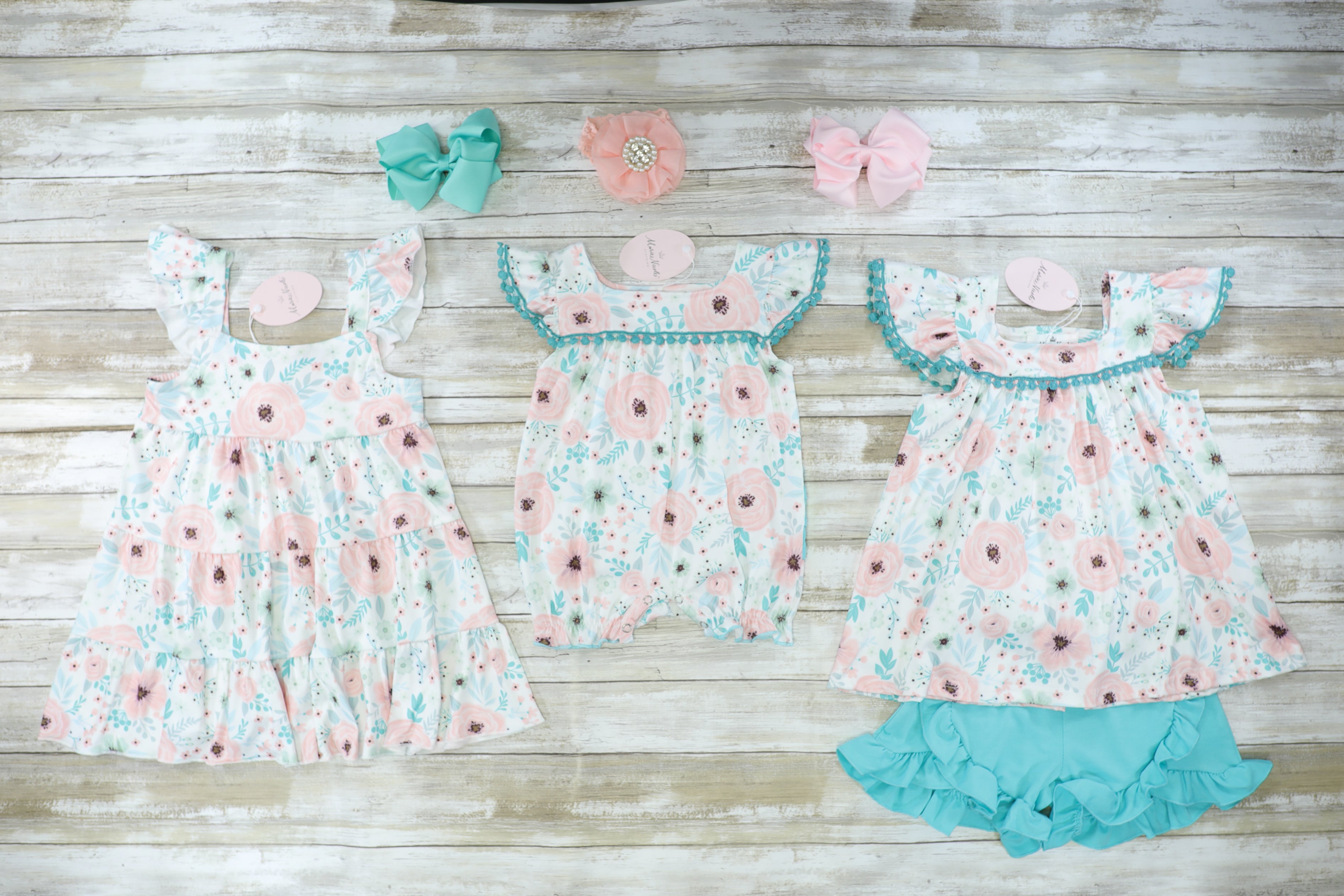 We love all of the muted colors in this beautiful sister set! This romper features the prettiest floral pattern, blue detailing, & a ruffle butt!