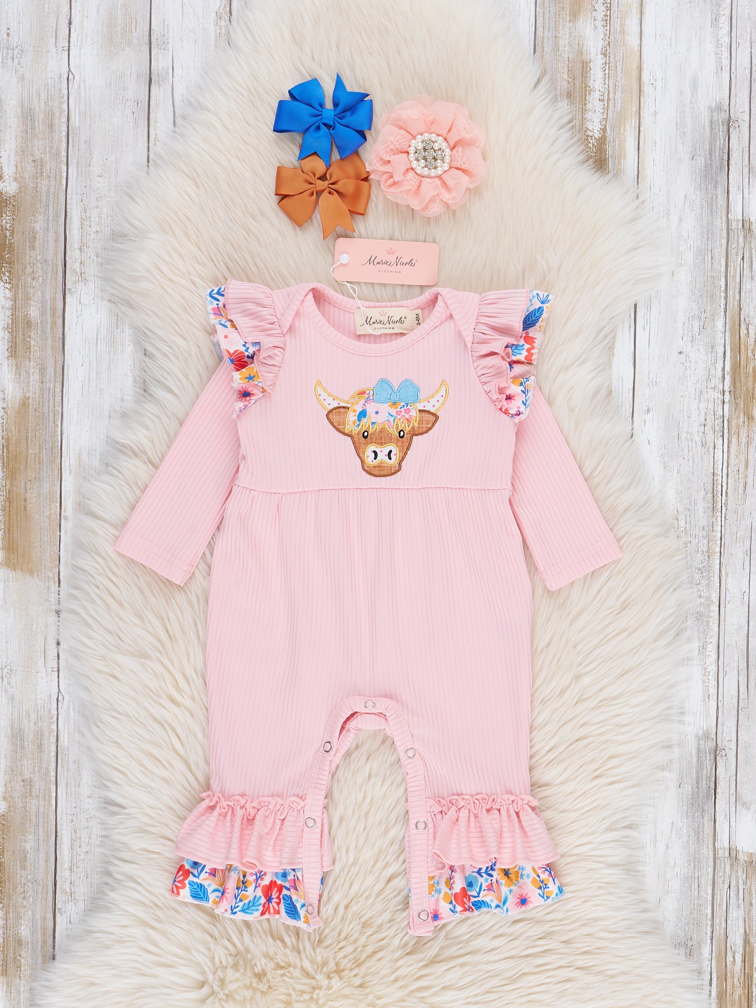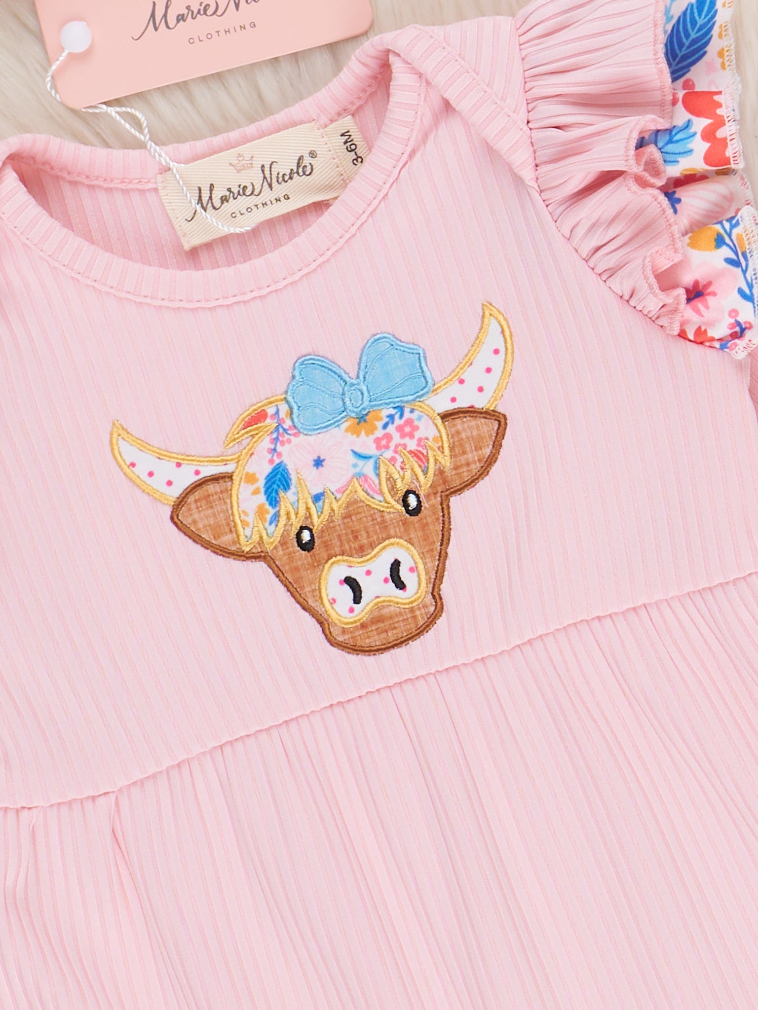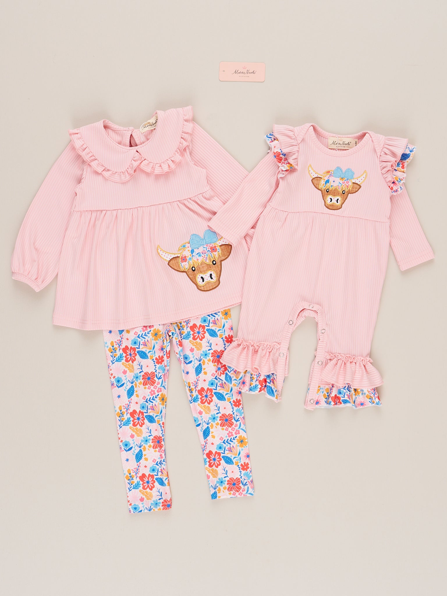 This darling sister set is a MOO-ing good time! This romper features a pink bodice with quirky embroidered cow detail, adorned with sweet floral ruffle details. Perfect for your little fashionista, this outfit combines fun and floral with a touch of cow-inspired charm. Yee-haw!