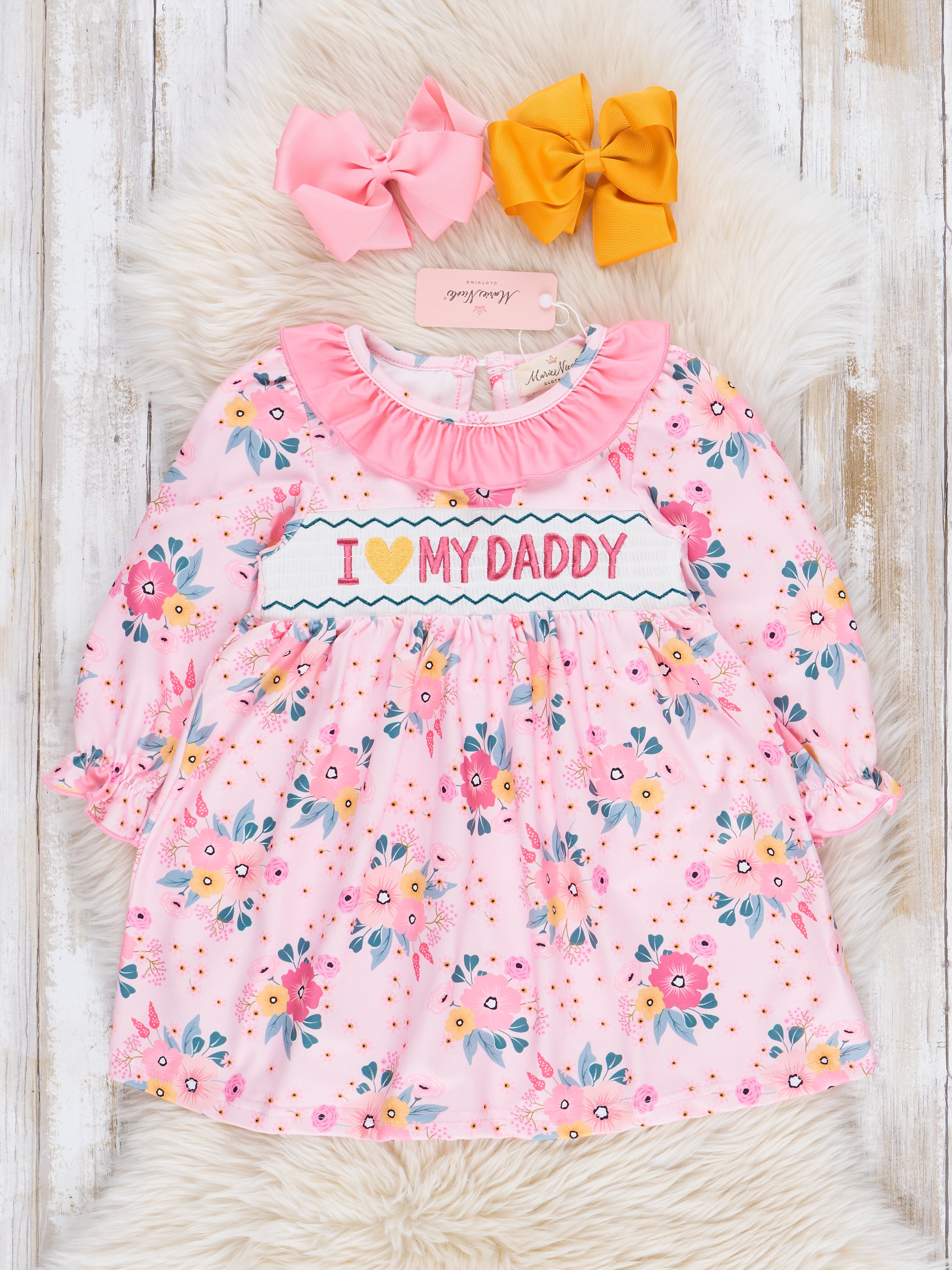 Get ready to melt hearts with our Pink Floral Smocked Dad Love Dress! Perfect for your little girl, this dress features delicate embroidery of "I ❤️ Daddy" over classic smocking. The adorable ruffle collar adds a sweet touch. Show off your family love in style with this sibling set!