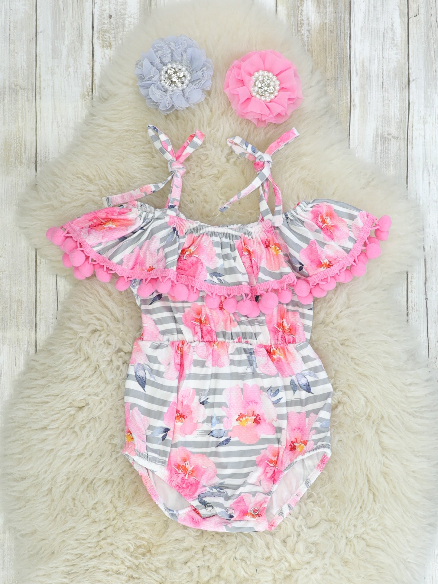 Pretty in pink in this fun floral striped sister set! Featuring tie straps, floral and striped pattern and pom pom trim.