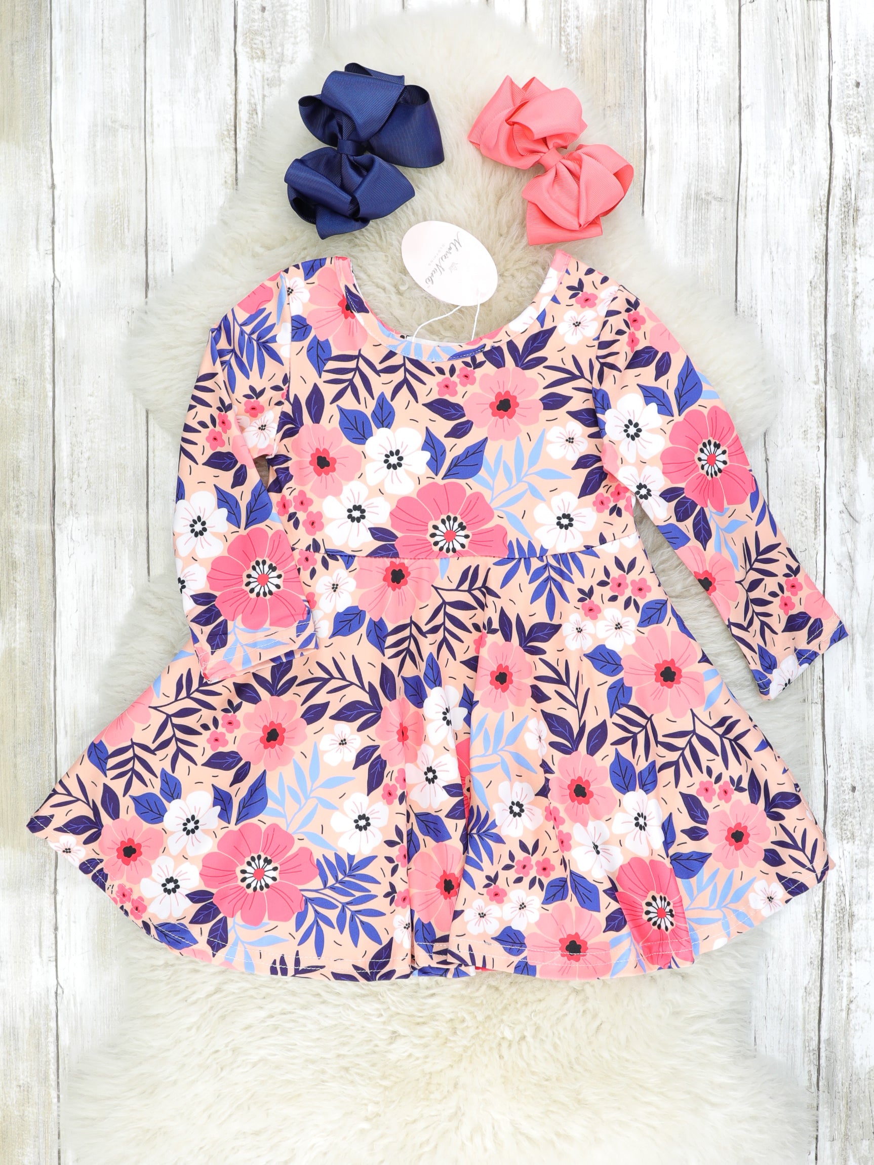This vibrant dress is perfect for your bright girls! This pink dress features stunning florals & is so comfortable for every day wear!