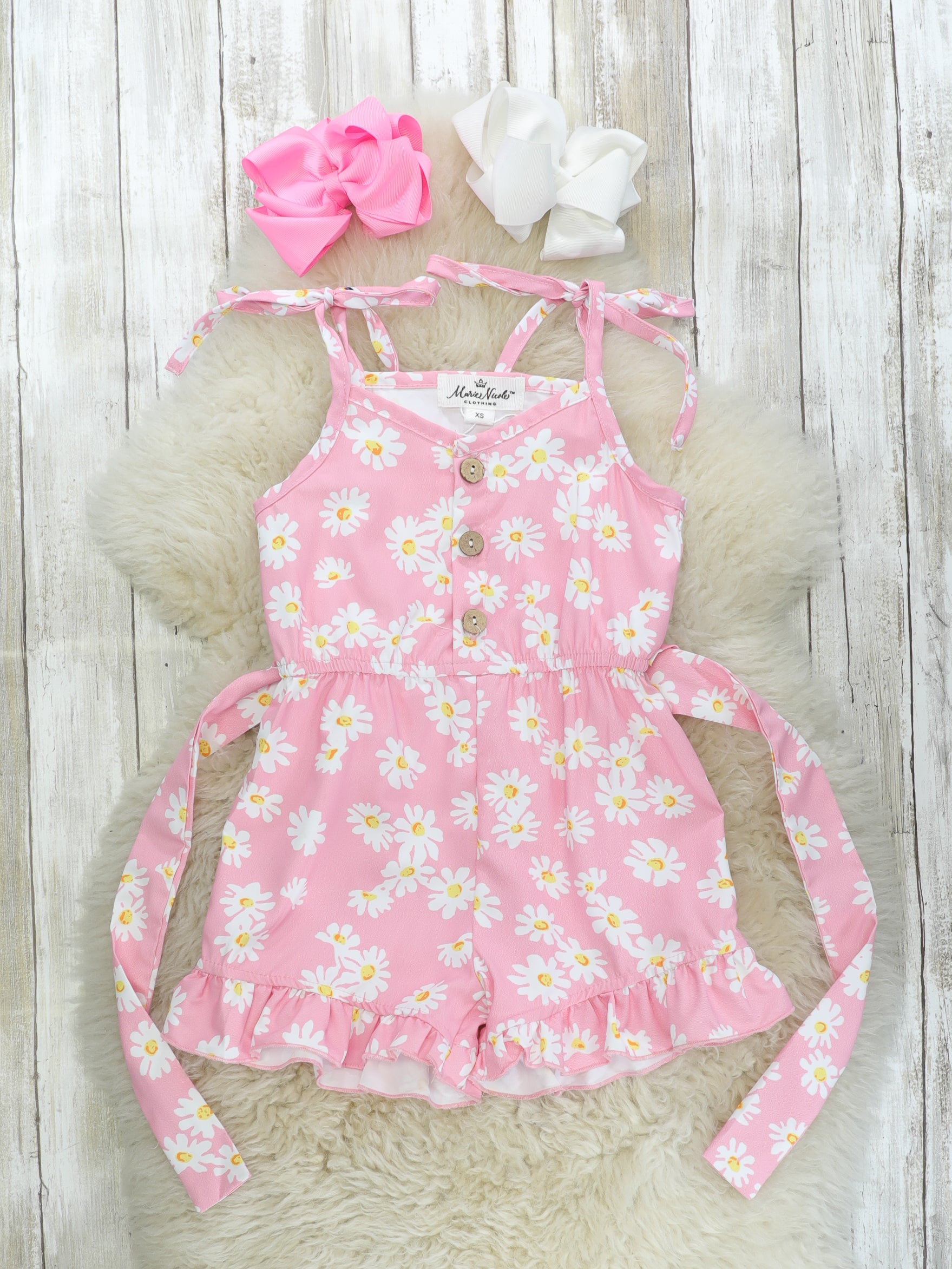 Have a Summer of fun in this adorable romper! It feature adjustable tie shoulder straps, buttons, ruffle trim on the legs, & an adjustable removable tie around the waist.